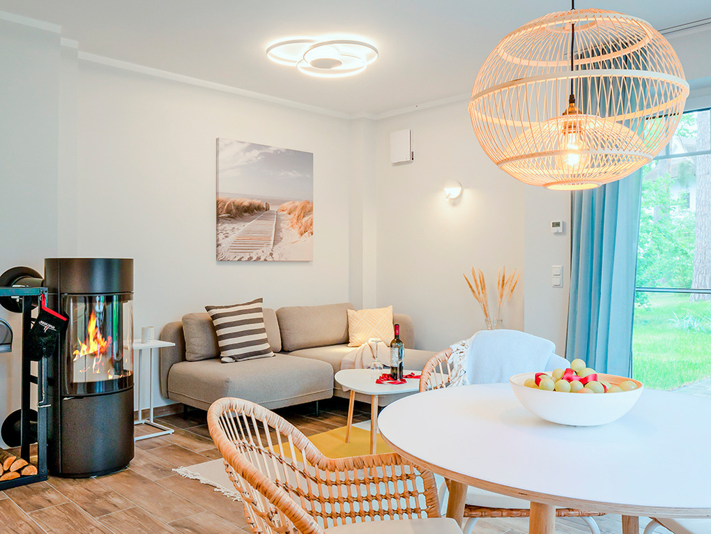 Ort: Zirchow. Idyllische Lage am Hochufer des Stettiner Haffs (300 m). Hangar10 mit Flugzeugausstellung, Flugsimulator, Kinderspielgeräten und Restaurant 500 m. Zirchow mit Geschäften 2,5 km. Schöner Sandstrand bei Kamminke 3,9 km zu Fuß oder mit dem Fahrrad. Ostseebad Ahlbeck 8 km.