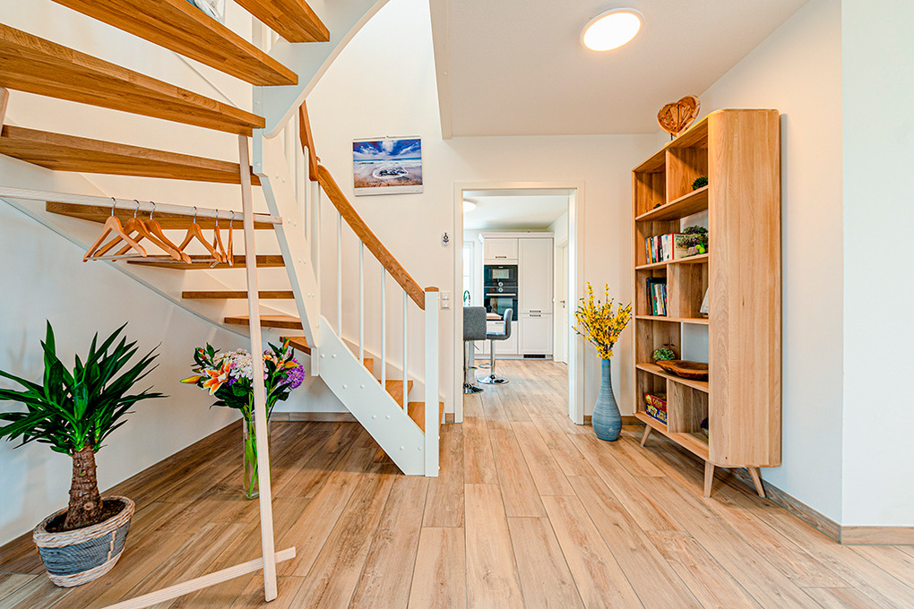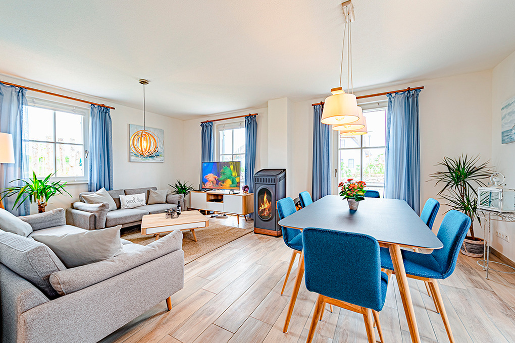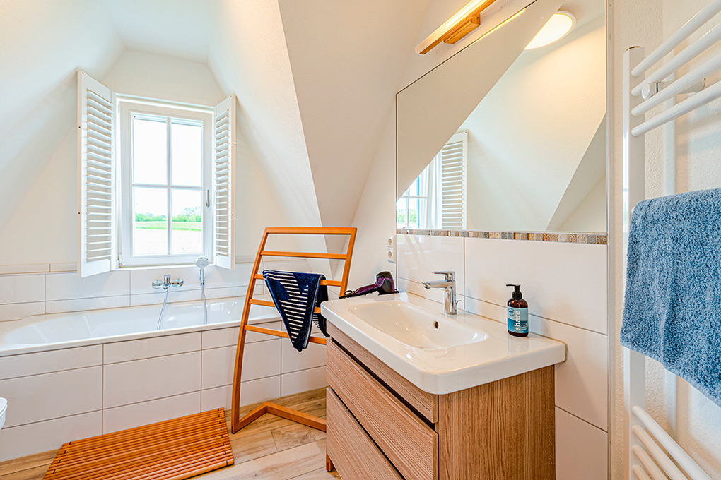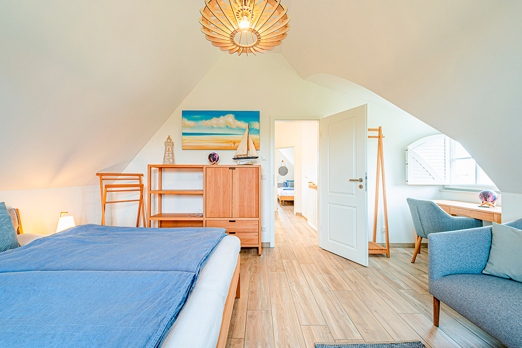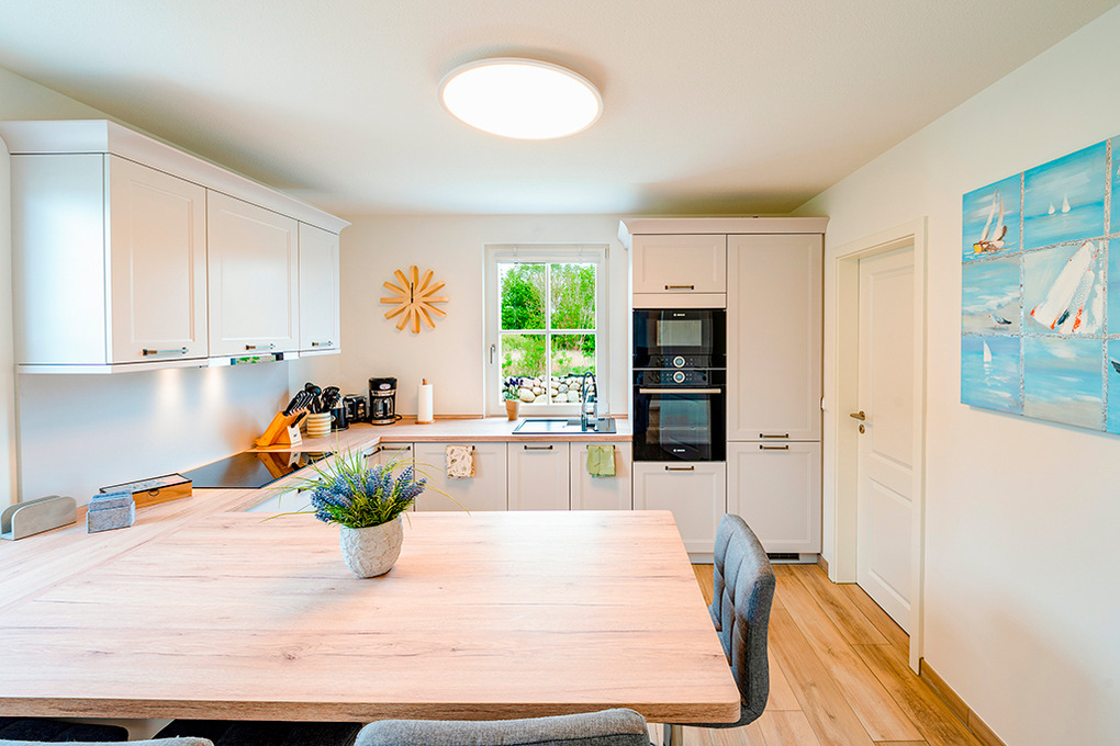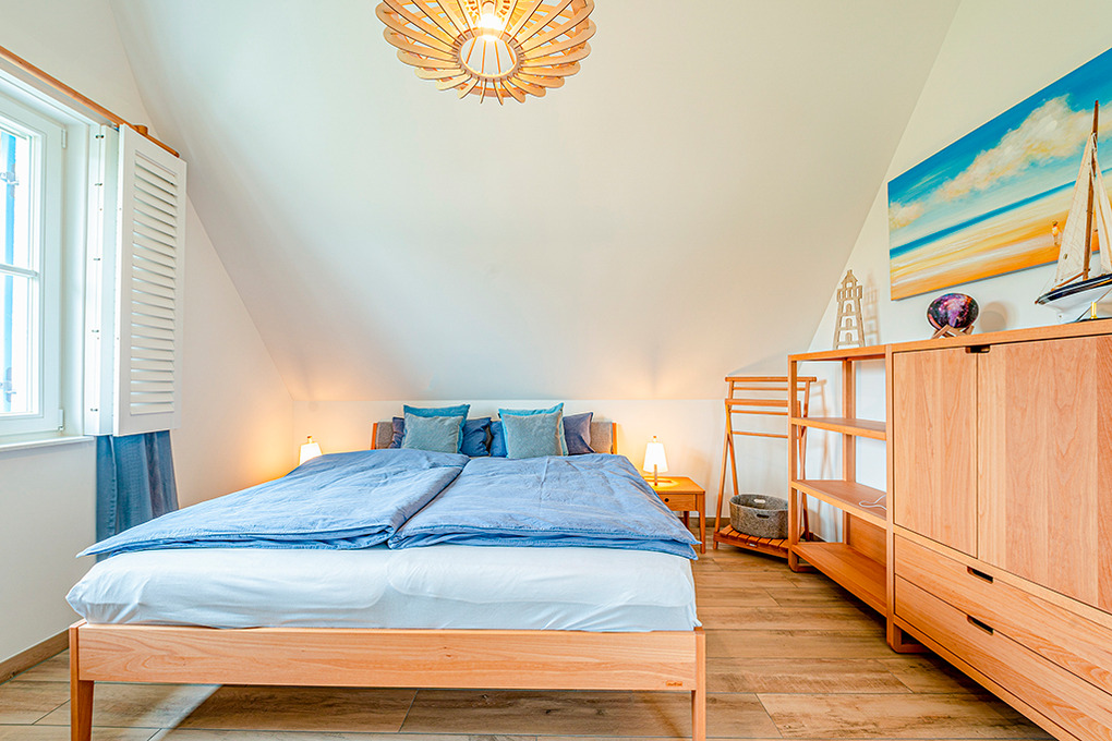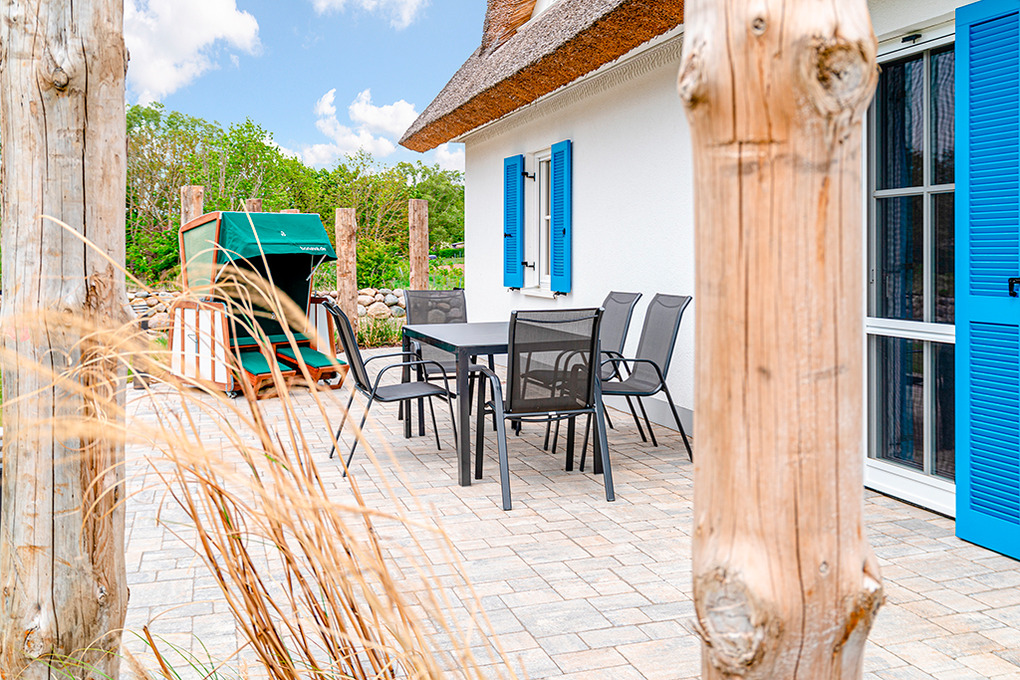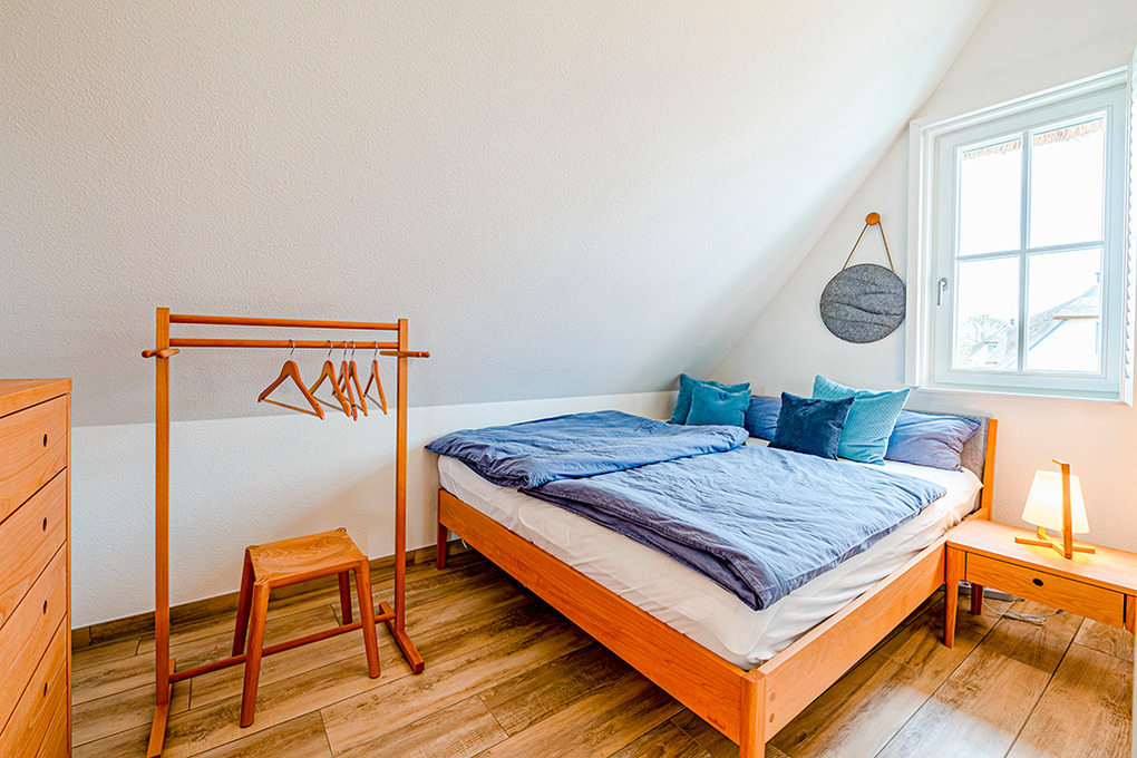 Haus: Ökologisches Reetdachhaus mit Sauna und Kaminofen, 2020 neu erbaut. Schöner Wasserblick aus der 2. Häuserreihe. Bei der Einrichtung wurde bewusst auf ein ökologisches Konzept gesetzt: alle Schlafzimmer sind mit metallfreien Bioholzmöbeln ausgestattet. Weitere nachhaltige Stoffe wie Bio-Gardinen und Bio Teppiche runden die moderne und exklusive Einrichtung ab. Nichtraucherhaus. Kostenloser Internetzugang (W-Lan). Fußbodenheizung. Waschmaschine. Terrasse mit Sitzmöbeln, Strandkorb, Grill. 2 Pkw-Stellplätze am Haus.