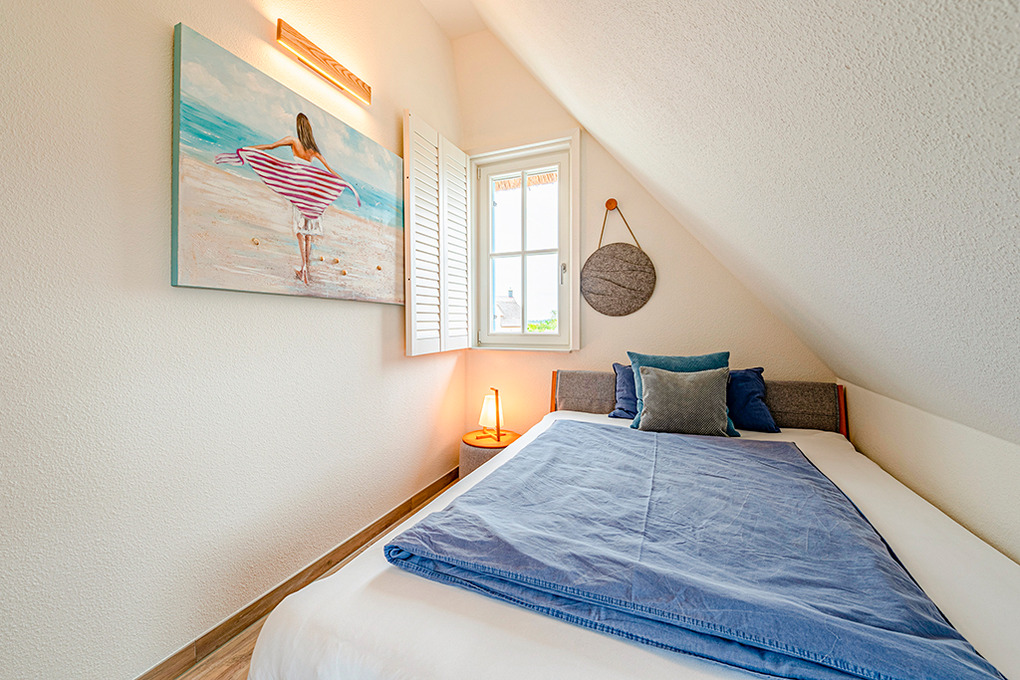 D 43.14 Ferienhaus 2-6 Pers.: Komfortables 4 1/2-Zimmerhaus mit 134 qm Wohnfläche über 2 Etagen. Parterre: Ansprechender Wohn-/Essraum mit Kaminofen, Couchgarnitur, Sat-TV, DVD, Esstisch. Separate Küche mit sehr gut ausgestatteter Einbauküche (Backofen, Mikrowelle, Spülmaschine). Bad mit Sauna, Dusche, Waschbecken, WC. 1. Etage: Geräumiges Doppelzimmer mit Doppelbett und Couchecke. Zwei weitere Doppelzimmer mit franz. Bett (1,40 x 2,00 m und 1,60 x 2,00 m). Bad mit Badewanne, Dusche, Wb, WC.