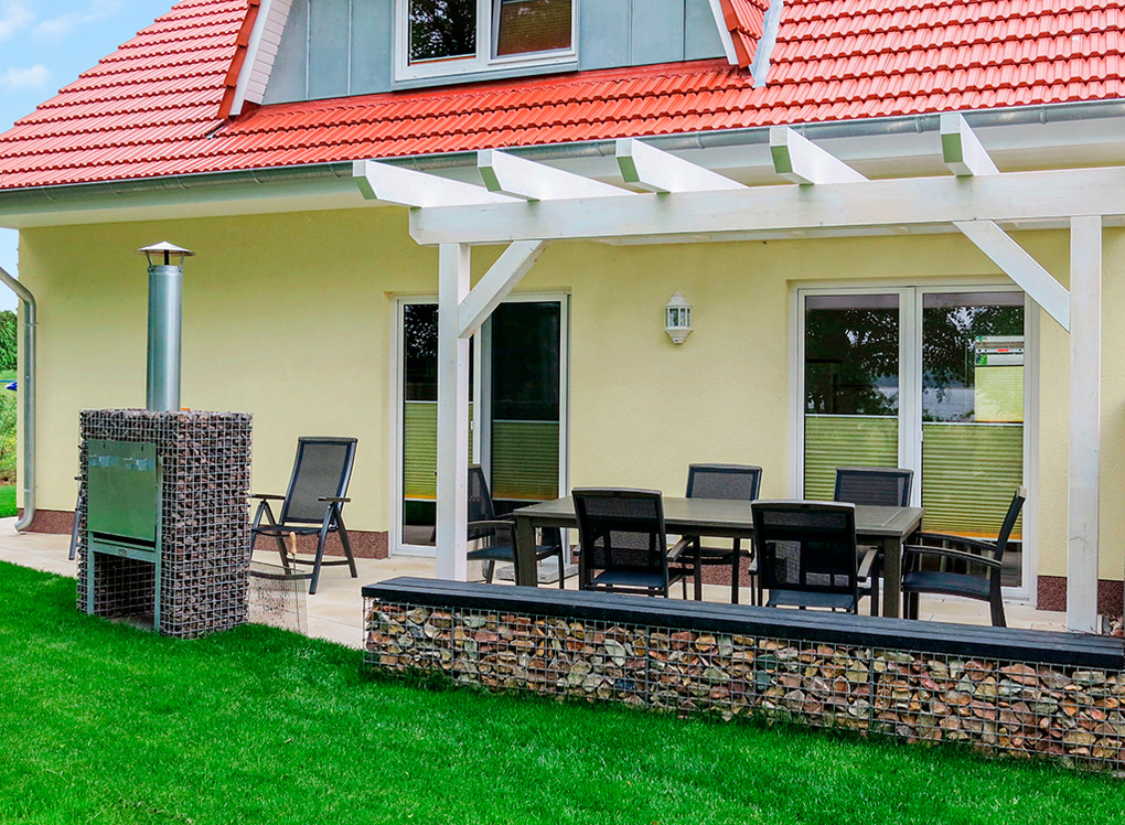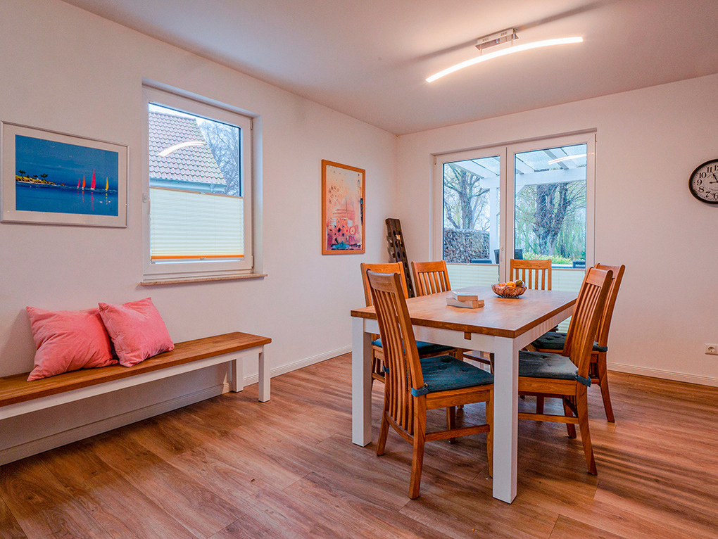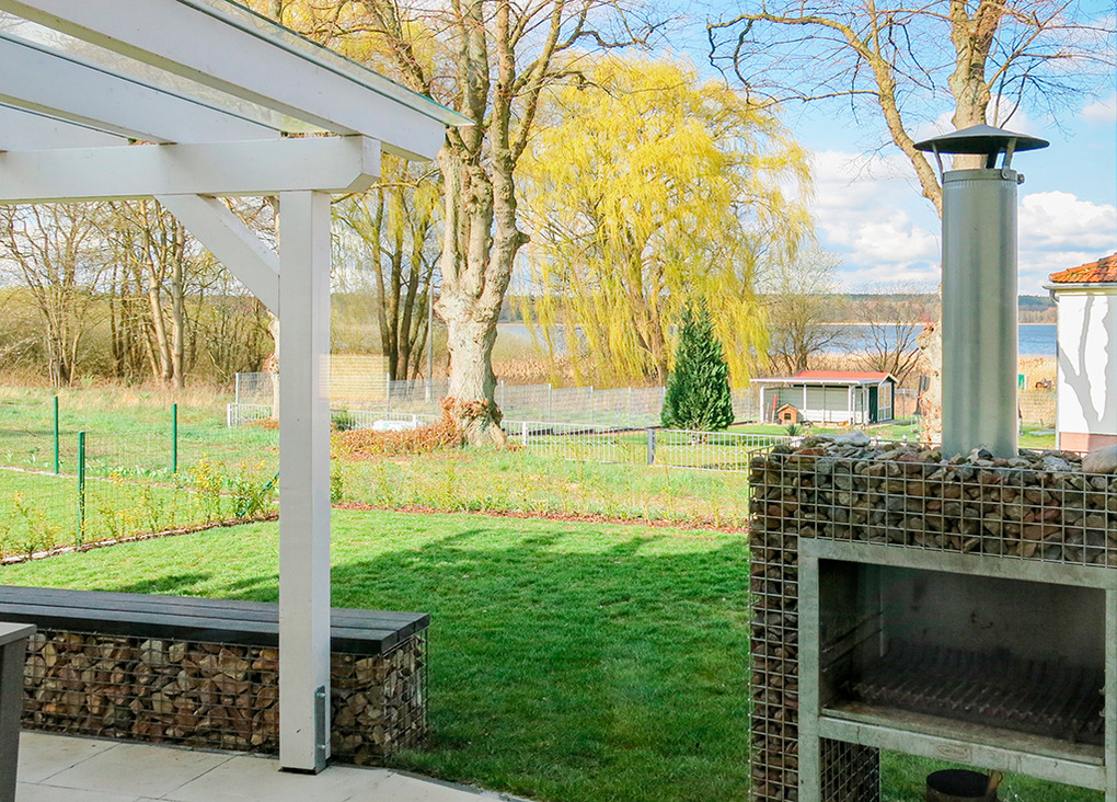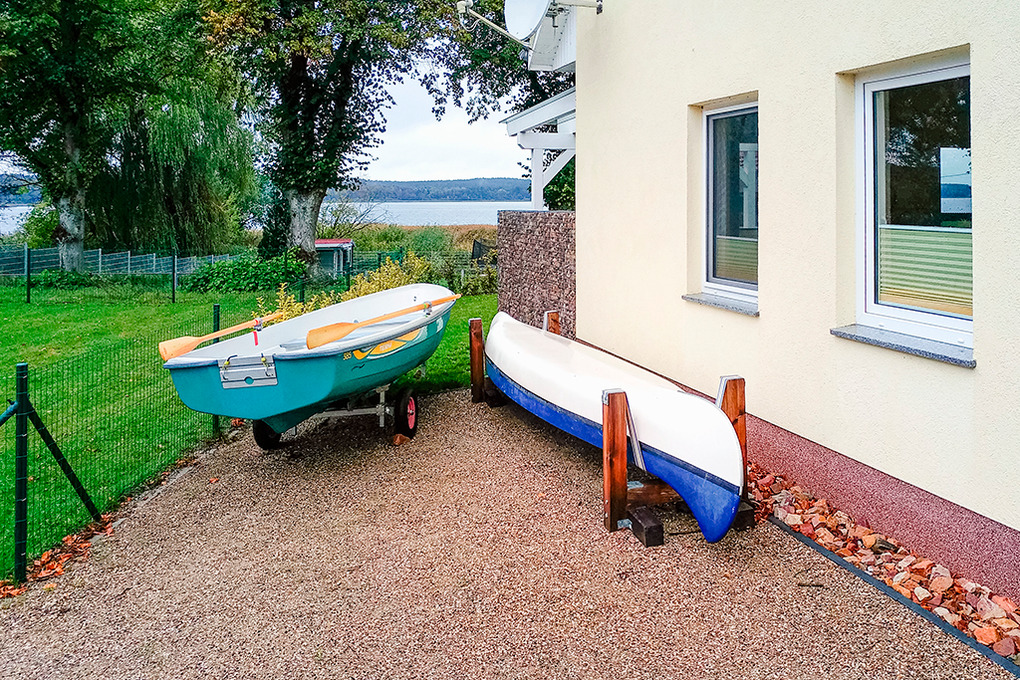 Haus: Komfortables Ferienhaus mit Seeblick. Geschmackvolle, moderne Einrichtung. 3 Schlafräume, 2 Bäder. Internetzugang. Waschmaschine. Fußbodenheizung. Nichtraucherhaus. Große überdachte Terrasse (Sitzmöbel) mit schönem Wasserblick durch die Uferbegrünung. Großzügiger Garten mit Grillkamin, Rasenfläche, Liegestühlen. 2 Pkw-Stellplätze. Ein Ruderboot, ein Dreier- und ein Vierer-Kanadier vorhanden (kostenfrei nutzbar auf eigene Gefahr).