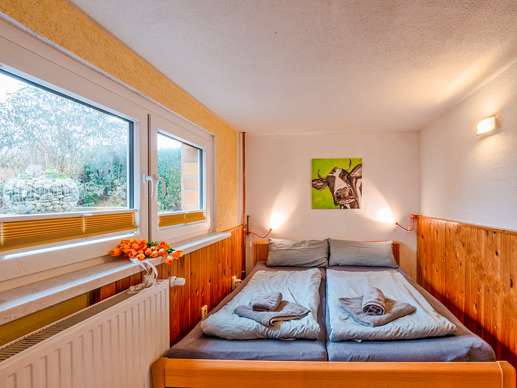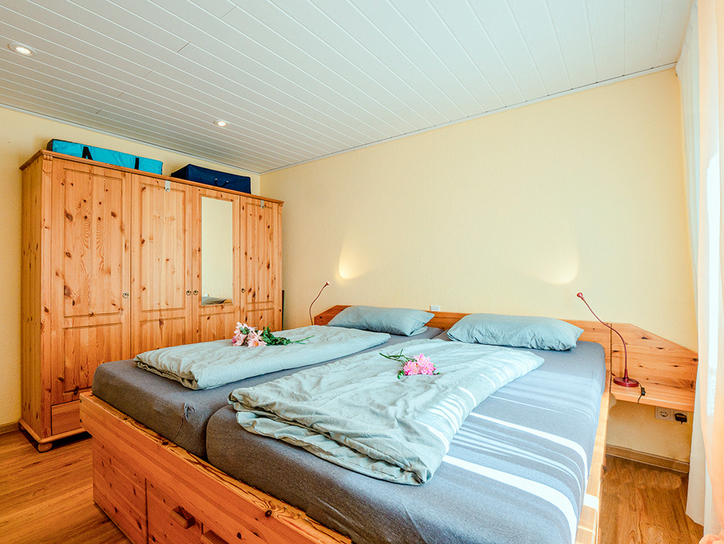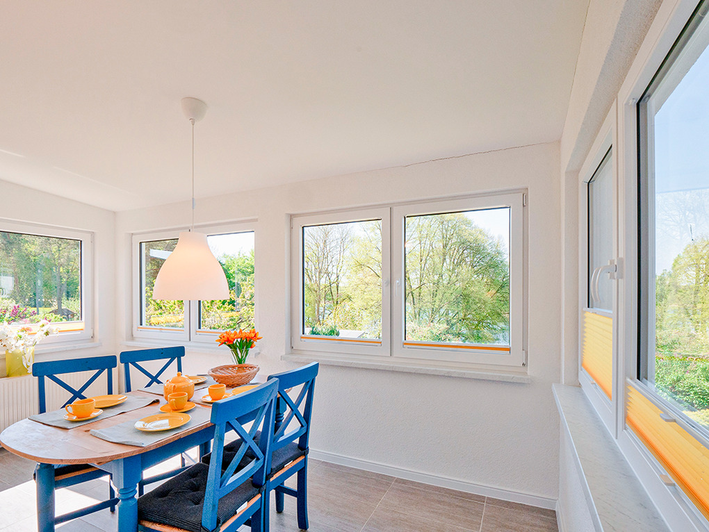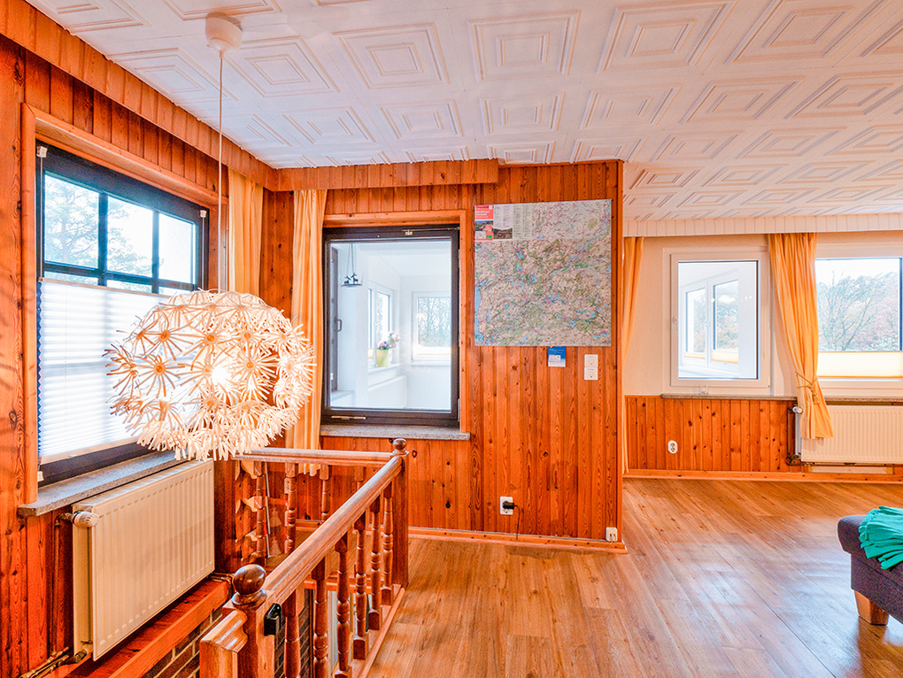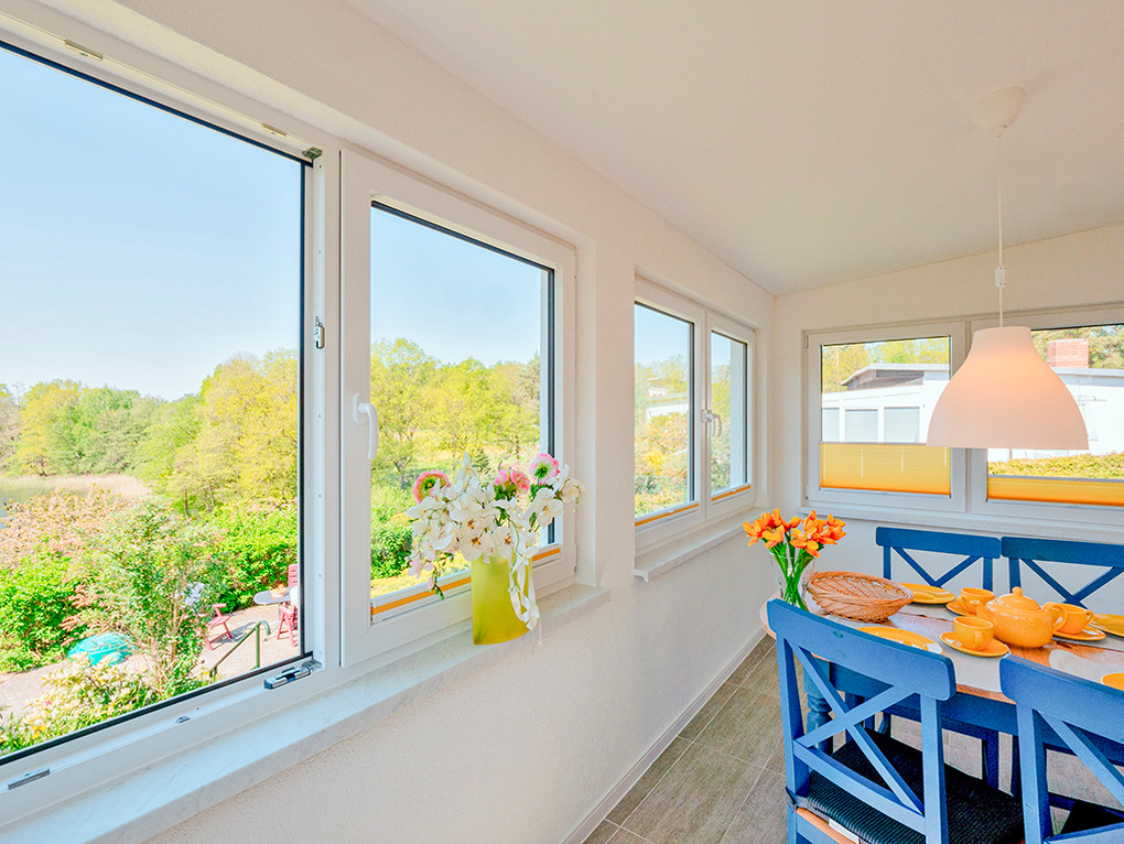 D 45.350 Ferienhaus 2-4 Pers.: 5-Zimmerhaus mit 95 qm Wohnfläche über 2 Etagen. Hochparterre (Hanglage): Schöner Wohnraum mit Sofa-Sitzecke, Sat-TV, DVD, Radio/CD. Heller Wintergarten mit Panoramafenstern, Wasserblick durch die Uferbegrünung, Esstisch. Küche mit Backofen, Mikrowelle, Spülmaschine. Weiterer kleiner Essraum mit Eckbank, Esstisch. Doppelzimmer. Bad: Du, Wb, WC. Tiefparterre: Kleines Doppelzimmer mit franz. Bett.