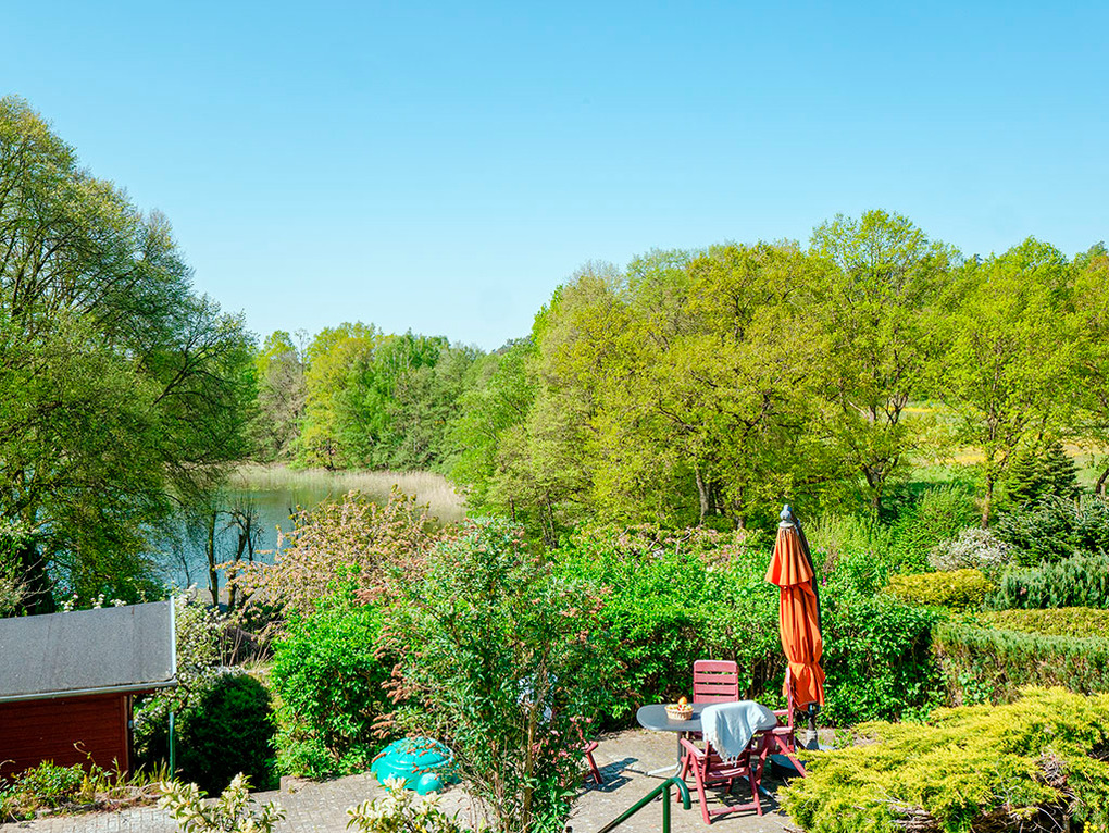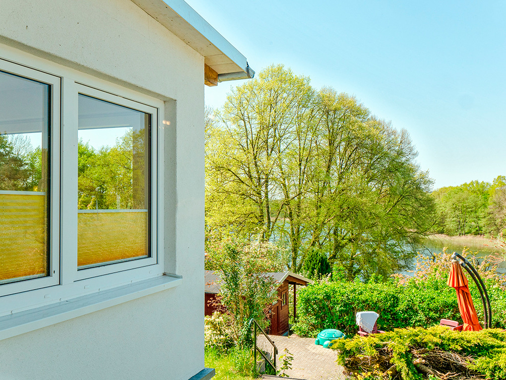 Ort: Mustin bei Sternberg, Mecklenburgische Seenplatte. Ruhige Lage auf einem 855 qm großen Gartengrundstück direkt am idyllischen Scharbowsee (35 m). Seezugang vom Garten mit seinem alten Baumbestand. Schmaler Bootssteg, eigenes Ruderboot. Glammsee mit Badesteg, kleinem Bootshaus, weiterem Angelboot nur 300 m. Witzig mit Restaurant 3,5 km. Sternberg mit Restaurants, Geschäften 10 km.