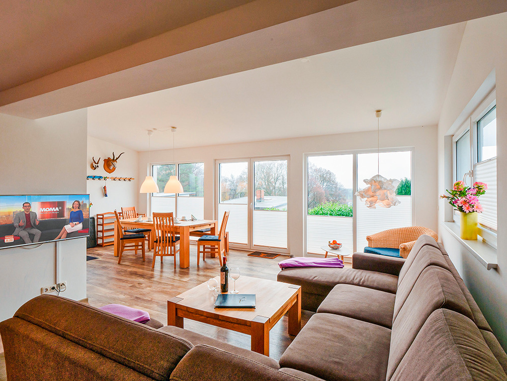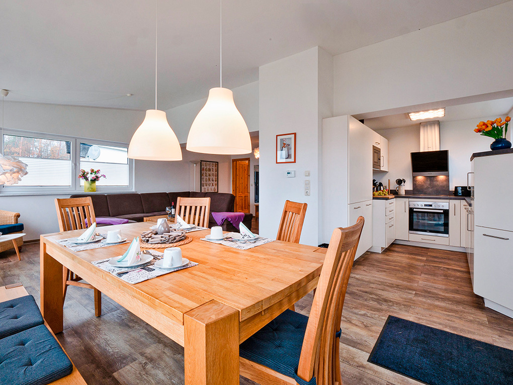 D 45.351 Ferienhaus 2-4 Pers.: 3-Zimmerhaus mit 85 qm Wohnfläche. Schöner Wohn-/Essraum mit großer Panoramafensterfront, Seeblick, Sofa-Sitzecke, Sat-TV, DVD, Radio/CD, Esstisch, Einbauküche (Backofen, Mikrowelle, Spülmaschine). Zwei Doppelzimmer. Bad: Du, Wb, WC.