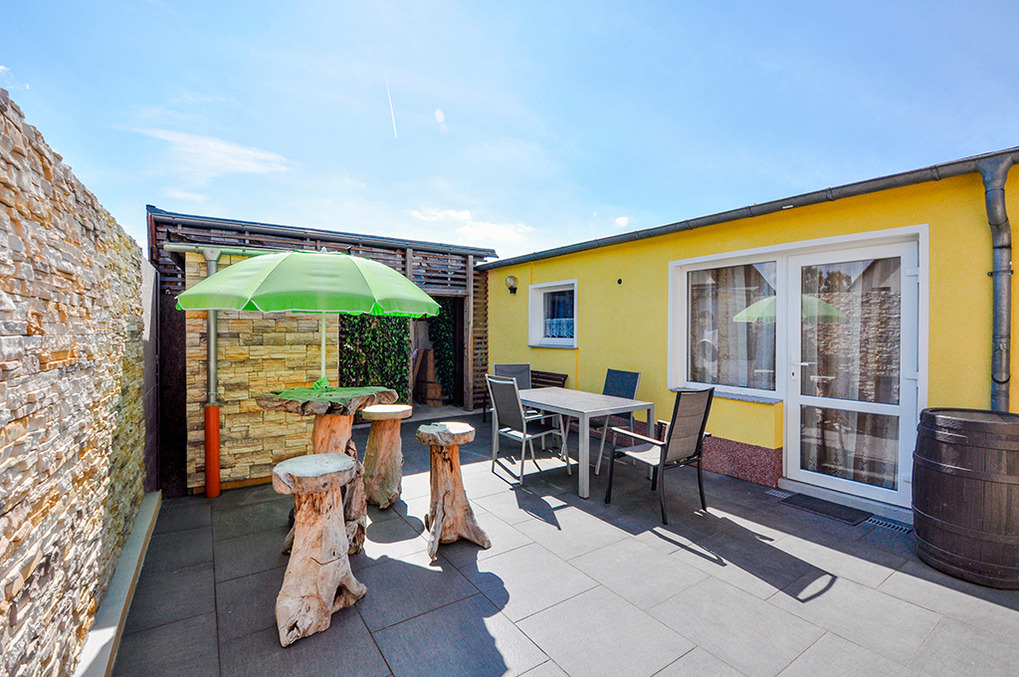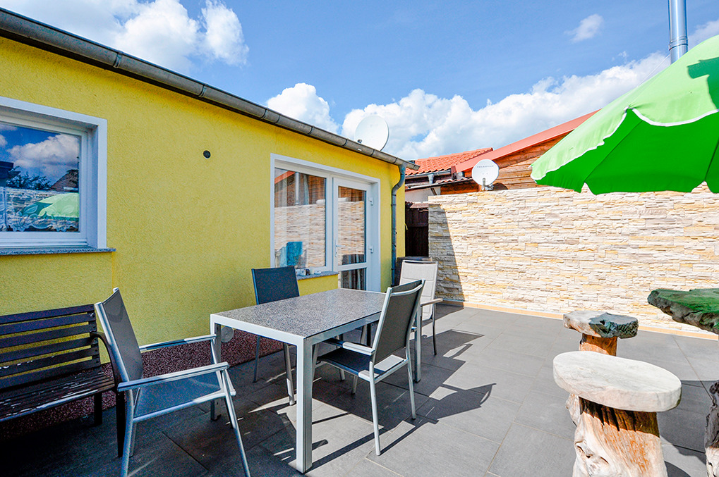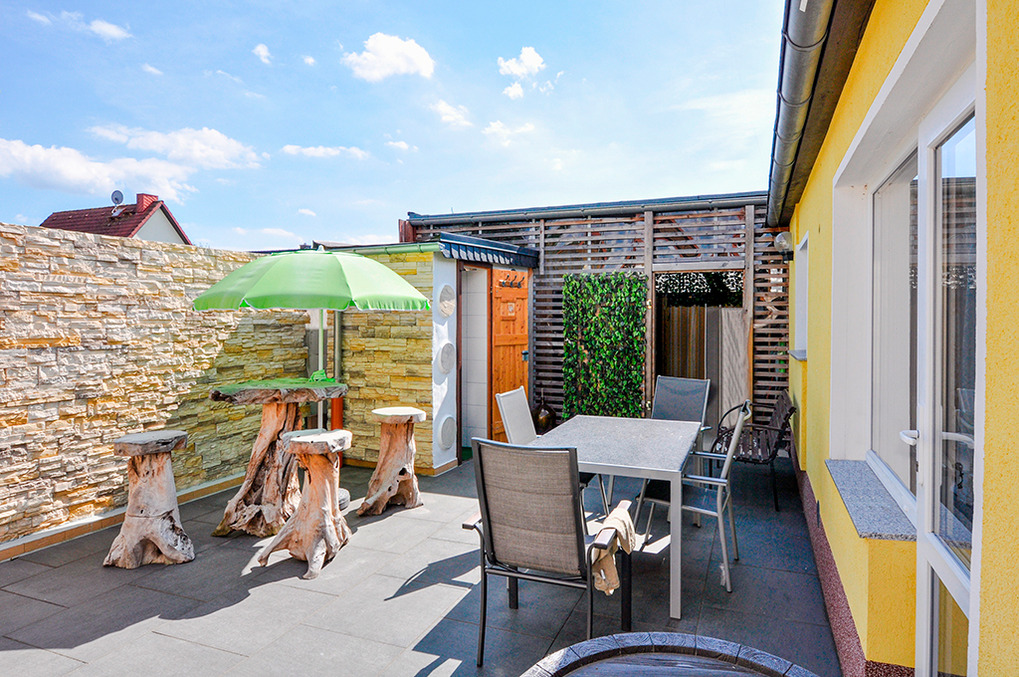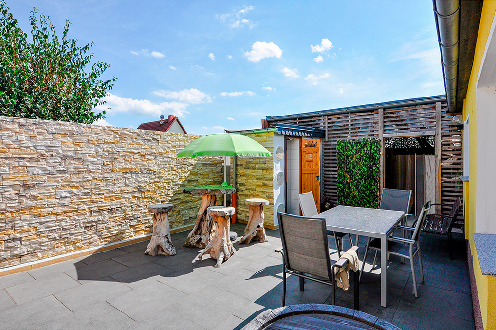 Haus: Schöner Bungalow mit Sauna. Freundliche Einrichtung, ansprechendes Ambiente durch Holzvertäfelungen. Kostenloser Internetzugang über W-Lan. E-Heizung. 2 liebevoll gestaltete Terrassen mit Sitzmöbeln, Grill, Sauna (Nutzung gegen Gebühr). Pkw-Stellplatz am Haus.