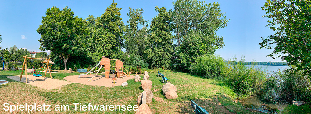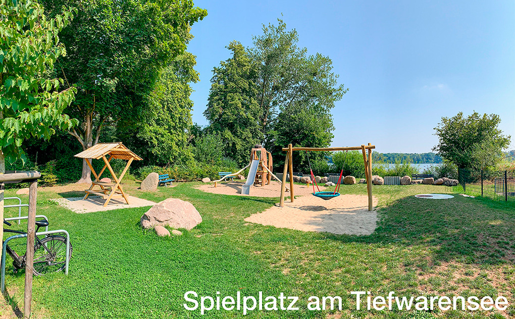 Ort: Waren (Müritz). Ruhige Lage am Tiefwarensee. Badestelle, schöner Spielplatz jeweils nur 250 m. Radwege 100 m. Ortsmitte mit Hafen, Geschäften, Restaurants 2 km. Öffentliches Freibad mit Sandstrand, Wasserrutsche, Liegewiese, Beachvolleyball 2,4 km.