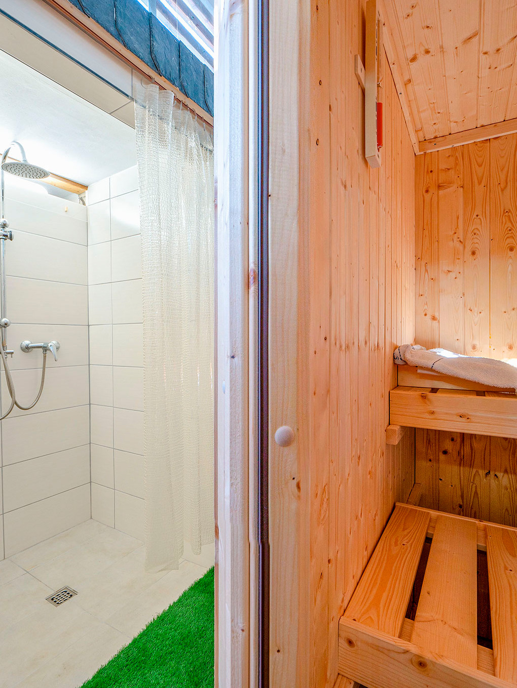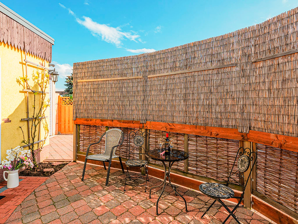 D 46.24 Ferienhaus 2-4 Pers.: Gemütliches 2-Zimmerhaus mit 34 qm Wohnfläche. Wohn- /Schlafraum mit Couchgarnitur (Ausziehcouch 2 Pers.), Flachbild-Sat-TV, Sitzgelegenheit, kleiner Küchenzeile, Dusche. Kleines 2-Bettzimmer. Bad: Wb, WC. Hübsch gestalteter Wellnessbereich mit Sauna, Dusche, WC, Sitz- und Liegemöbeln auf der Terrasse. Weitere Terrasse mit kleiner Sitzecke.