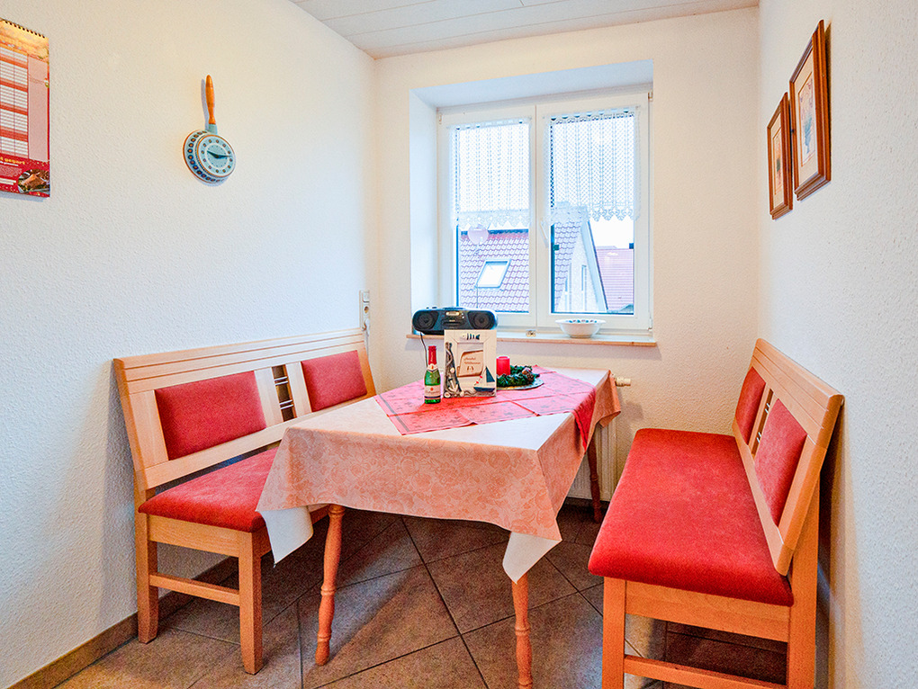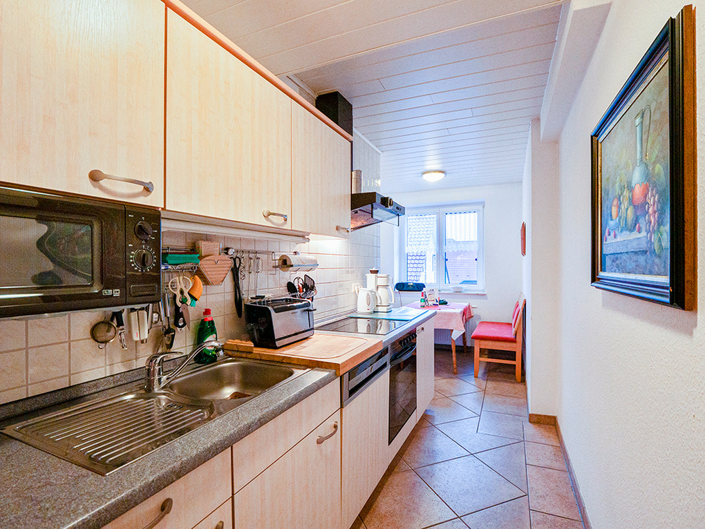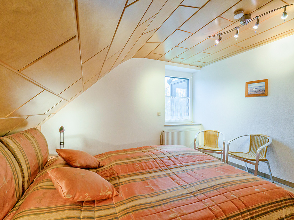D 46.64 Wohnung 2-3 Pers.: Großzügige 2 1/2-Zimmerwohnung mit 58 qm Wohnfläche, 1. Etage. Wohn-/Schlafraum mit Couchgarnitur, Sat-TV, Schrankbett (1 Pers.). Wohnküche mit Esstisch, gut ausgestatteter Küchenzeile (Backofen, Mikrowelle, Spülmaschine). Doppelzimmer. Bad/WC. Überdachter, verglaster Balkon mit Sitzmöbeln.