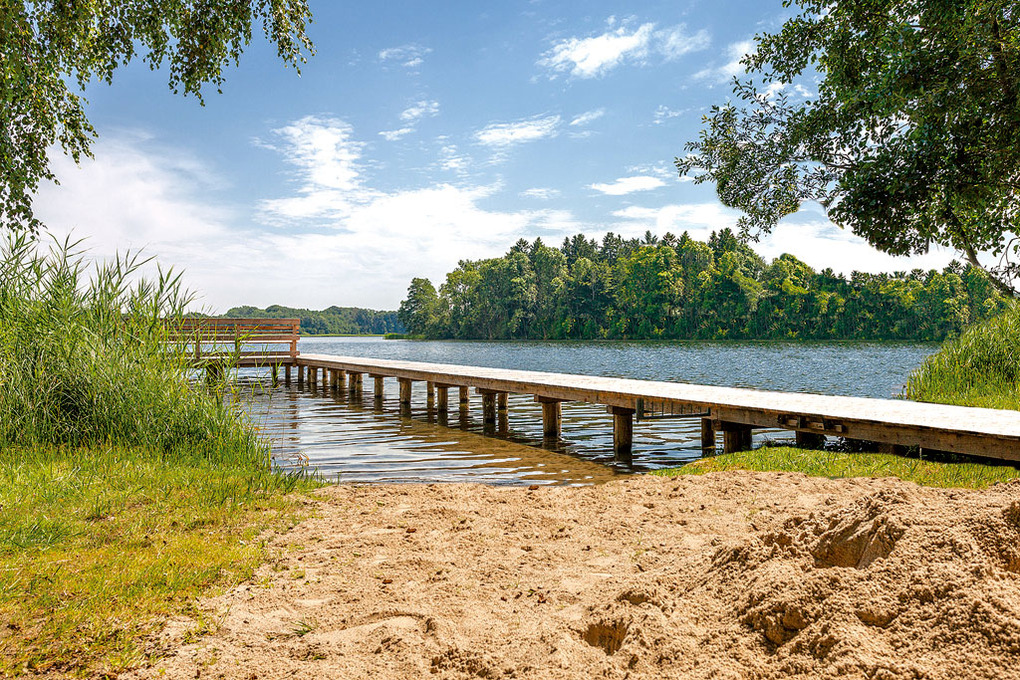 Ort: Krakow am See. Einzigartige, idyllische Lage direkt am Krakower See, auf naturbelassenem Grundstück mit altem Baumbestand. Zur Anlage gehörend: Badestelle mit Bootsteg (90 m), Kinderspielplatz. Ortsmitte mit Restaurants, Geschäften 1,9 km.
