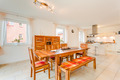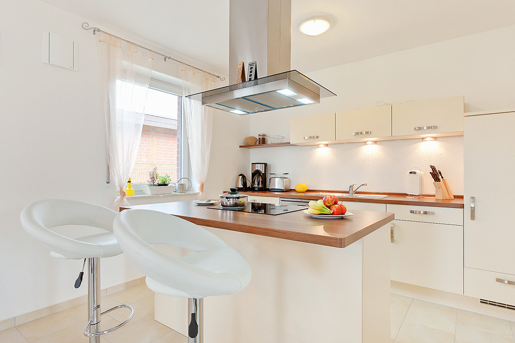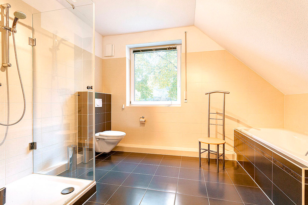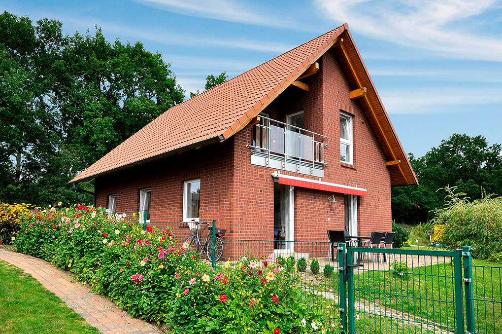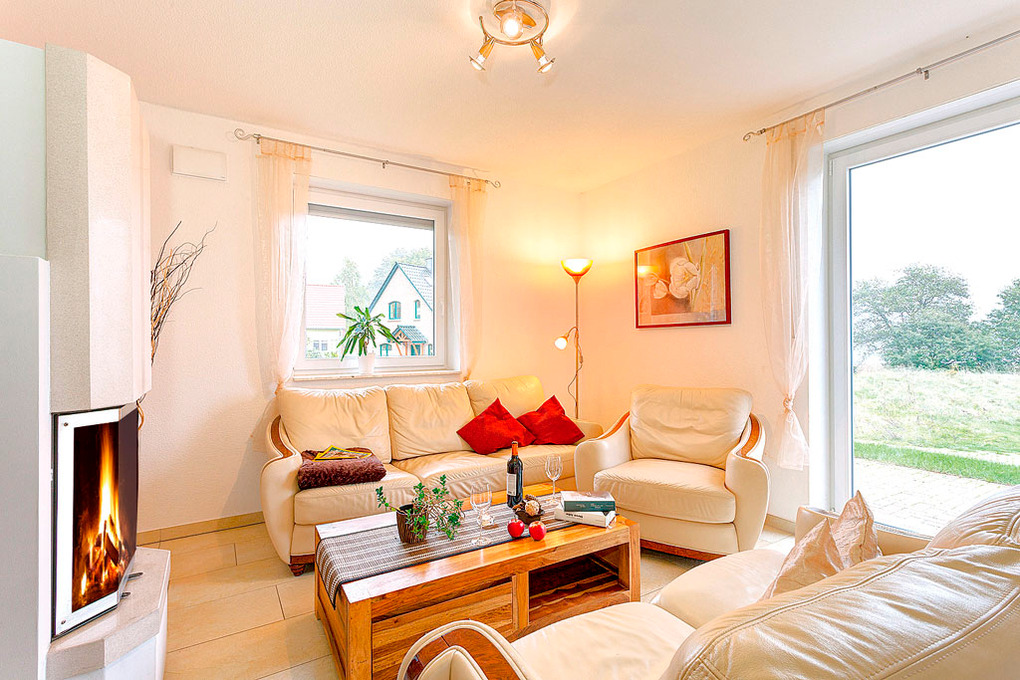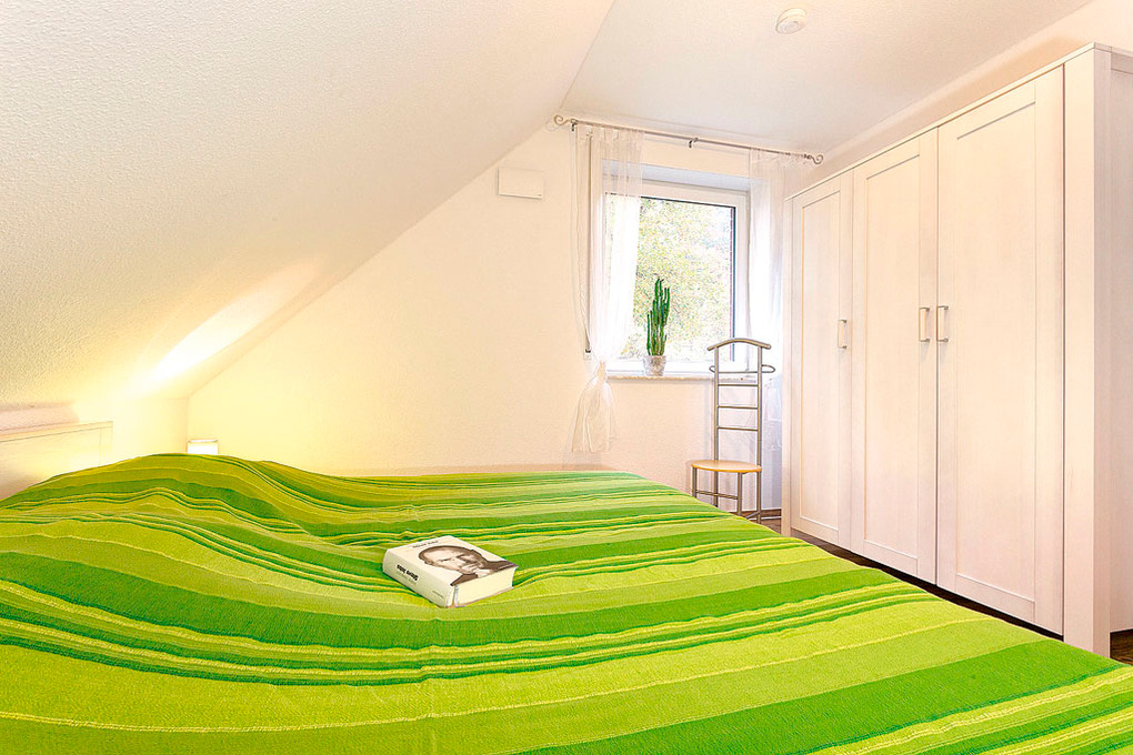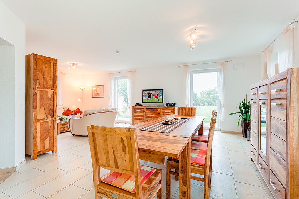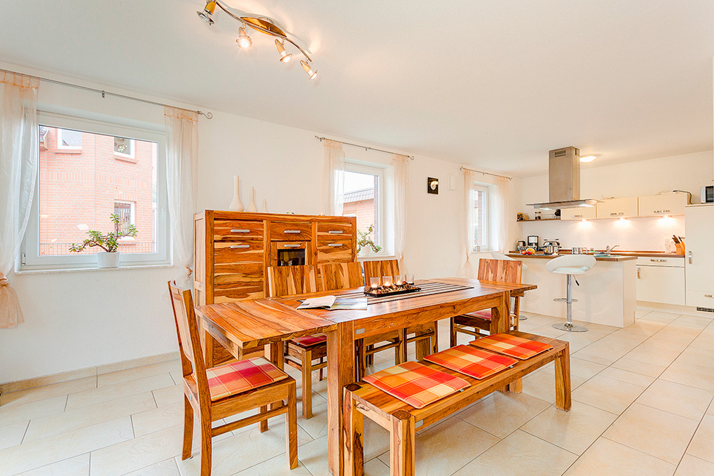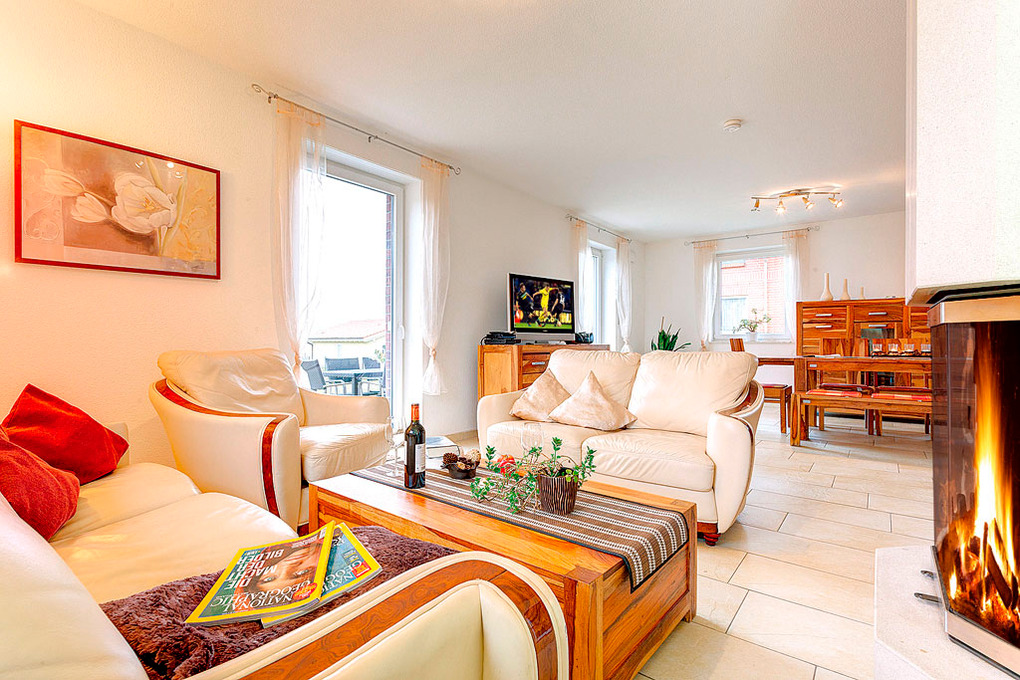 D 48.7 Ferienhaus 3-6 Pers.: Großzügiges 4-Zimmerhaus mit 127 qm Wohnfläche. Parterre: Freundlicher Wohn-/Essraum mit großem Platzangebot (37 qm), Kaminofen, Couchgarnitur, Sat-TV, Radio/CD, DVD, Esstisch, sehr gut ausgestatteter Küchenzeile (Backofen, Spülmaschine). Bad/WC. Abstellraum mit Waschmaschine. 1. Etage: Zwei Doppelzimmer (gemeinsamer Balkon). 2-Bettzimmer. Bad: Du, Bw, Wb, WC.