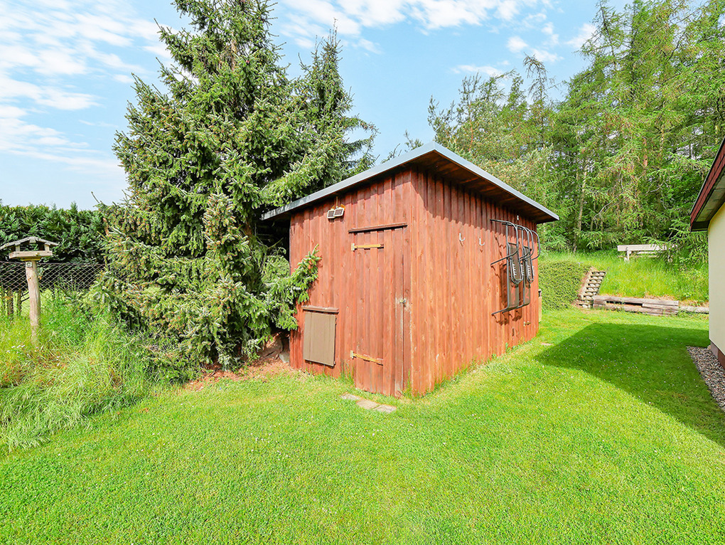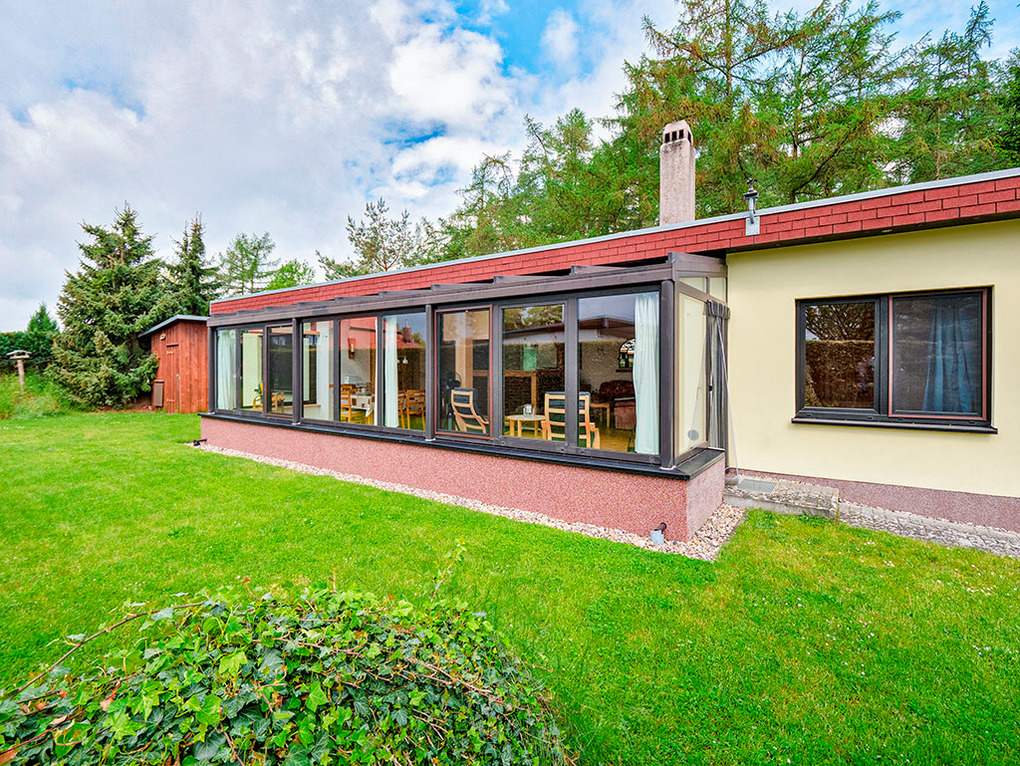 Haus: Ansprechender, aufwendig renovierter Bungalow mit Sauna, Kaminofen und großzügigem Wintergarten. Moderne, geschmackvolle Möblierung. E-Heizung. Internetzugang gegen Gebühr. Terrasse mit Sitzmöbeln, Elektrogrill. Abgeschlossenes Grundstück mit Rasenfläche, Ruheliegen. Gemütlicher Außensitzplatz am Waldrand. Gartenhaus für Fahrräder. 2 Pkw-Stellplätze am Haus.