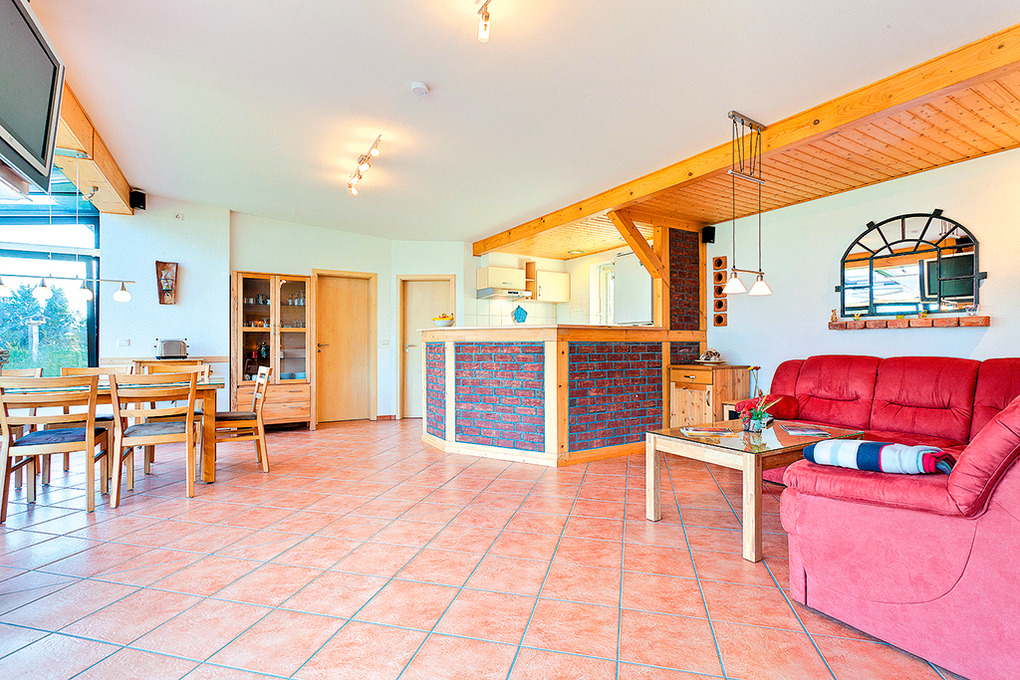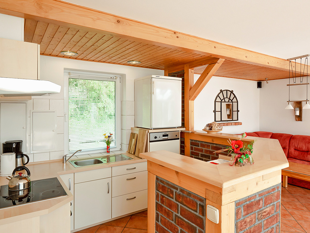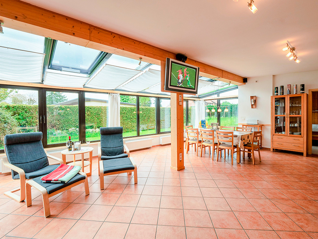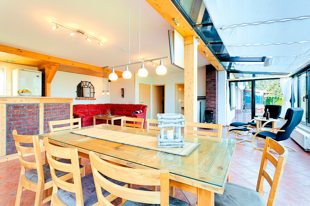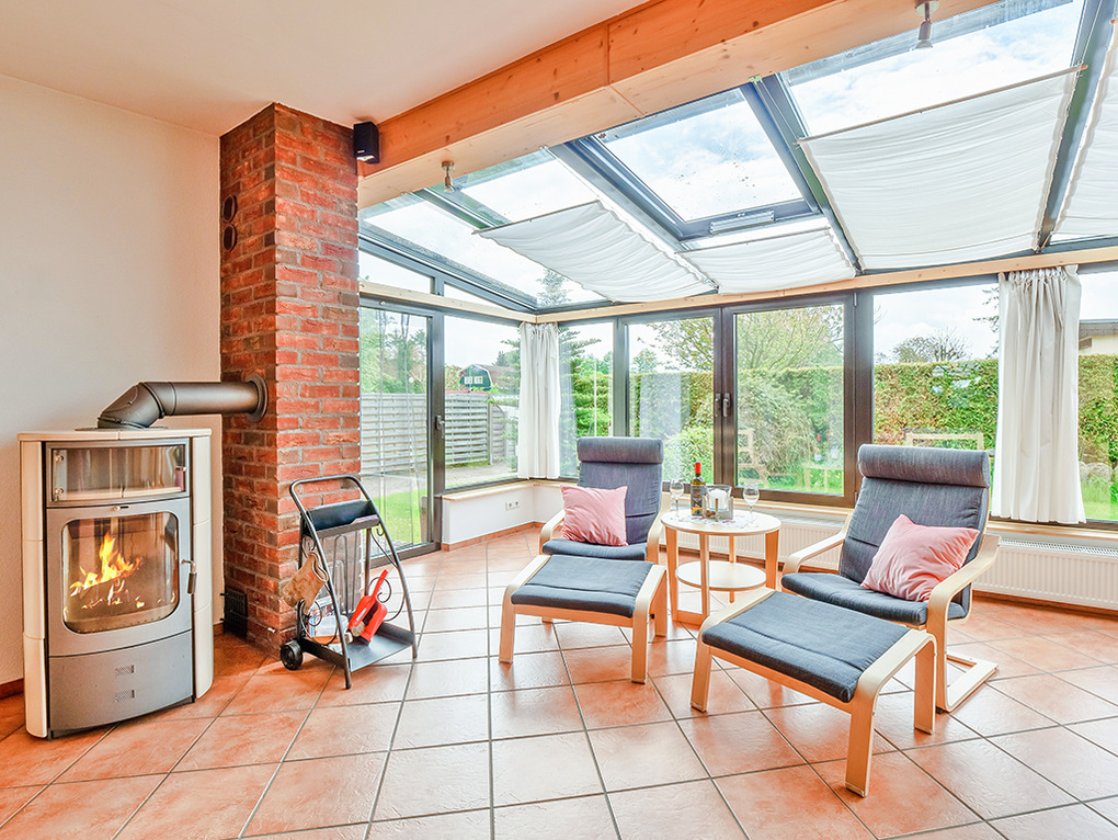 D 48.22 Ferienhaus 3-7 Pers.: 4-Zimmerhaus mit großem Platzangebot (110 qm Wohnfläche). Schöner Wohn-/Essraum mit Kaminofen, Couchgarnitur, Flachbild-Sat-TV, DVD, Surroundanlage, Radio, durch Tresen abgetrennter Einbauküche (Backofen, Mikrowelle, Spülmaschine). Wintergarten mit Essplatz. Doppelzimmer. 2-Bettzimmer. 3-Bettzimmer mit Einzelbett, Etagenbett. Bad: Sauna, Du, Wb, WC, Waschmaschine. Weiteres separates WC.