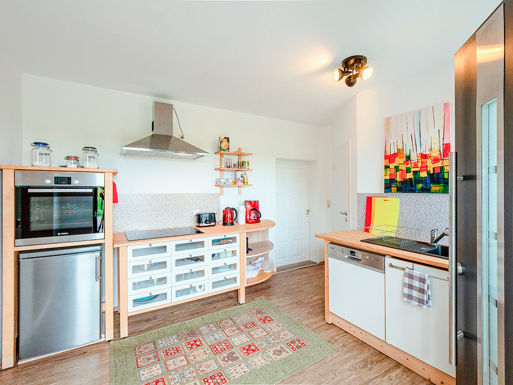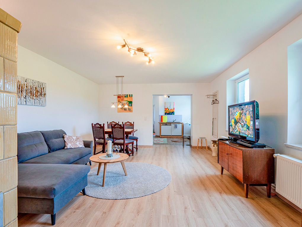D 54.159 Wohnung 2-4 Pers.: 2-Zimmerwohnung mit 60 qm Wohnfläche, Parterre. Wohn-Essraum mit Kachelofen, gemütlicher Sitzecke (Schlafsofa 2 Pers.), Flachbild-Sat-TV, Esstisch, Küchenzeile (Backofen, Spülmaschine). Doppelzimmer. Bad/WC