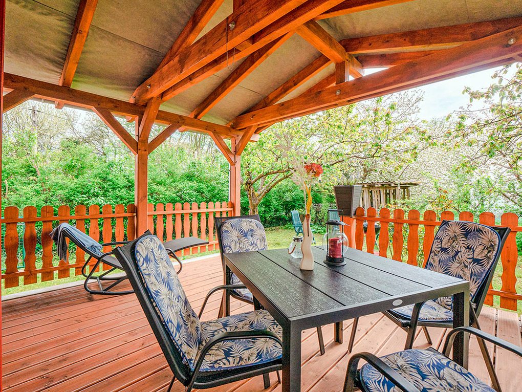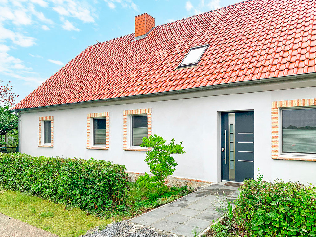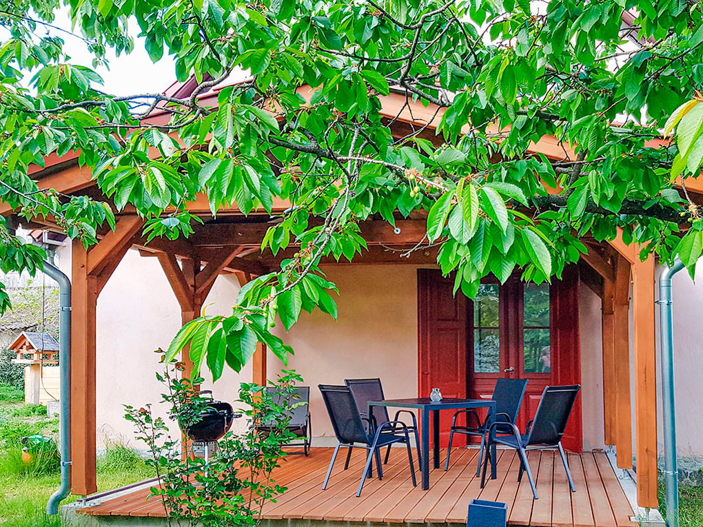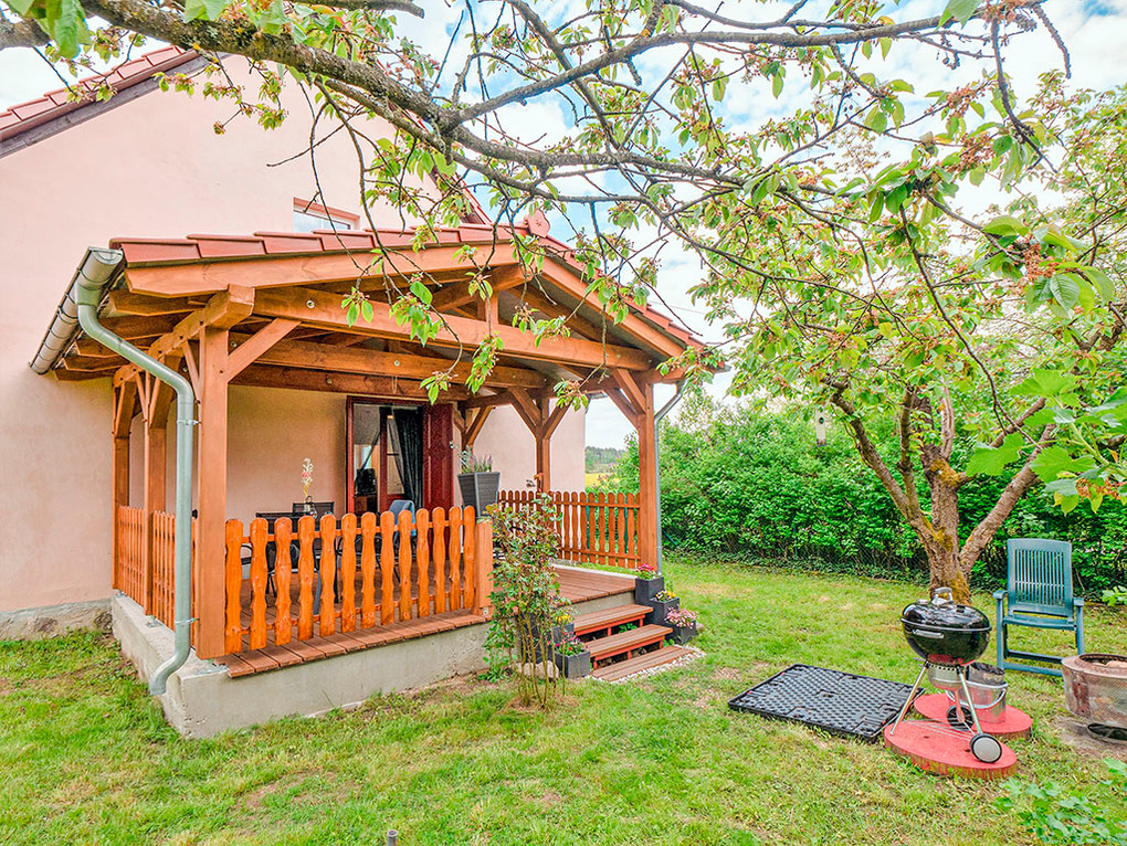 Haus: Gepflegtes Haus mit einer Ferienwohnung mit überdachter Terrasse, 2021 neu renoviert. Moderne, geschmackvolle Einrichtung. Gemütliches Ambiente mit holzbefeuertem Kachelofen. Internet über W-Lan. Waschmaschine. Gas-Zentralheizung. Schöner, naturbelassener Garten mit altem Baumbestand. Große, überdachte Terrasse mit Sitz- und Liegemöbeln, Grill. 1 Pkw-Stellplatz vorhanden.