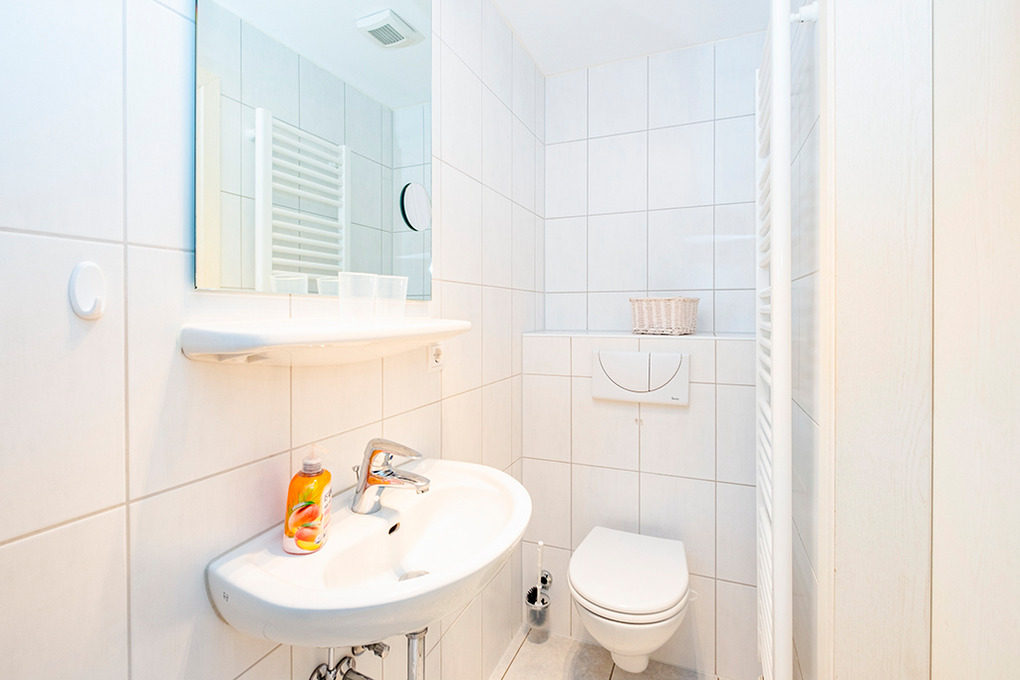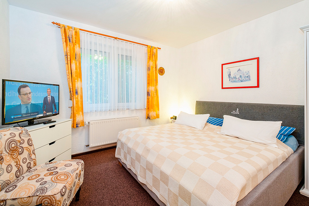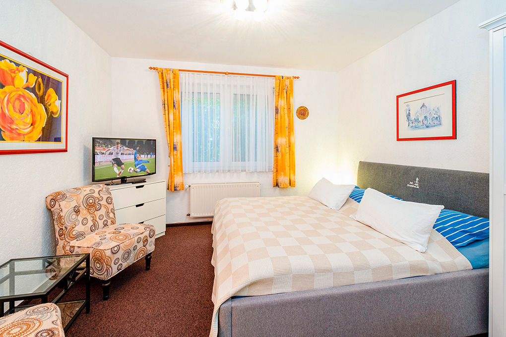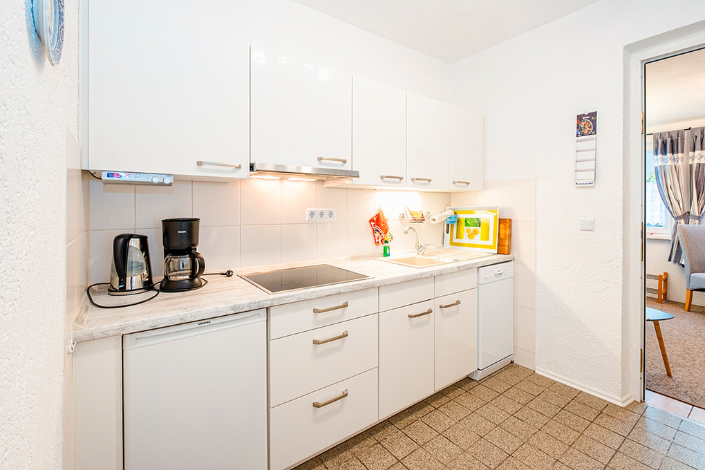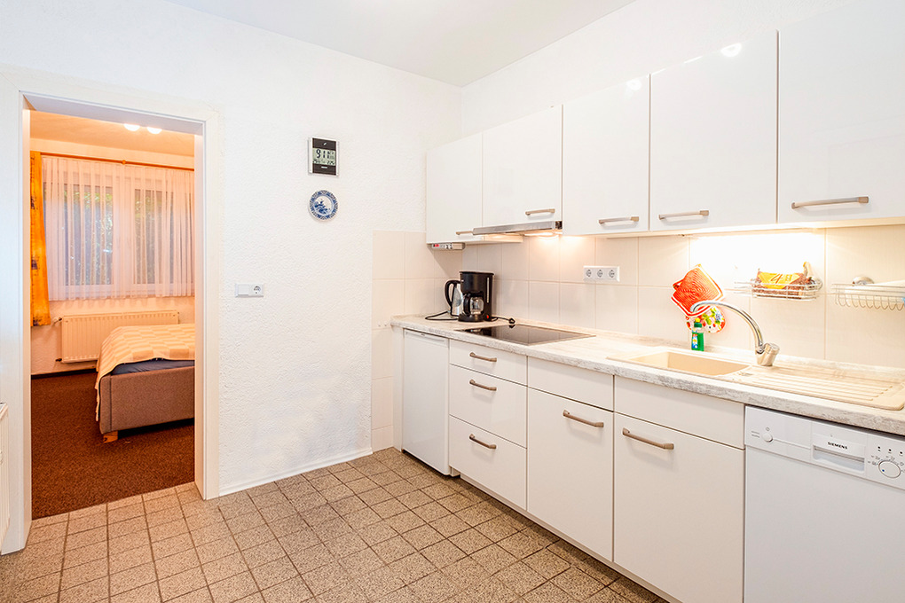 D 63.12A Wohnung 1-2 Pers.: 2-Zimmerwohnung mit 33 qm Wohnfläche, Parterre. Wohn-/Essraum mit Couchgarnitur, Flachbild-Sat-TV, Esstisch, Küchenzeile (4 Pl. E-Herd). Doppelzimmer. Bad/WC. Terrasse mit Sitzmöbeln.