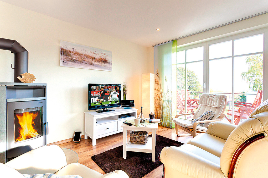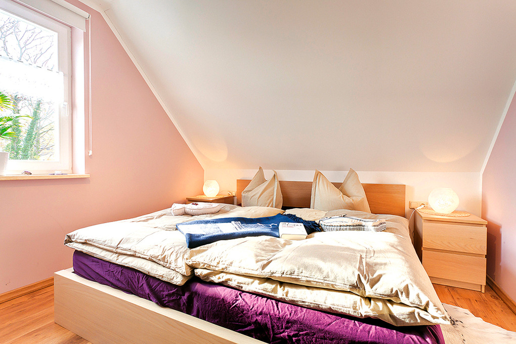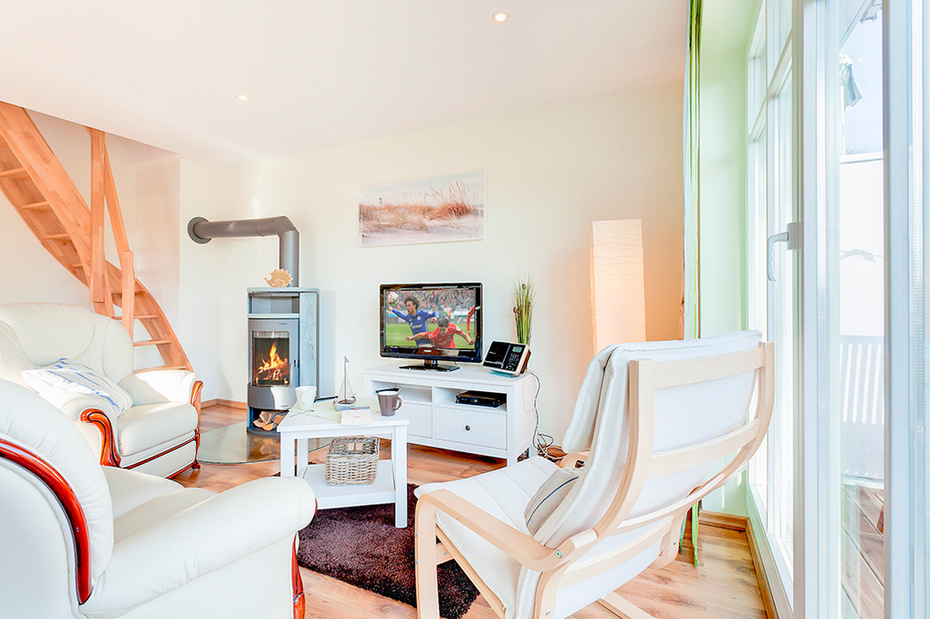 D 64.10A Wohnung 1-4 Pers.: 3-Zimmerwohnung mit 60 qm Wohnfläche über 2 Etagen, 1. Etage. Heller, freundlicher Wohn-/Essraum mit Kaminofen, Couchgarnitur, Flachbild-Sat-TV, Esstisch, moderner Küchenzeile (Backofen, Mikrowelle, Spülmaschine). Doppelzimmer. Bad/WC. Steile Treppe in den Spitzboden: Doppelzimmer.