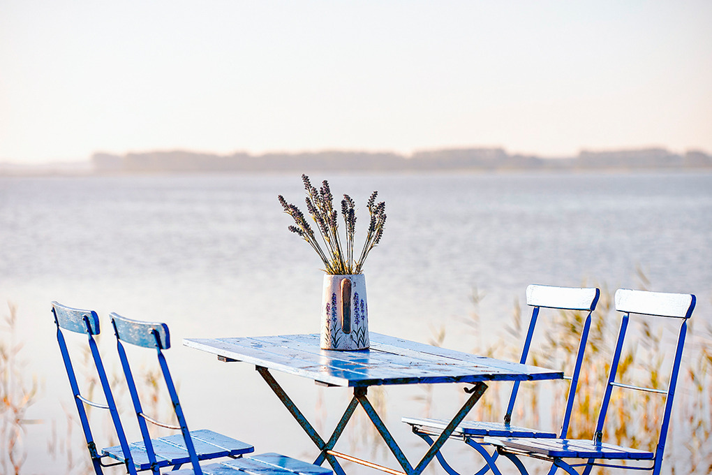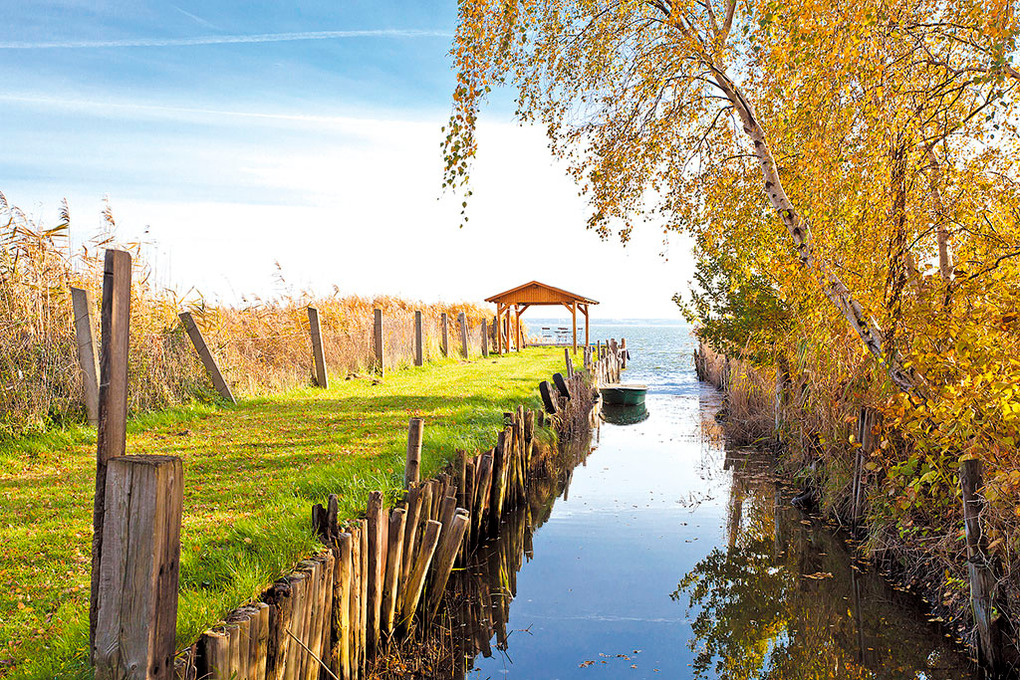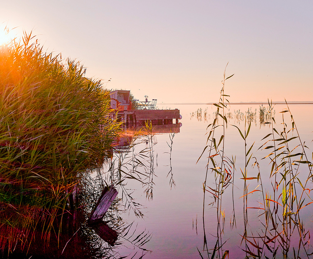 Ort: Born. Idyllische, ruhige Lage unmittelbar am malerischen Bodden. Eigener Bootsanlegeplatz mit Slip/-Traileranlage nur 50 m! Hafen 500 m. Ortsmitte 300 m. Ostseestrand Prerow, Ahrenshoop jeweils 9 km.