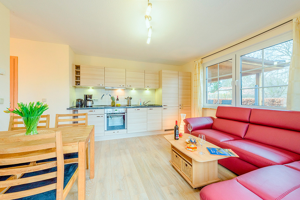 D 64.18 Wohnung 1-4 Pers.: 3-Zimmerwohnung mit 40 qm Wohnfläche, Parterre. Wohn-/Essraum mit Couchgarnitur, Flachbild-Sat-TV, Esstisch, moderner Küchenzeile (Backofen, Spülmaschine). 2 Doppelzimmer, eins davon mit franz. Bett. Bad/WC.