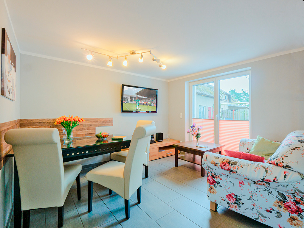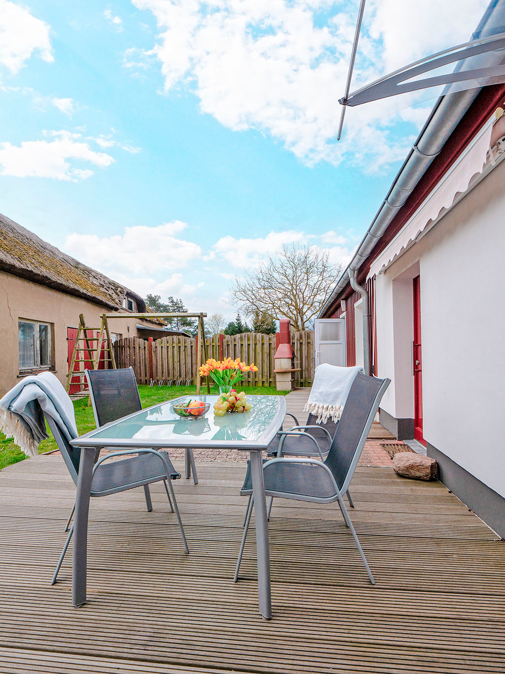 Ort: Wieck. Zentrale Lage. Ortsmitte 500 m. Bodden 800 m. Hafen 1,8 km. Ostseestrand Prerow 4 km.