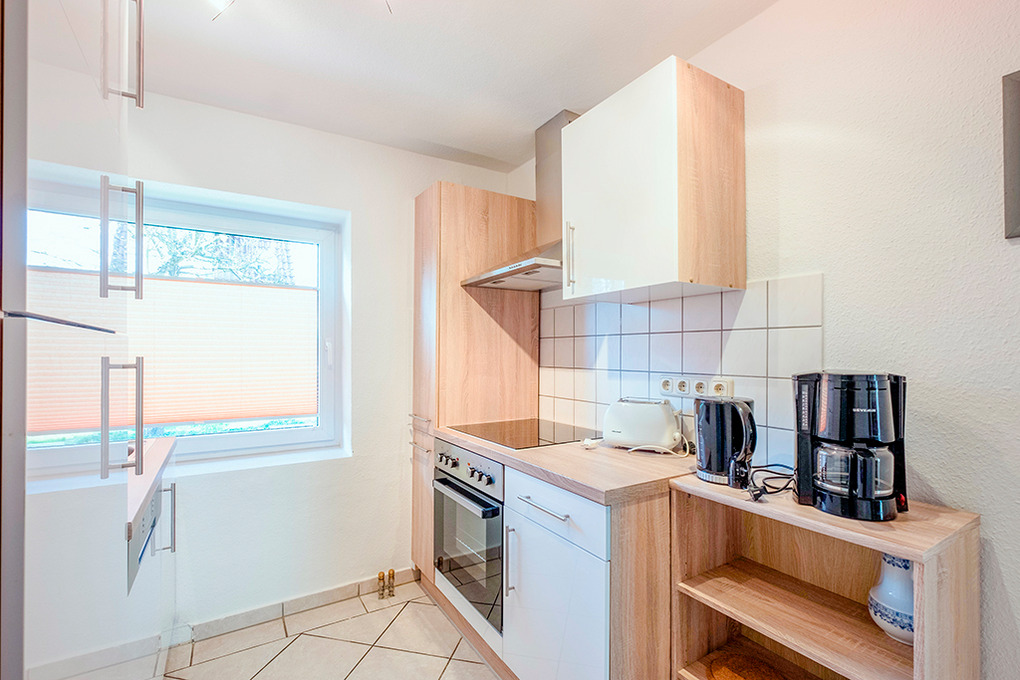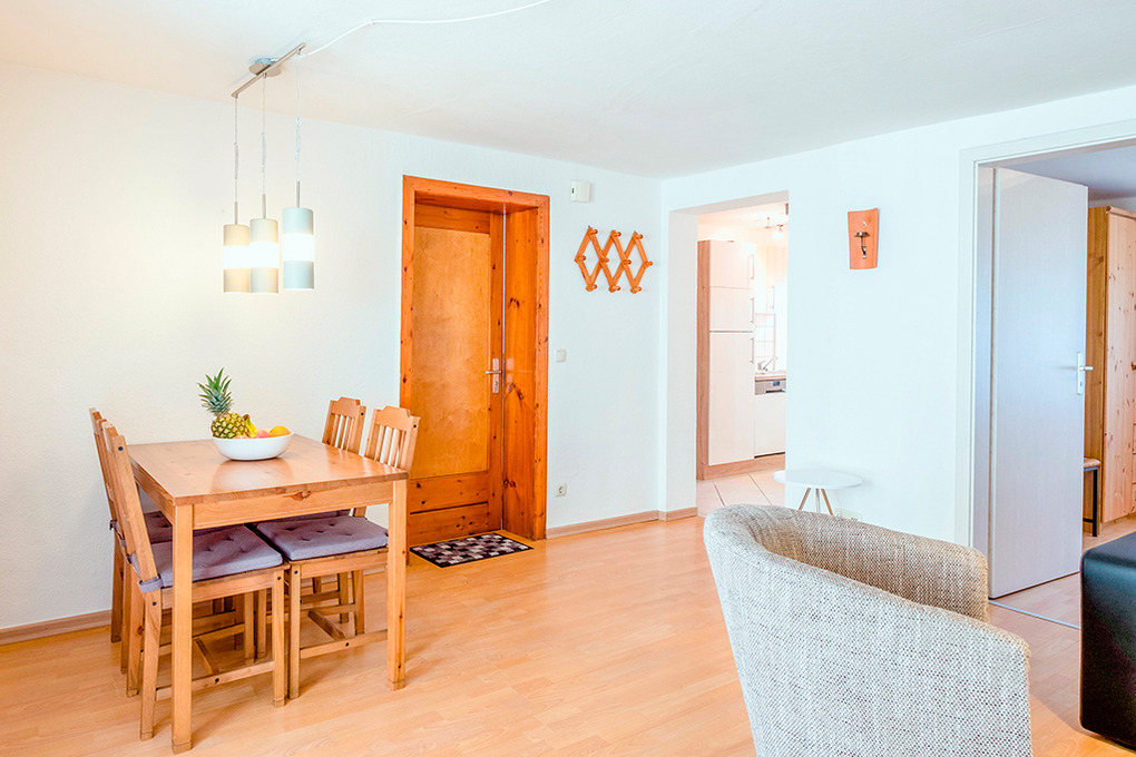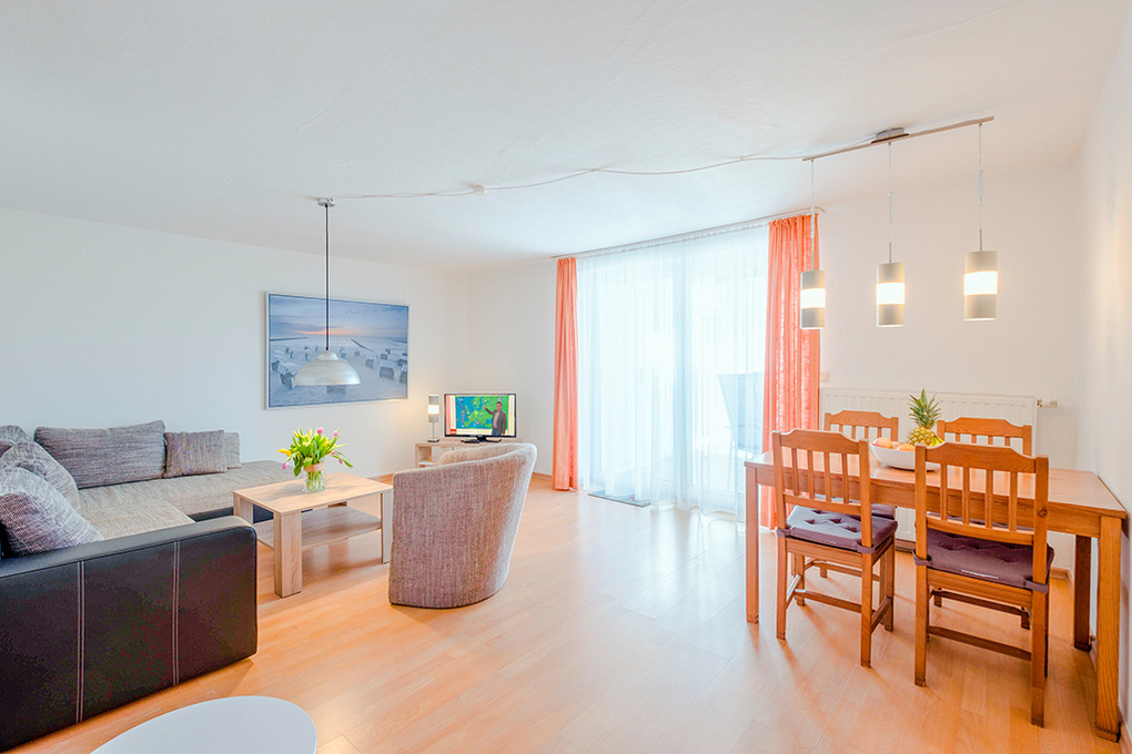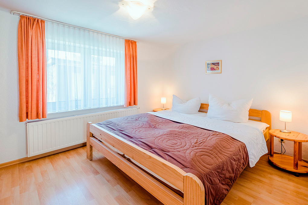 D 66.32 Wohnung 2-4 Pers.: 2-Zimmerwohnung, 45 qm Wohnfläche, Parterre. Wohn-/Essraum mit Sitzgarnitur (Ausziehcouch 2 Pers.), Esstisch, Küchenzeile (Backofen, Spülmaschine). Doppelzimmer. Bad/WC.