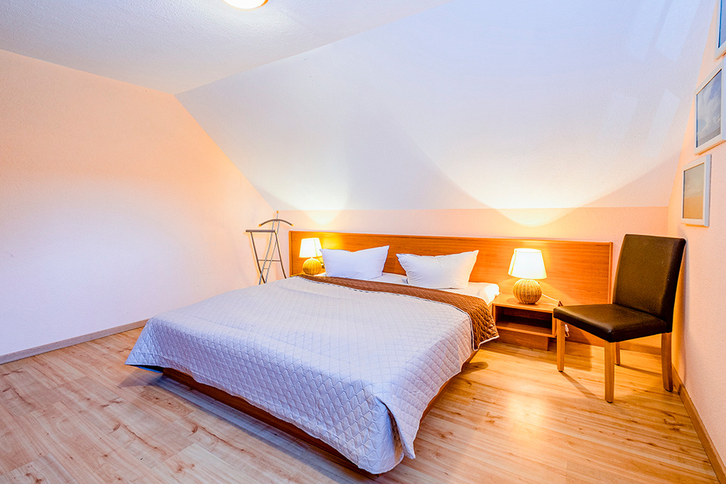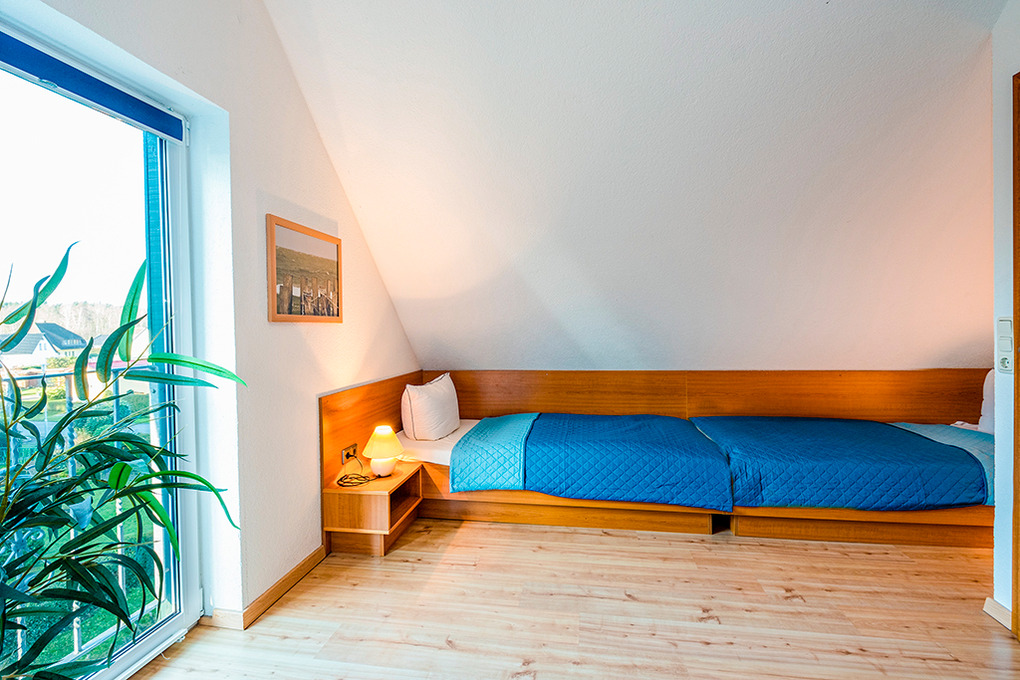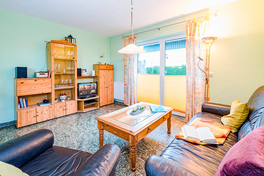 D 67.8A Ferienhaus 1-6 Pers.: 4-Zimmerhaushälfte mit 100 qm Wohnfläche über 3 Etagen. Parterre: Freundlich eingerichteter Wohn-/Essraum mit Couchgarnitur, Sat-TV, Esstisch, gut ausgestatteter Küchenzeile (Backofen, Mikrowelle, Spülmaschine). Schöner, heller Wintergarten, neu angebaut, mit Sauna, Dusche, Ruheraum. Separates WC. 1. Etage: Doppelzimmer mit großem Balkon. 2-Bettzimmer. Bad: Du/Bw, Wb, WC. Dachgeschoss mit leichten Schrägen: 2-Bettzimmer mit Sat-TV, Balkon.