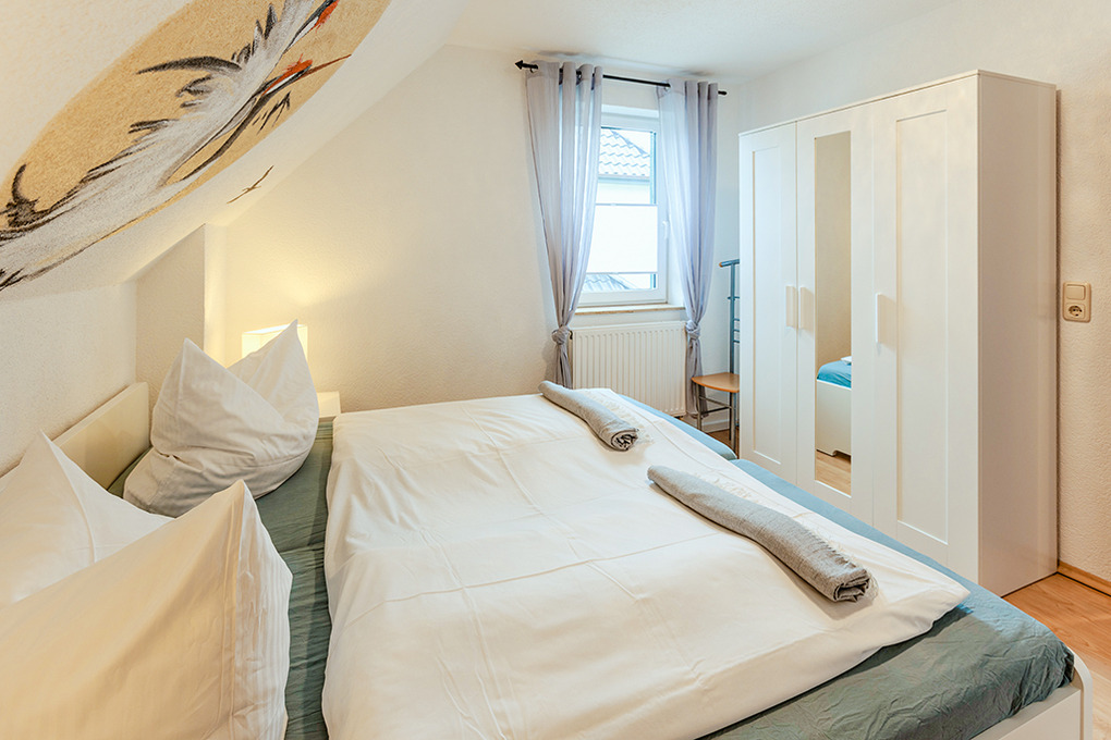 D 67.11A Ferienhaus 1-6 Pers.: 4-Zimmerhaushälfte mit 90 qm Wohnfläche über 3 Etagen. Parterre: Freundlich eingerichteter Wohn-/Essraum mit Couchgarnitur, Sat-TV, Esstisch, gut ausgestatteter Küchenzeile (Backofen, Spülmaschine). Bad/WC. 1. Etage: 2 Doppelzimmer. Bad/WC. Dachgeschoss mit leichten Schrägen: 2-Bettzimmer mit Sat-TV.