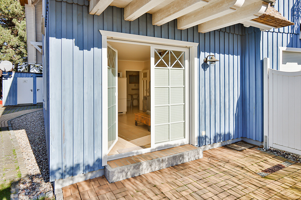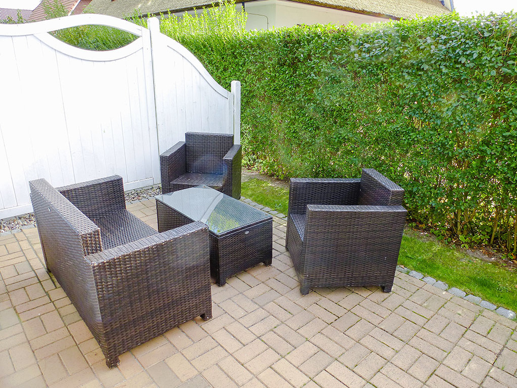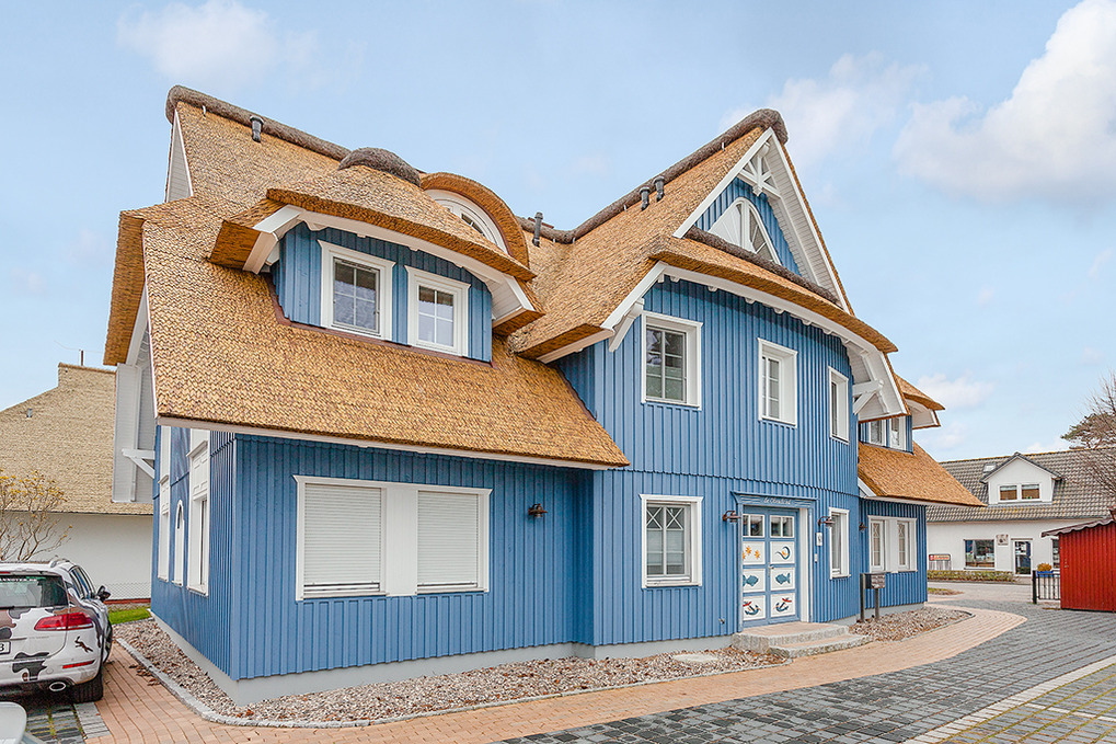 Haus: Neu erbautes, landschaftypisches Reetdachhaus mit mehreren Ferienwohnungen. Moderne, komfortable Einrichtung, Kaminofen. Kostenloser Internet-Anschluss (W-Lan). Zentralheizung. Terrasse mit Sitzmöbeln. Pkw-Stellplatz am Haus.