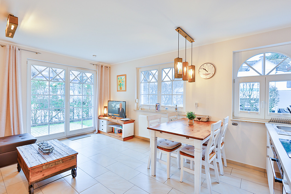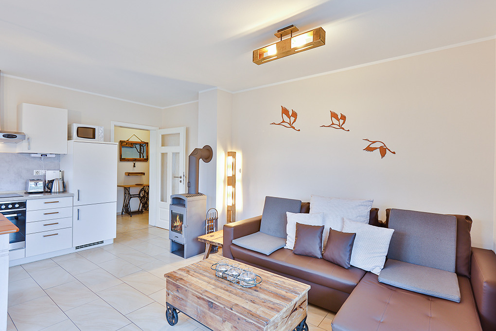 D 67.15 Wohnung 1-4 Pers.: 2-Zimmerwohnung mit 50 qm Wohnfläche, Parterre. Freundlicher Wohn-/Essraum mit Kaminofen, Couchgarnitur (Ausziehcouch 2 Pers.), Sat-TV, Esstisch, moderner Küchenzeile (Backofen, Mikrowelle, Spülmaschine). Doppelzimmer. Bad/WC.