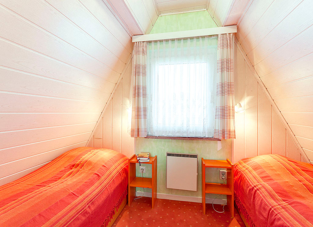D 67.17 Finnhütte 1-4 Pers.: 3 ½-Zimmerhaus mit 45 qm Wohnfläche über 2 Etagen, Parterre: Wohn-/Essraum mit Sitzgarnitur, Esstisch, Sat-TV. Kleine, separate Küche (Backofen). Bad/WC. Schmale, steile Treppe in das Dachgeschoss (starke Schrägen): Doppelzimmer. 2-Bettzimmer.