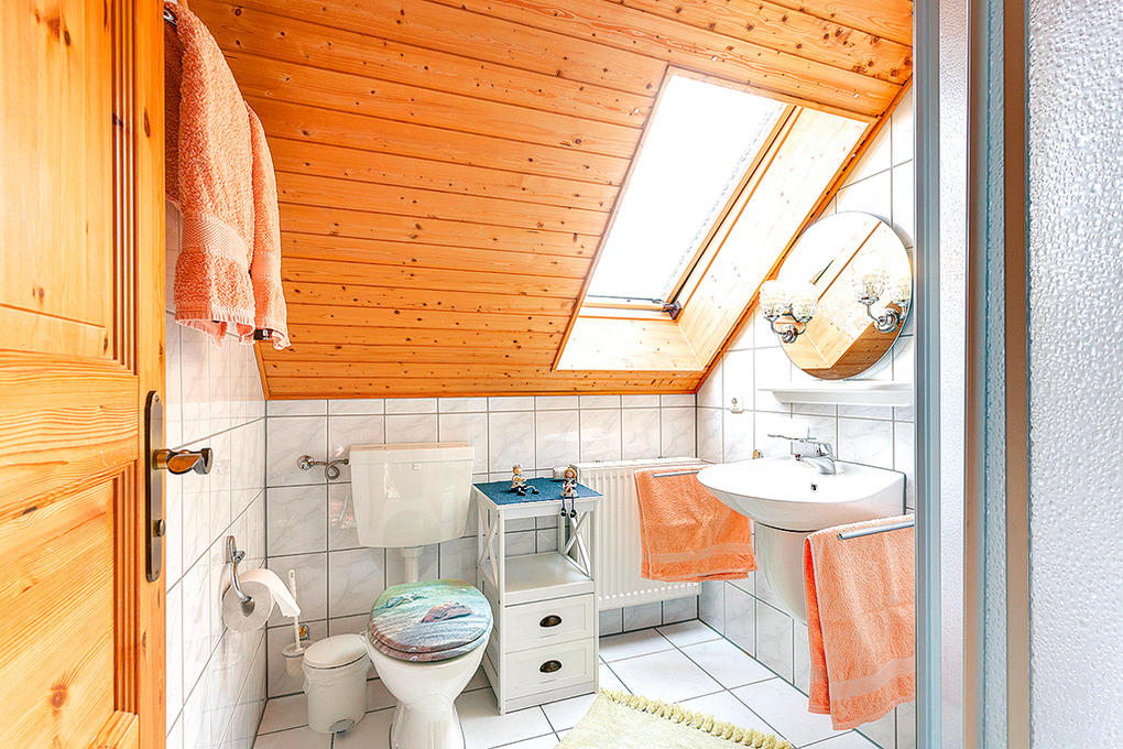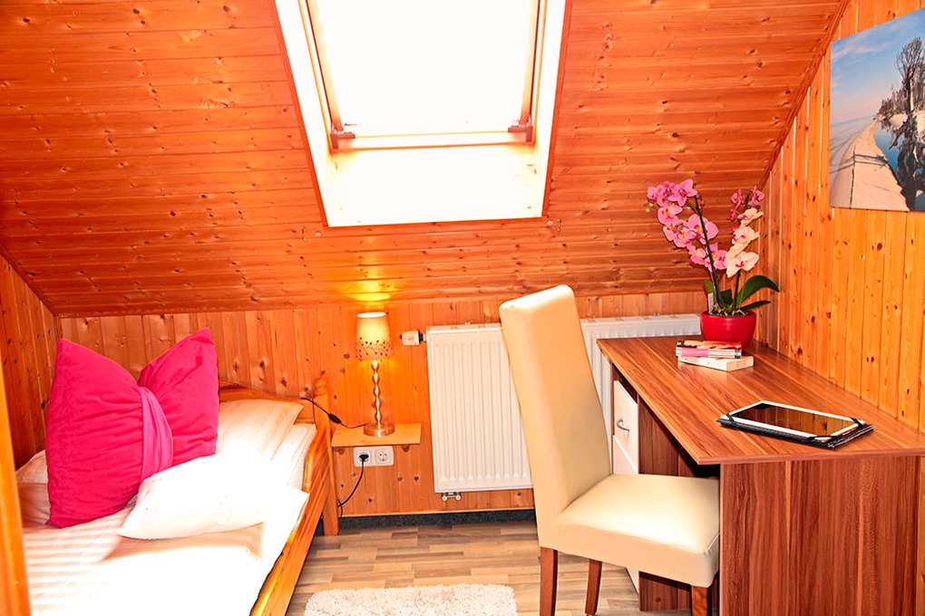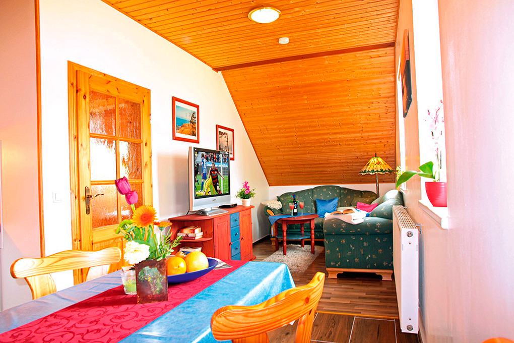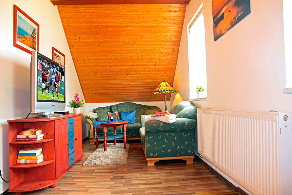 Haus: Regionstypisches Ferienhaus mit 2 Nichtraucher-Ferienwohnungen in der 1. Etage. Separate Vermieterwohnung im Parterre. Kostenloser Internetzugang über W-Lan. Gemütliche Einrichtung. Separate Sitzecke im Garten des Vermieters. 1 PKW-Stellplatz/ Fewo