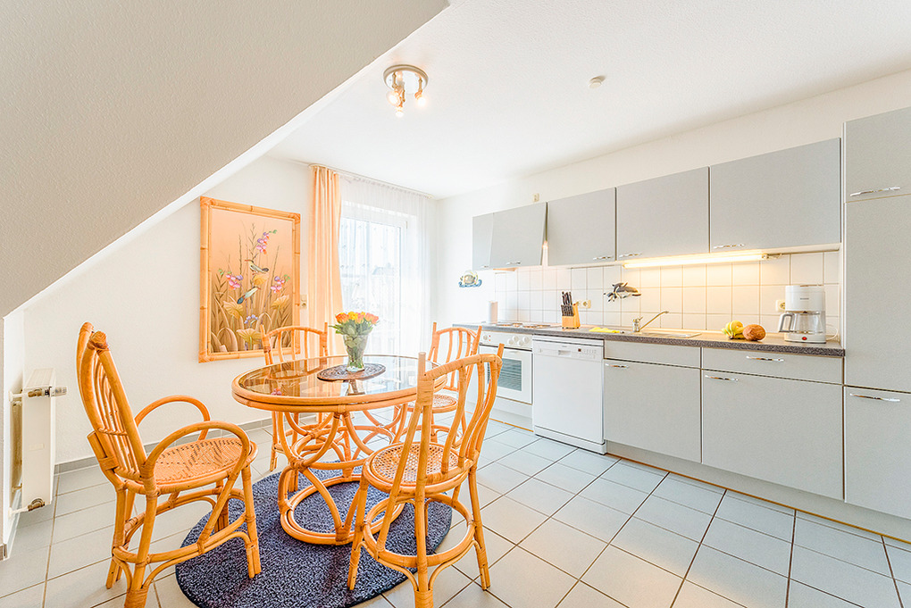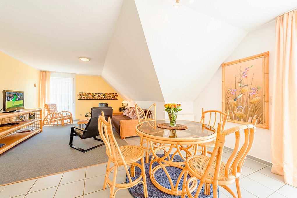 D 67.0303 Wohnung 1-6 Pers.: 3-Zimmerwohnung mit 65 qm Wohnfläche, Parterre. Wohn-/Essraum mit Sitzgarnitur (Ausziehcouch 2 Pers.), Sat-TV, Esstisch, Küchenzeile (Backofen, Spülmaschine). Doppelzimmer. Doppelzimmer mit französischem Bett (1,20 x 2,00 Meter). Bad/WC. Balkon.