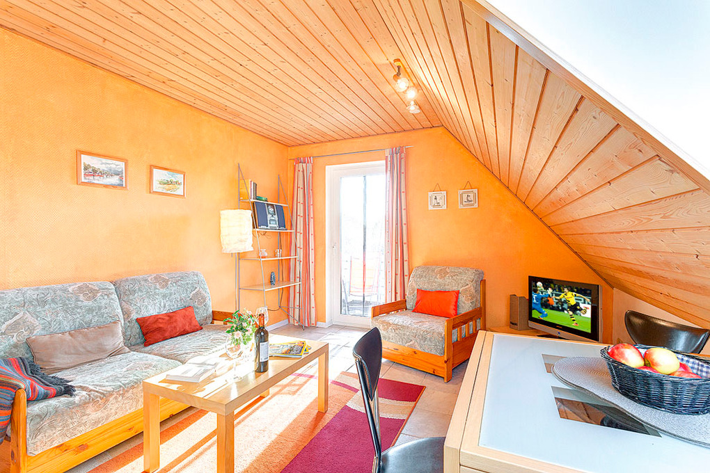 D 67.31 Wohnung 1-3 Pers.: Ansprechende 2-Zimmerwohnung mit 55 qm Wohnfläche, 1. Etage. Wohn-/Essraum mit Couchgarnitur (Ausziehcouch 2 Pers.), Sat-TV, Radio-CD, moderner Küchenzeile (2 Pl. E-Herd, Spülmaschine, Mikrowelle). Doppelzimmer. Bad/WC. Großer Balkon mit Sitzmöbeln.