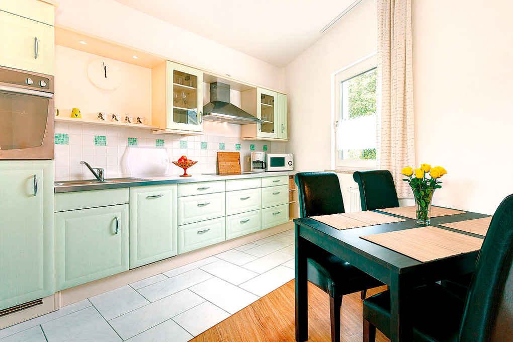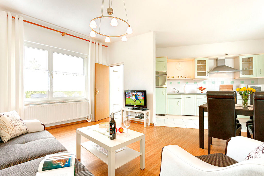 D 67.38 Wohnung 1-2 Pers.: 2-Zimmerwohnung mit 55 qm Wohnfläche, Parterre. Geräumiger Wohn-/Essraum mit Couchgarnitur, Flachbild-Sat-TV, Esstisch, moderner Küchenzeile (Backofen, Mikrowelle, Spülmaschine). Doppelzimmer. Bad/WC. Terrasse mit Sitzmöbeln.