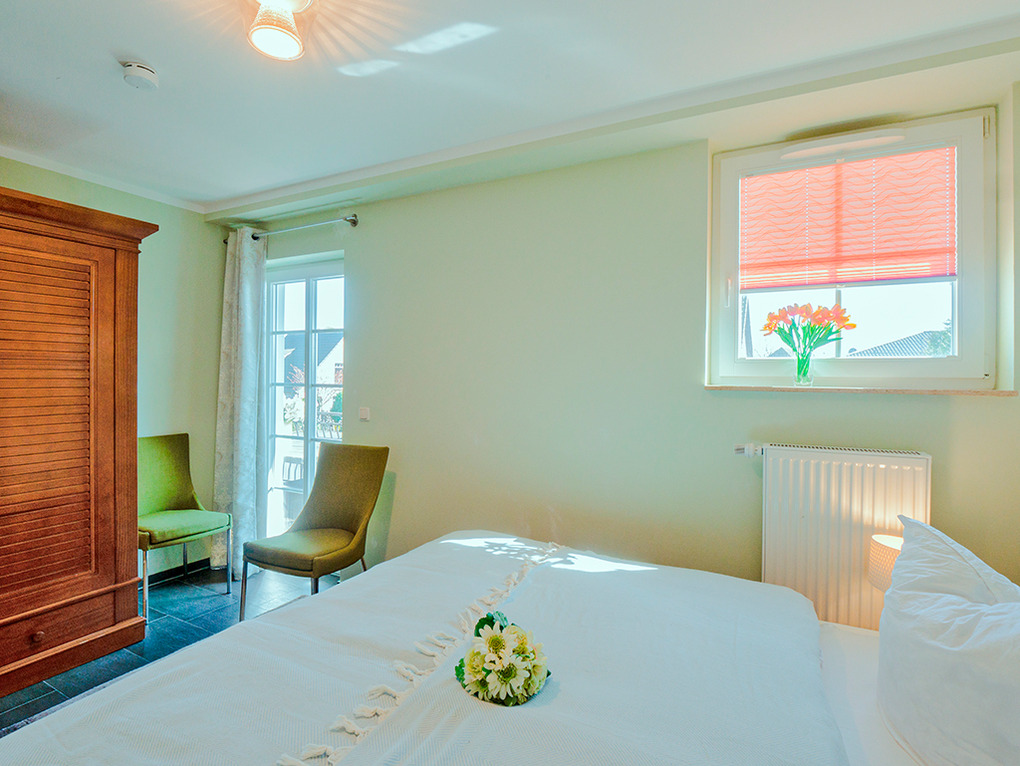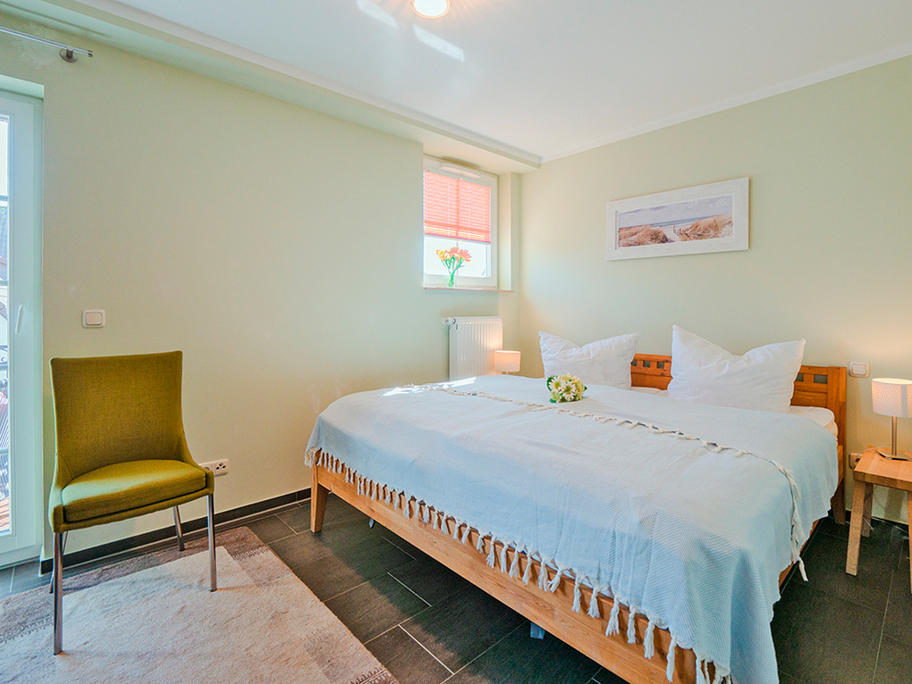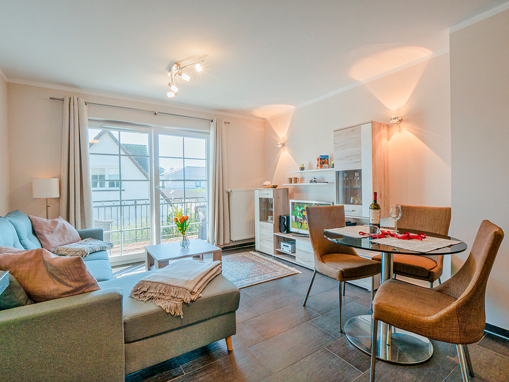 D 67.40 Wohnung 1-3 Pers.: 2-Zimmerwohnung mit 46 qm Wohnfläche, 1. Etage. Wohn-/Essraum mit Couchgarnitur (Ausziehcouch 1 Pers.), Sat-TV, Esstisch, Küchenzeile (Backofen, Spülmaschine). Doppelzimmer. Bad/WC. Balkon mit Sitzmöbeln.