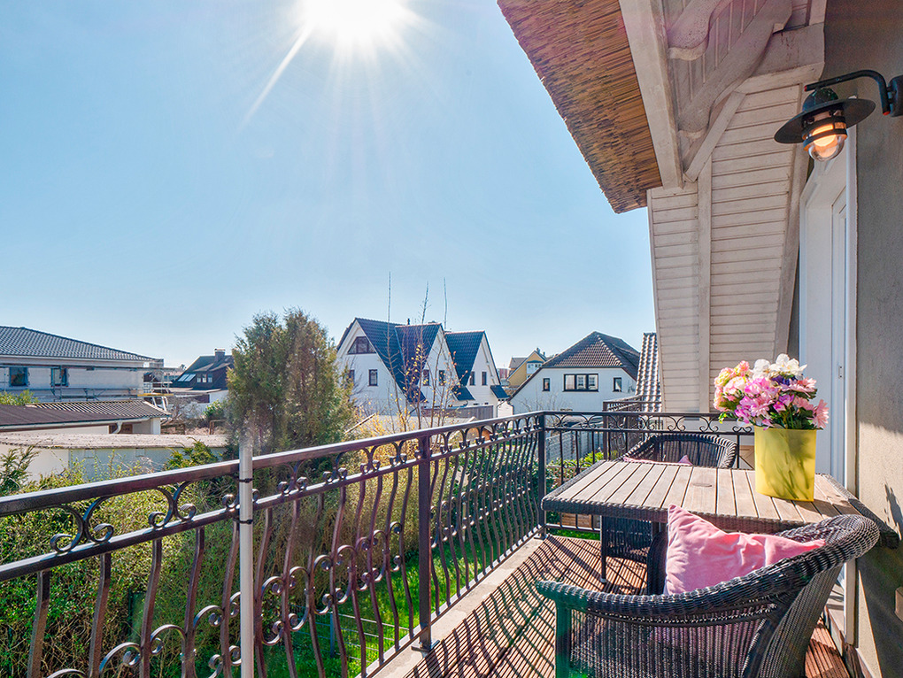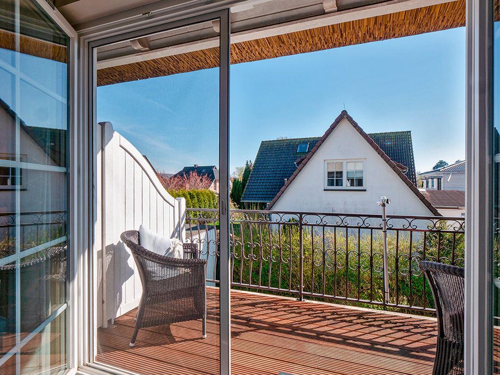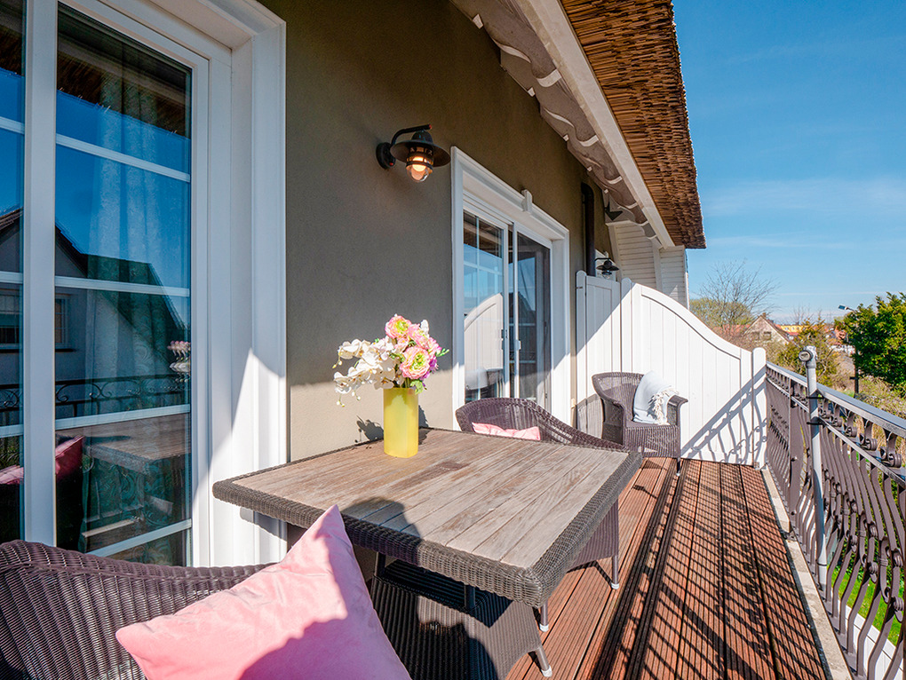 Haus: Landschaftstypisches Reetdachhaus, 2011 neu erbaut. Schöne Ferienwohnungen mit moderner, komfortabler Einrichtung. Kostenloser Internetzugang über W-Lan. Zentralheizung. Nichtraucherwohnungen. Jede Fewo mit Balkon. 1 Pkw-Stellplatz/Fewo.