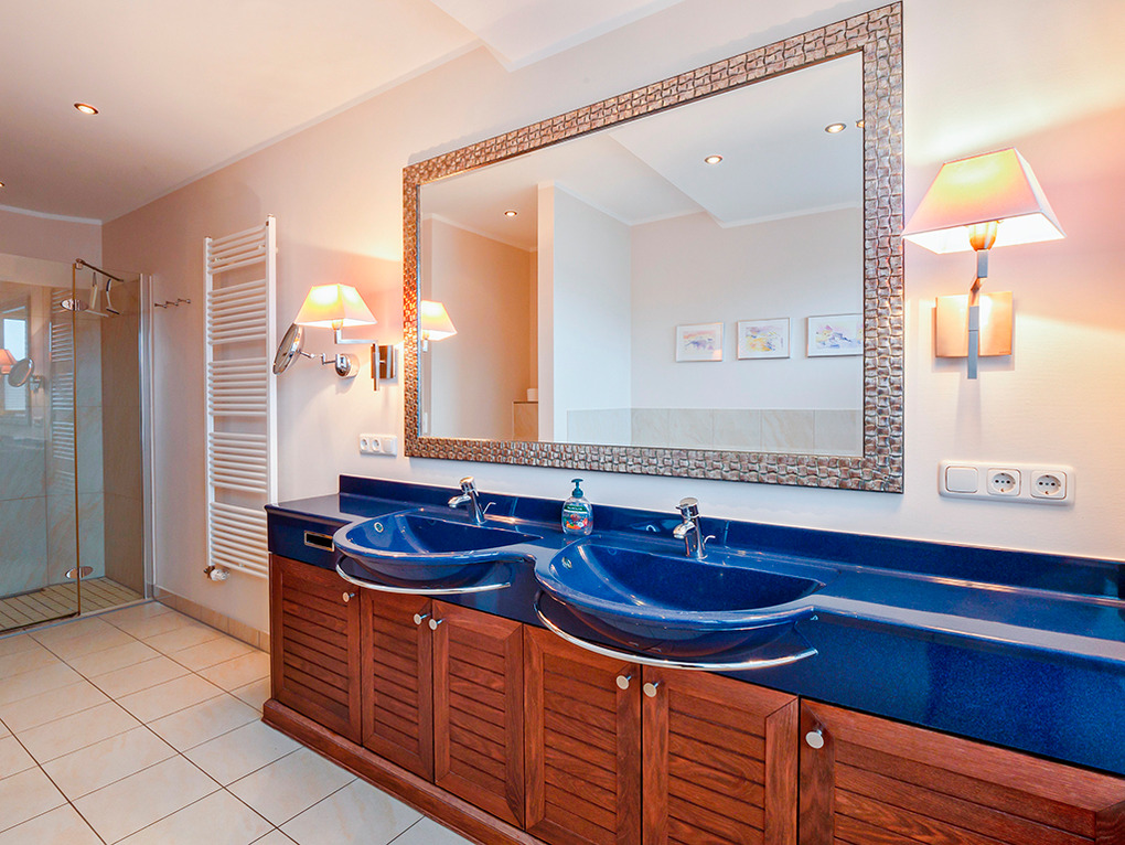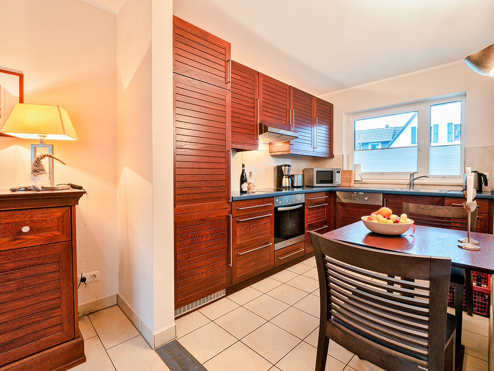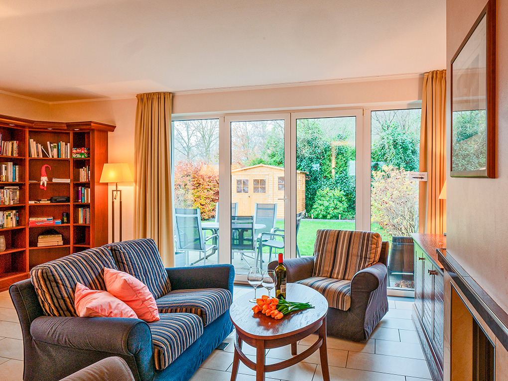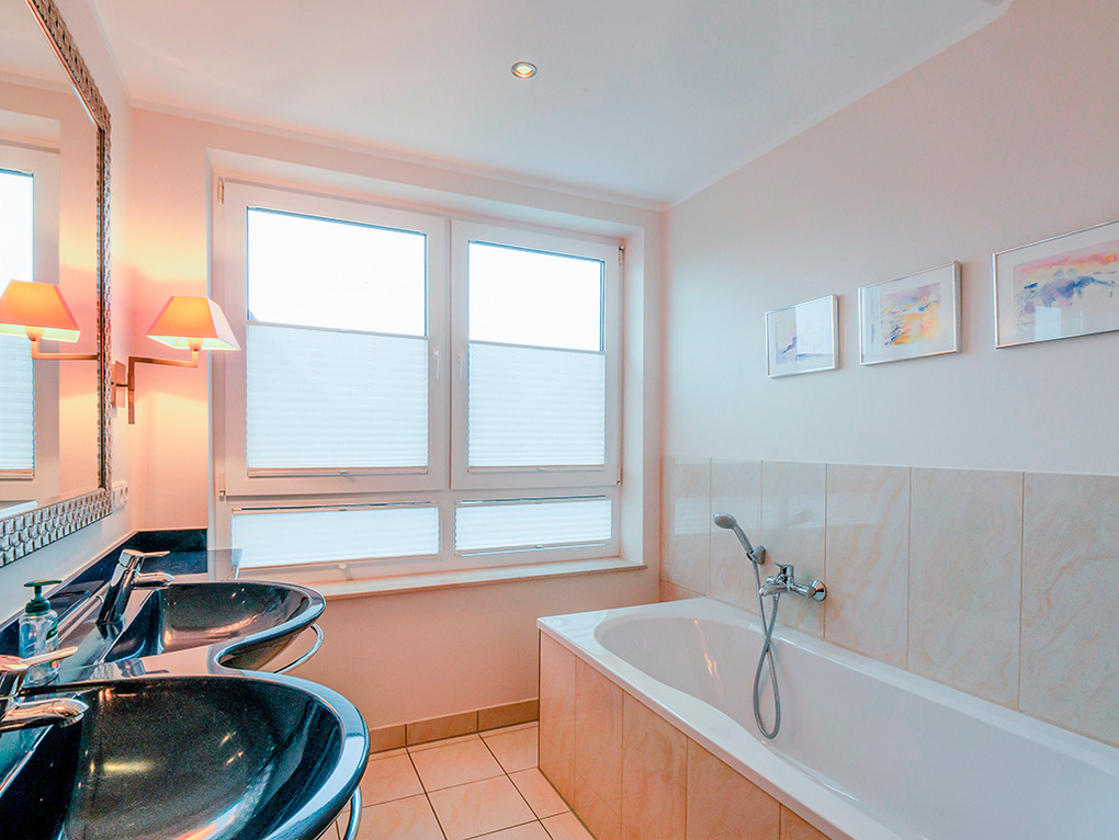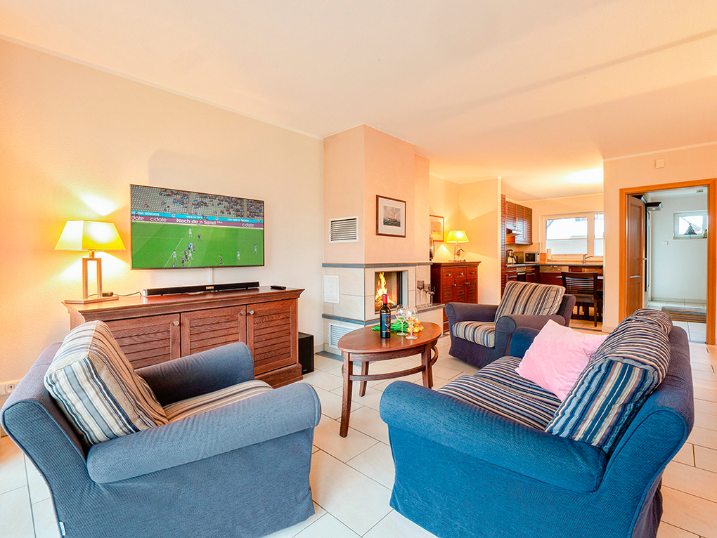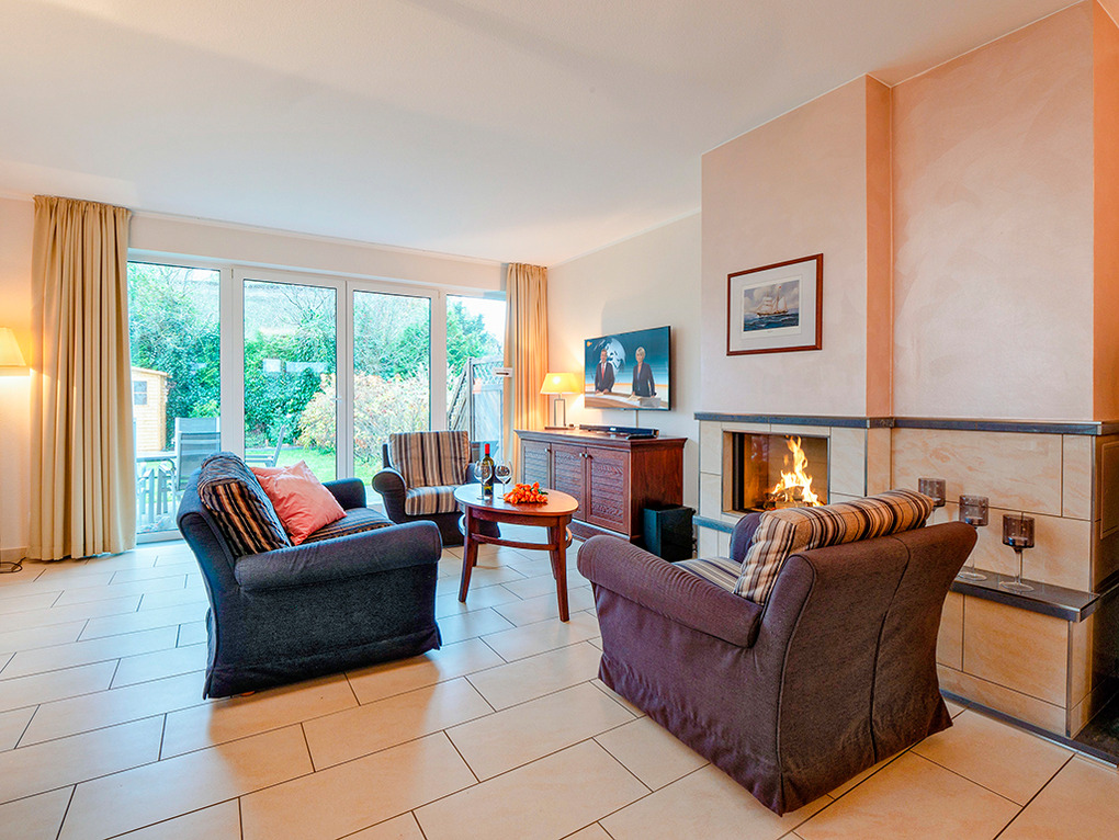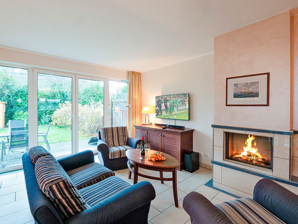 Haus: Komfortable Doppelhaushälfte mit Kamin (Gas). Das Haus besticht durch sein großes Platzangebot: 130 qm Wohnfläche, 4 Schlafzimmer, 2 Bäder. Gehobene Ausstattung mit moderner, geschmackvoller Einrichtung. Kostenloser Internetzugang über W-Lan. Waschmaschine. Zentralheizung. Nichtraucherhaus. Terrasse mit Sitzmöbeln, 2 Sonnenliegen, anschließend kleiner Garten, Grill. Gartenhaus für Fahrräder. 2 Pkw-Stellplätze am Haus.