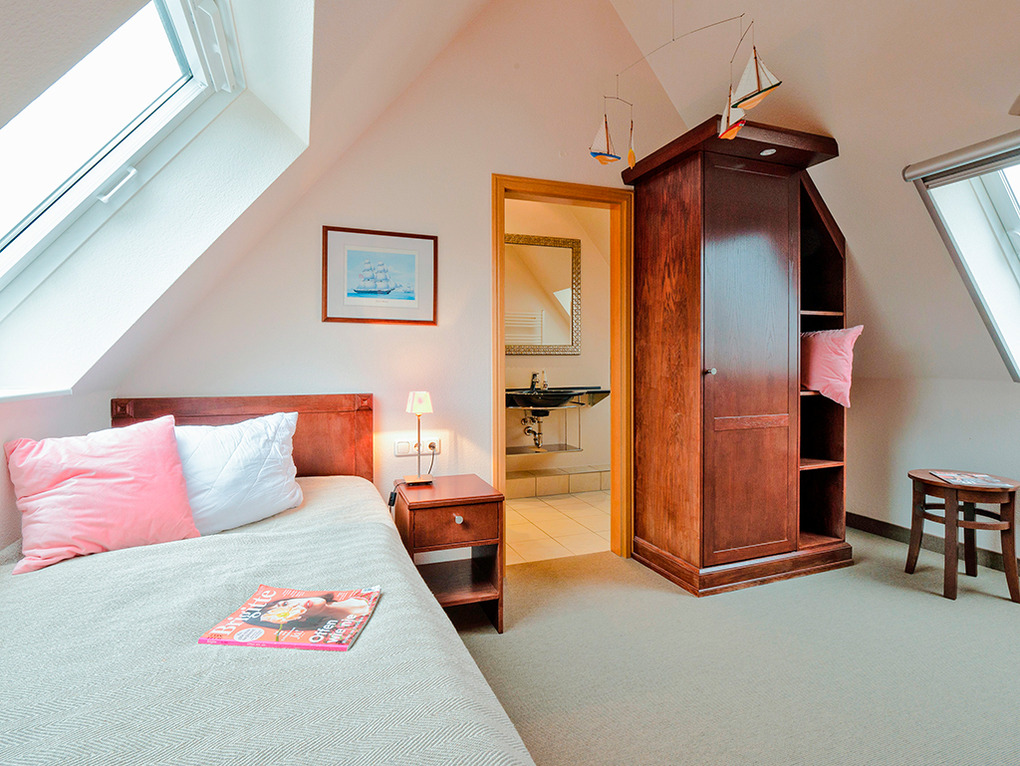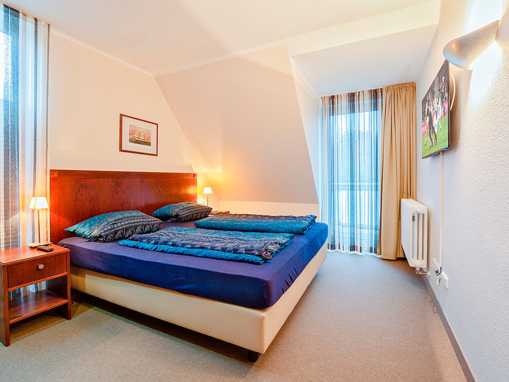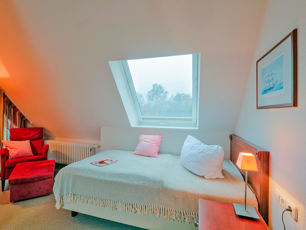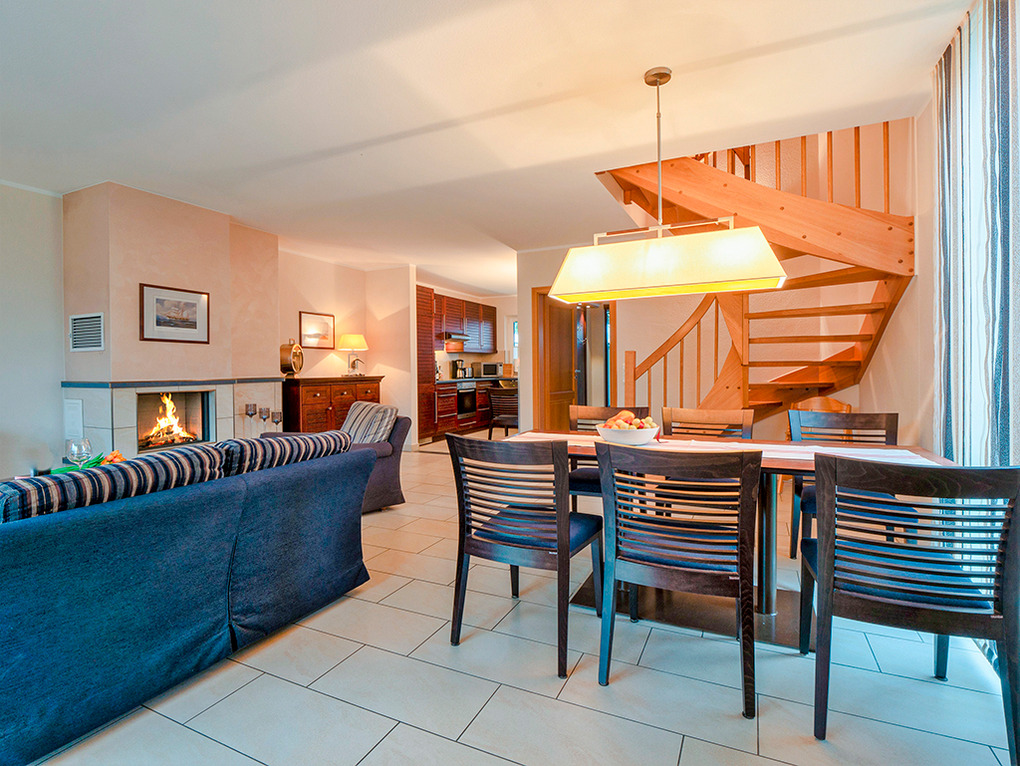 D 67.74 Ferienhaus 1-6 Pers.: Großzügige 5-Zimmer-Haushälfte mit 130 qm Wohnfläche über 3 Etagen. Parterre: Wohn-/Essraum mit Kamin (Gas), Couchgarnitur, Sat-TV (Smart-TV), Esstisch, gut ausgestatteter Einbauküche (Backofen, Mikrowelle, Spülmaschine). Gäste-WC. 1. Etage: Doppelzimmer mit Sat-TV. Doppelzimmer. Einzelzimmer mit Balkon. Bad: Du, Bw, 2 Wb, WC. Treppe in das ausgebaute Dachgeschoss: Einzelzimmer mit Bad (Du, Wb, WC).