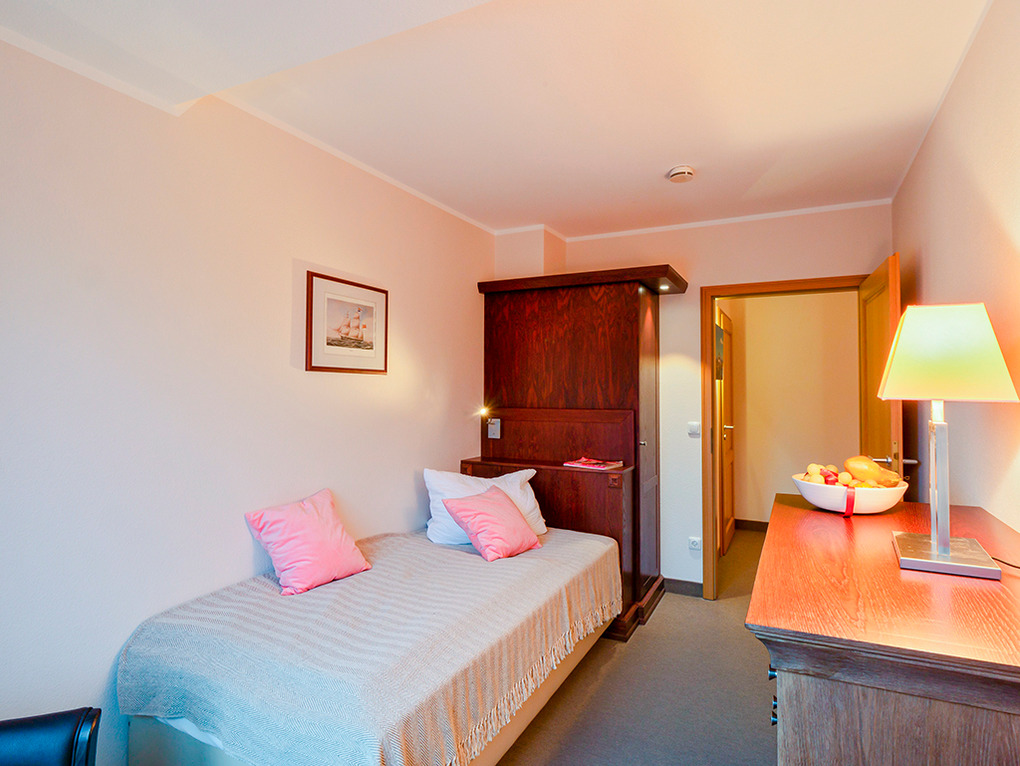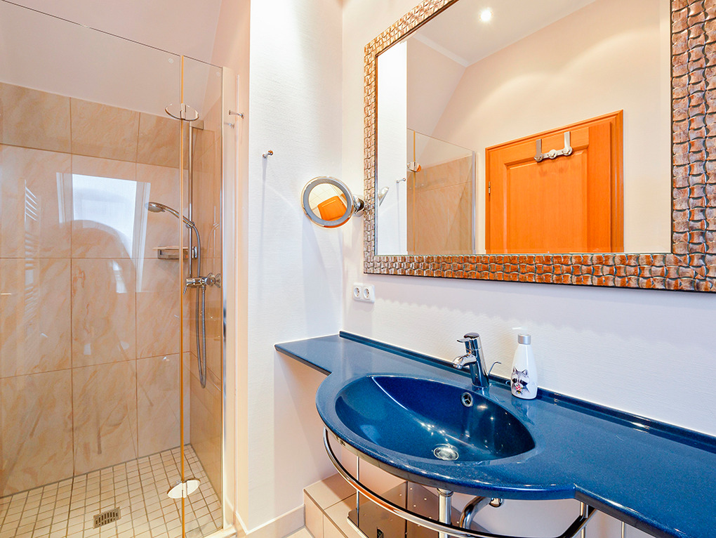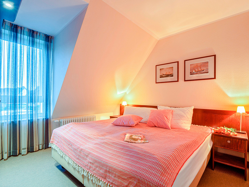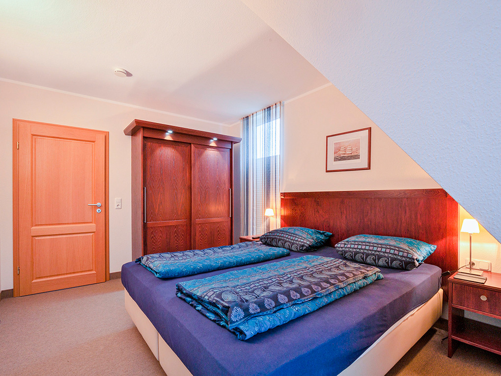 D 67.74 Ferienhaus 1-6 Pers.: Großzügige 5-Zimmer-Haushälfte mit 130 qm Wohnfläche über 3 Etagen. Parterre: Wohn-/Essraum mit Kamin (Gas), Couchgarnitur, Sat-TV (Smart-TV), Esstisch, gut ausgestatteter Einbauküche (Backofen, Mikrowelle, Spülmaschine). Gäste-WC. 1. Etage: Doppelzimmer mit Sat-TV. Doppelzimmer. Einzelzimmer mit Balkon. Bad: Du, Bw, 2 Wb, WC. Treppe in das ausgebaute Dachgeschoss: Einzelzimmer mit Bad (Du, Wb, WC).