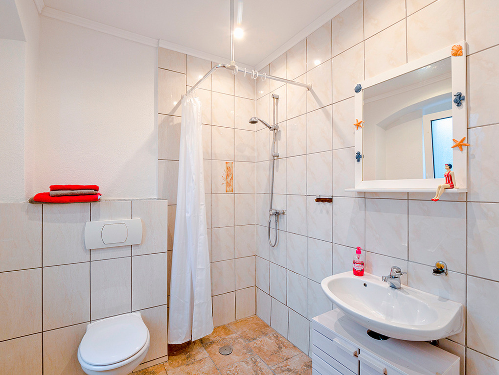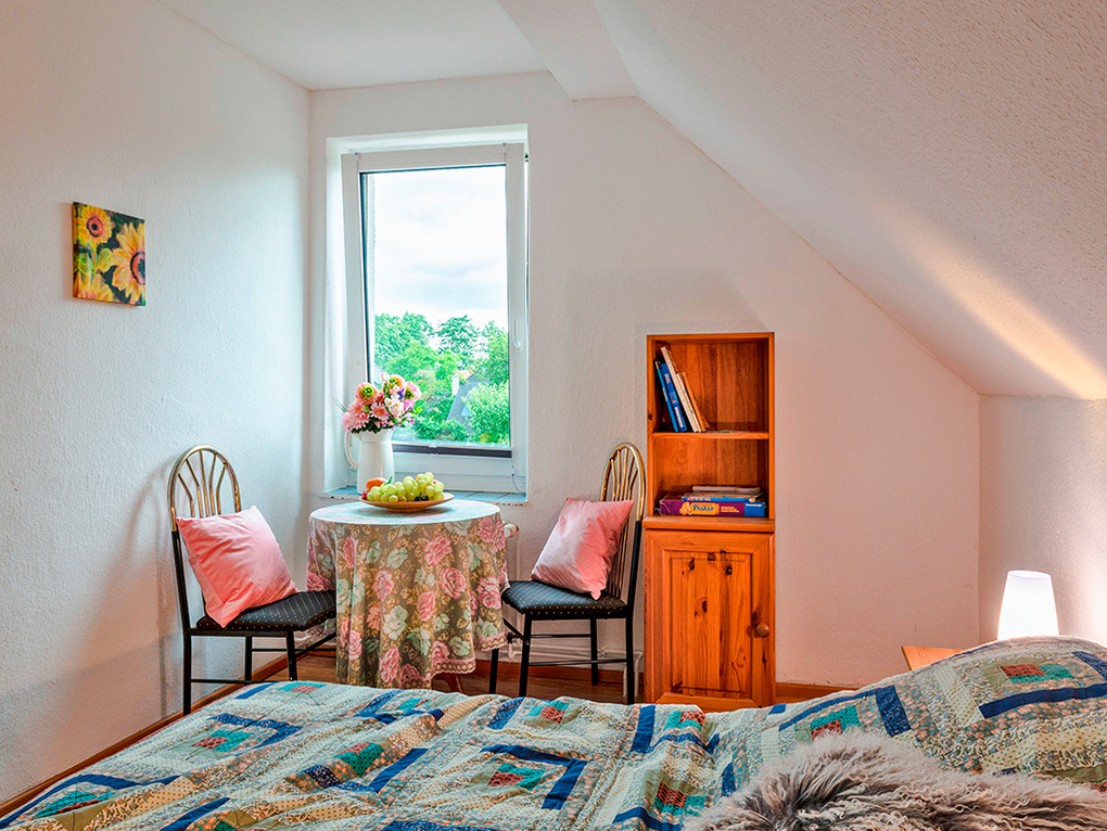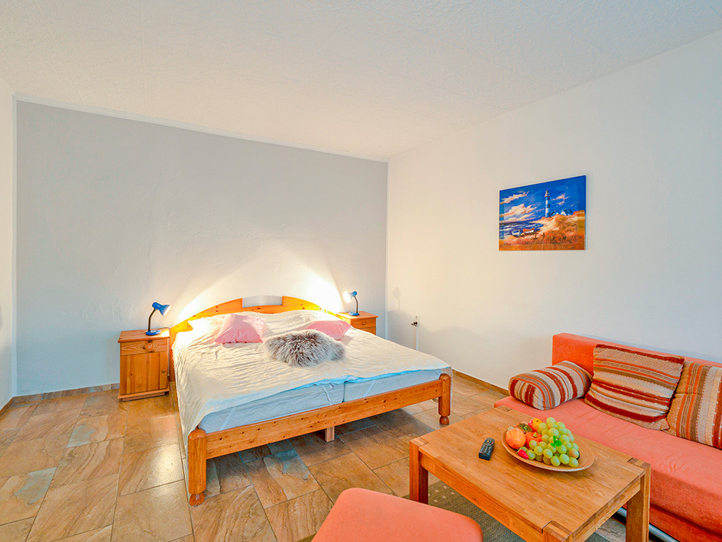 D 67.76 Wohnung 1-4 Pers.: 2 ½ -Zimmerwohnung mit 55 qm Wohnfläche über 2 Etagen. Parterre: Freundlicher Wohn-/Essraum mit Esstisch, Pantryküche (2-Plattenherd, Mikrowelle). Doppelzimmer mit Doppelbett, Sitzgarnitur, Sat-TV, Radio/CD. Bad/WC. Treppe in die 1. Etage (offen zum Flur): Doppelzimmer.
