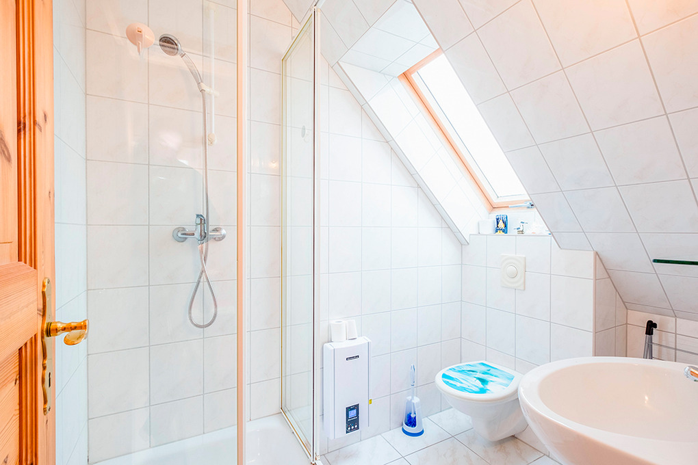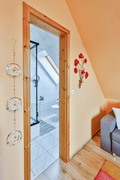 Haus: Schönes Einfamilienhaus mit 2 Ferienwohnungen in der 1. Etage. Freundliche Einrichtung. E-Heizung. Kostenloser Internetzugang über W-Lan. Terrasse mit Sitzmöbeln, Grill zur gemeinschaftlichen Nutzung. Vermieterwohnung im Parterre. 1 Pkw-Stellplatz/Fewo am Haus.