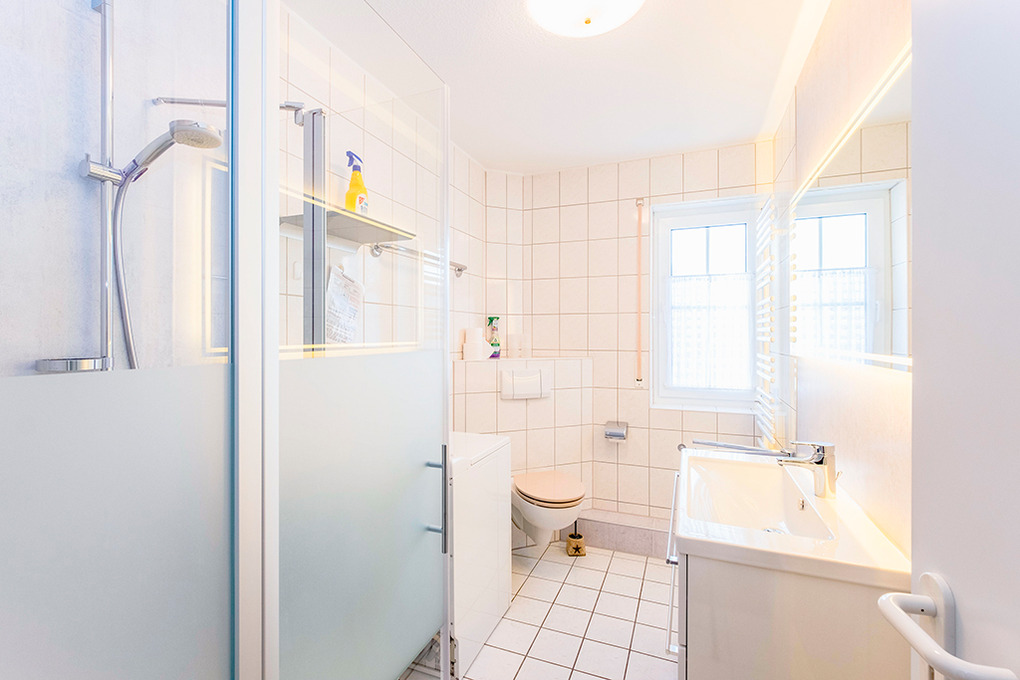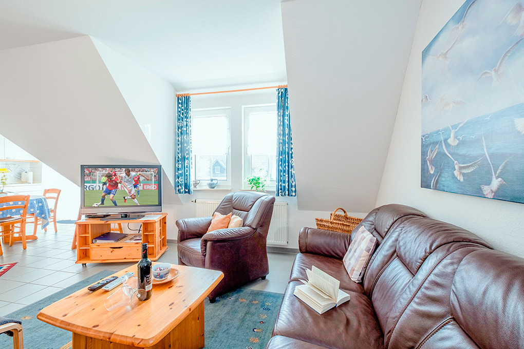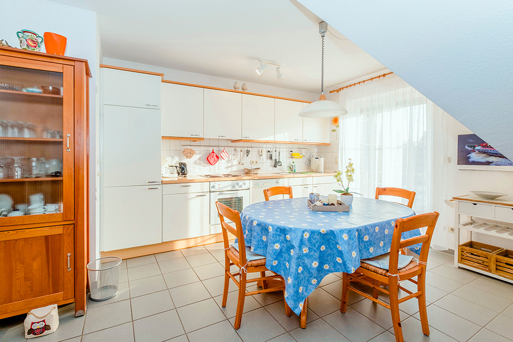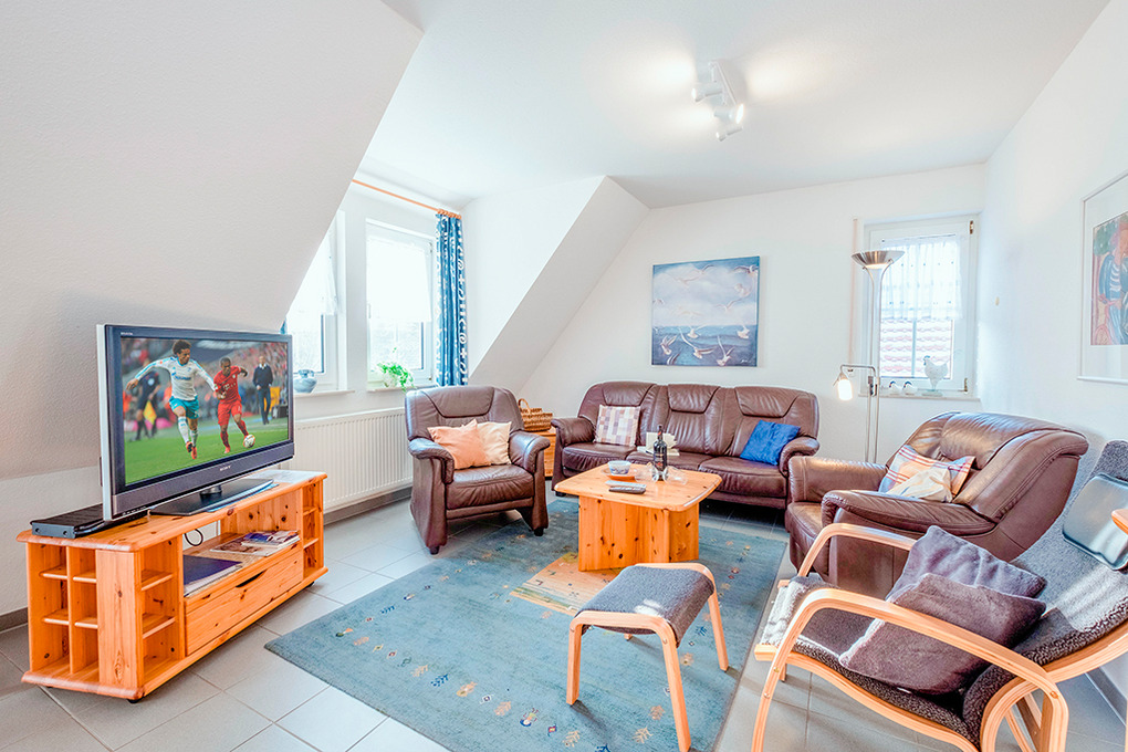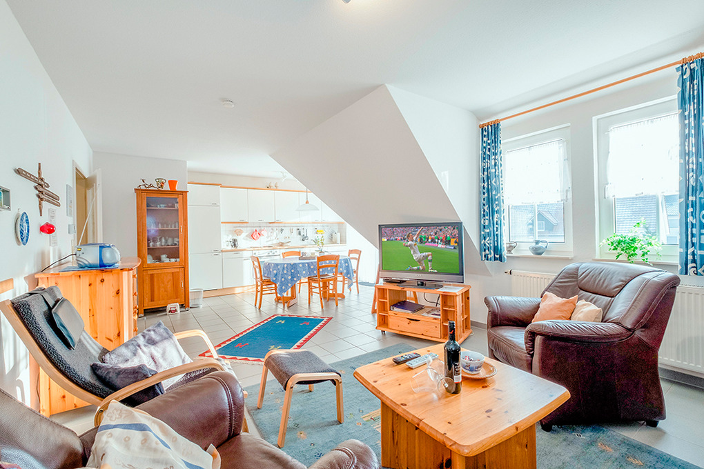 D 67.1004 Wohnung 1-4 Pers.: 3-Zimmerwohnung mit 65 qm Wohnfläche, 1. Etage. Wohn-/Essraum mit Sitzgarnitur, Flachbild-Sat-TV, Esstisch, Küchenzeile (Backofen, Spülmaschine). Doppelzimmer. 2-Bettzimmer. Bad: Du, Wb, WC, Waschmaschine. Balkon mit Sitzmöbeln.