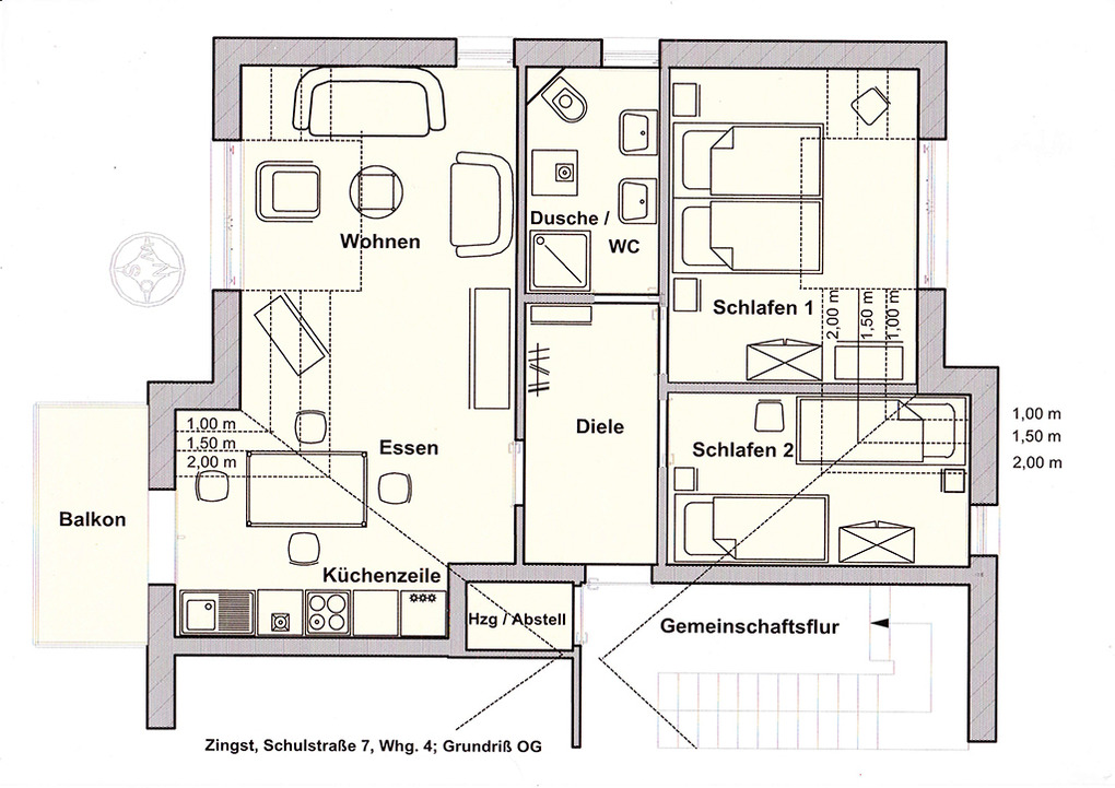 Ort: Zingst. Ruhige Lage in einer Wohnsiedlung. Ortsmitte 400 m. Idyllischer Hafen am Bodden 500 m. Ostseestrand 900 m.
