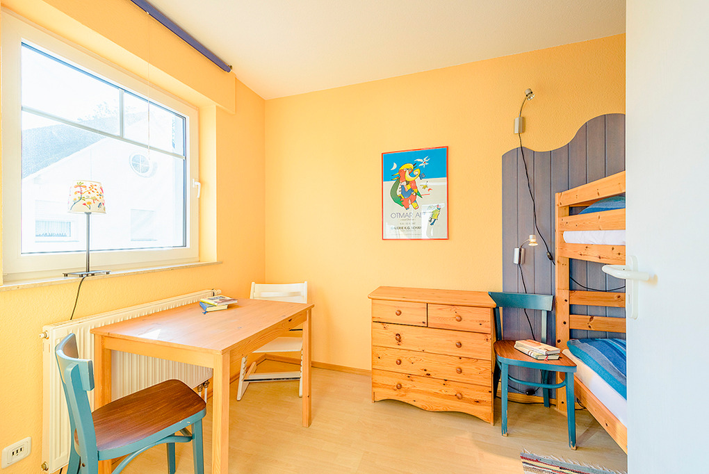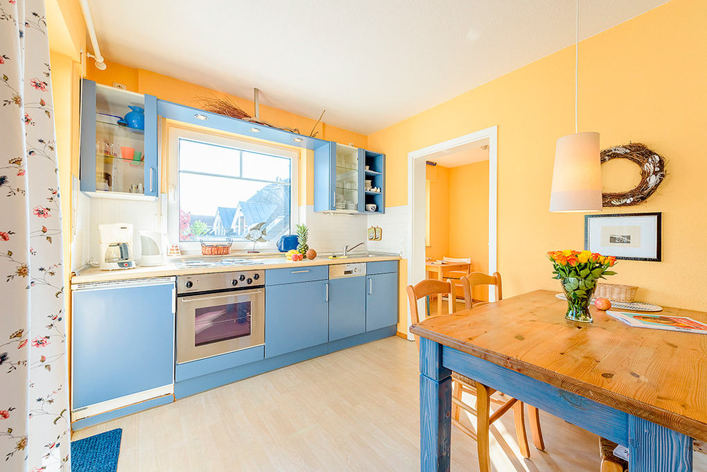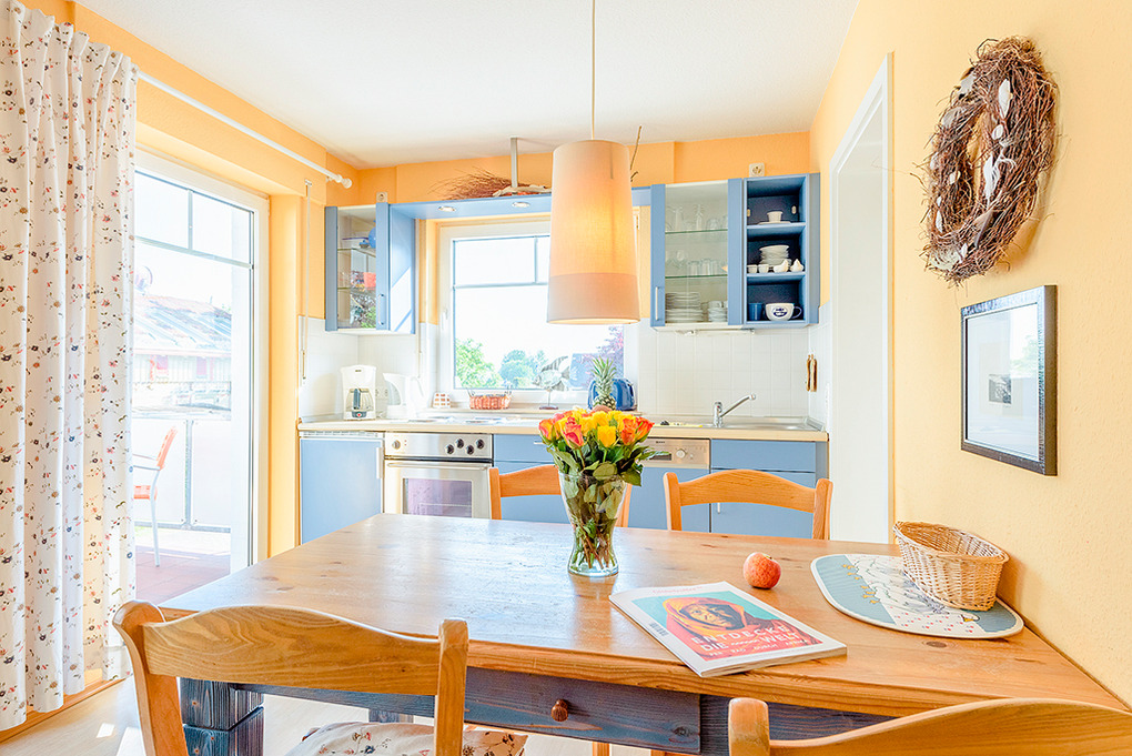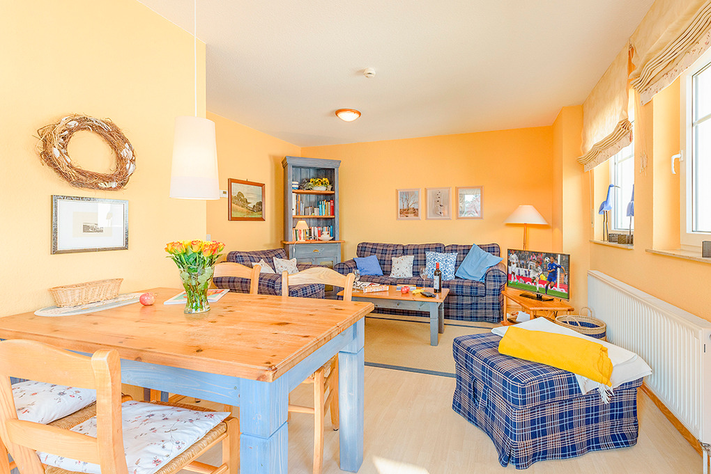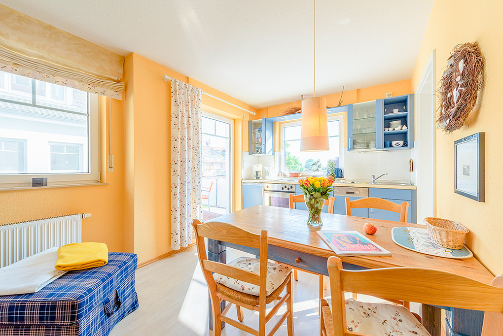 D 67.1613 Wohnung 1-4 Pers.: 3-Zimmerwohnung mit 60 qm Wohnfläche, 1. Etage. Wohn-/Essraum mit Couchgarnitur, Sat-TV, Esstisch, moderner Küchenzeile (Backofen, Spülmaschine). Doppelzimmer. 2-Bettzimmer mit Etagenbett. Bad: Du, Wb, WC, Waschmaschine. Balkon.