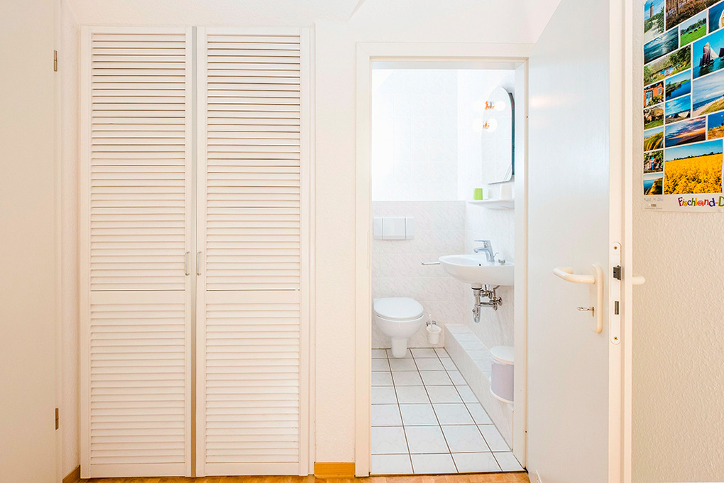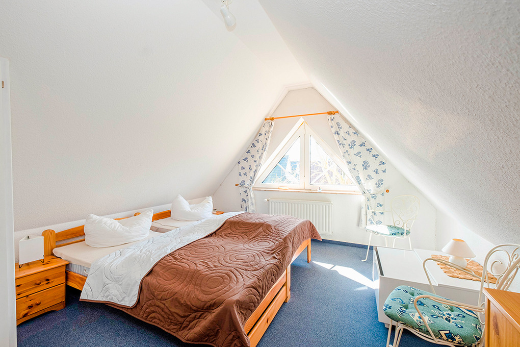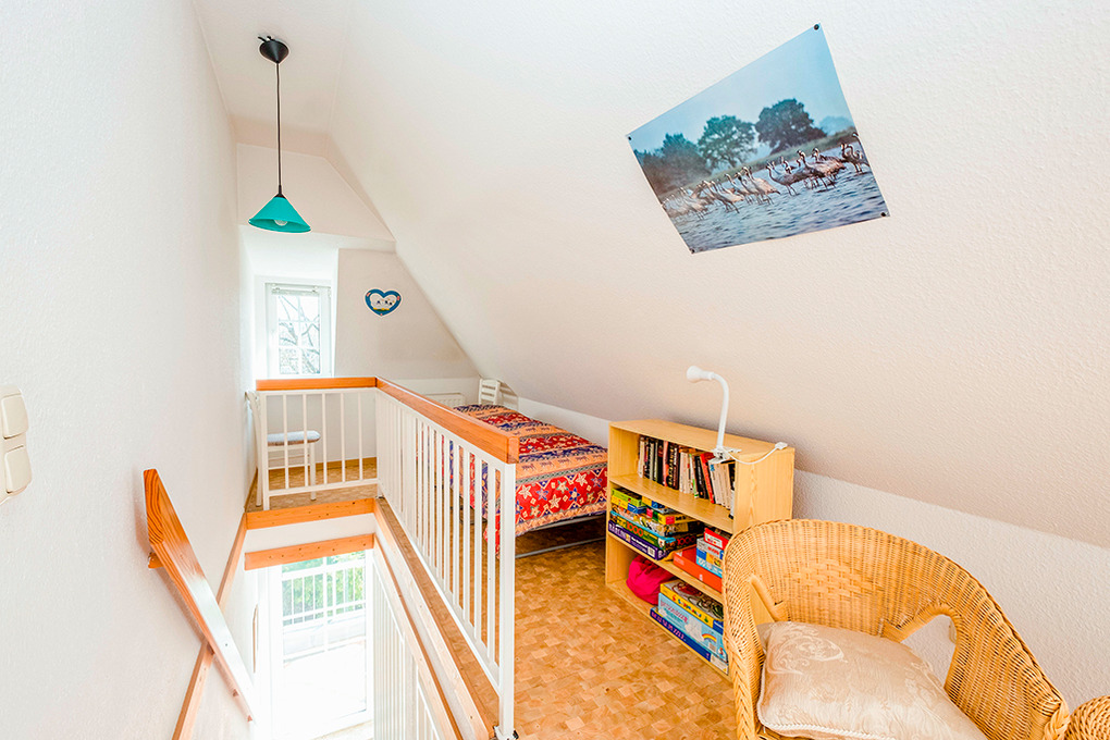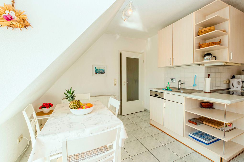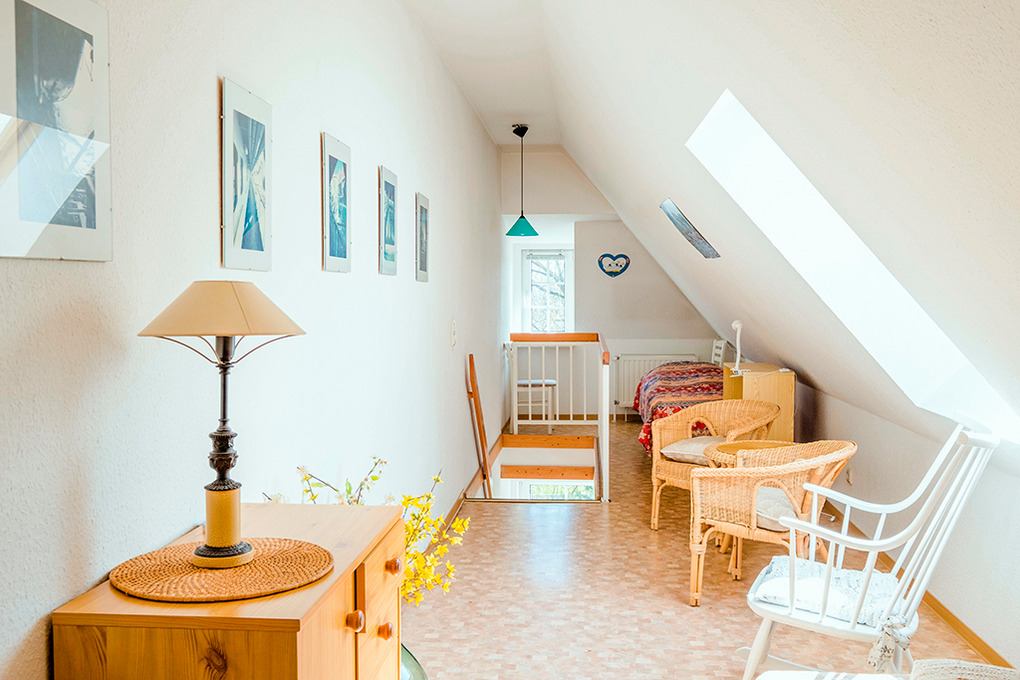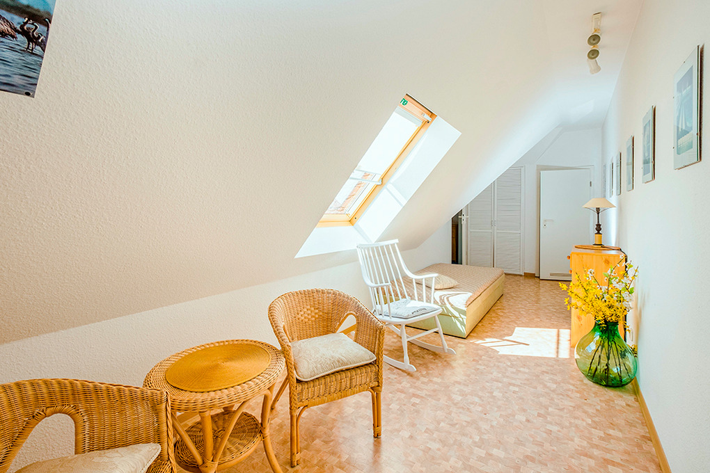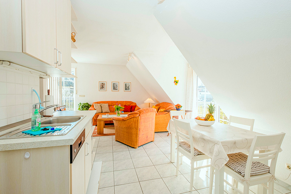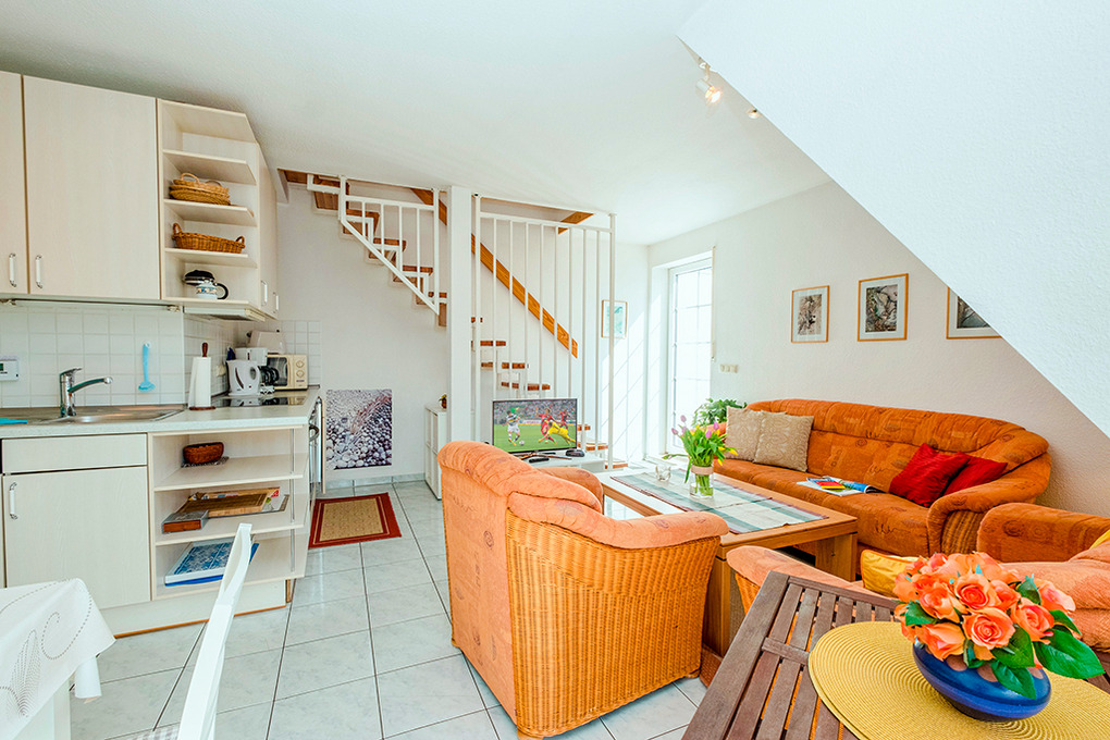 D 67.1807 Wohnung 1-4 Pers.: 3-Zimmer-Nichtraucherwohnung mit 75 qm Wohnfläche über 2 Etagen, 1. Etage. Wohn-/Essraum mit Sitzgarnitur, Sat-TV, kostenloser Internetanschluss über W-Lan, Esstisch, Küchenzeile (Backofen, Mikrowelle, Spülmaschine). Doppelzimmer. Bad/WC. Treppe ins ausgebaute Dachgeschoss: 2-Bettzimmer. Galerie mit Sitzecke offen zum Wohnraum . Separates WC. 2 Balkone.