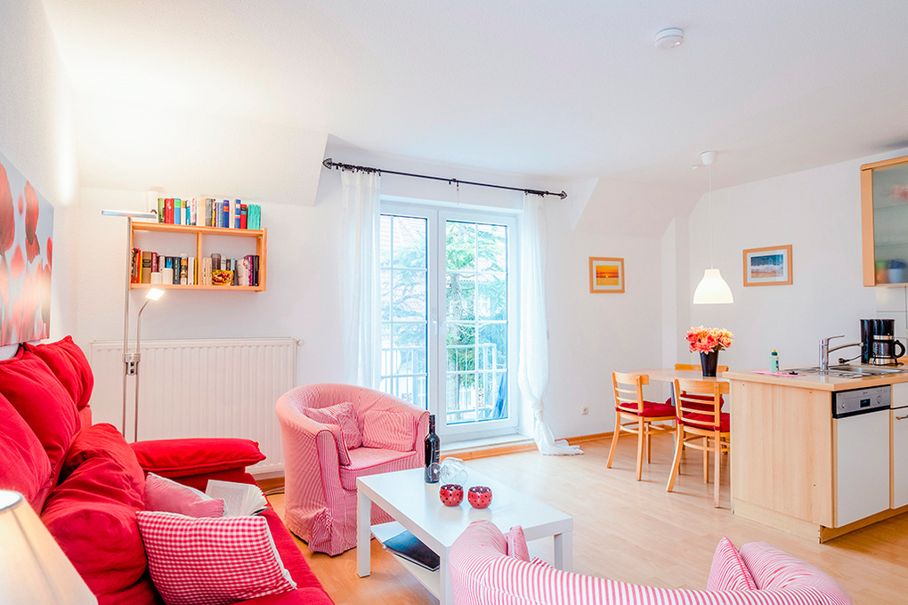 Haus: Schöne, moderne Reihenhäuser mit jeweils 5 Ferienwohnungen. Freundliche, geschmackvolle Einrichtung. Jede Fewo mit Sat-TV, Spülmaschine, meist auch mit Waschmaschine. Kostenloser Internetzugang über W-Lan. Zentralheizung. Größtenteils mit Terrasse oder Balkon. Fahrradschuppen. 1 Pkw-Stellplatz /Fewo.