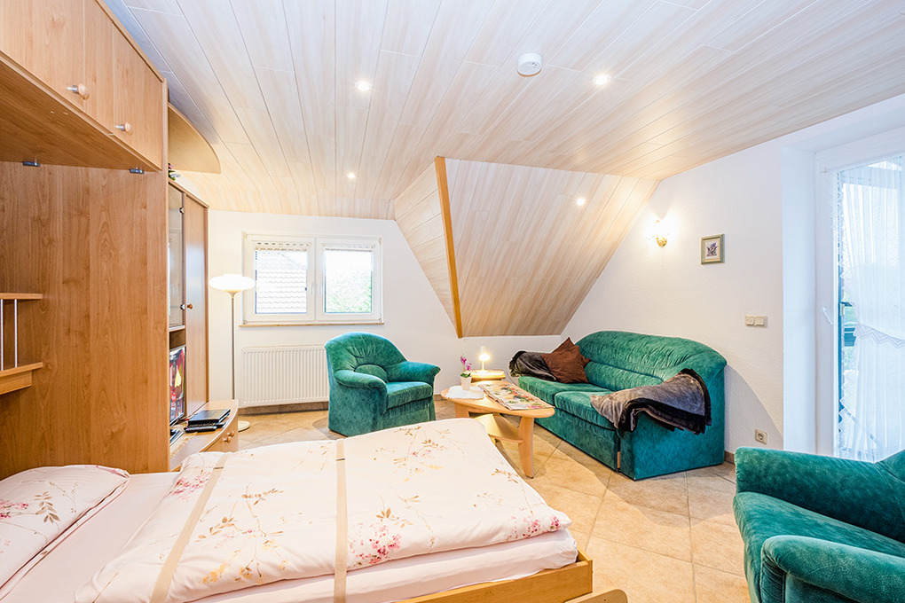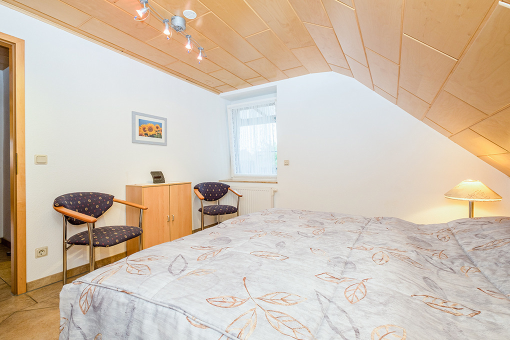 D 46.64A Wohnung 2-3 Pers.: Großzügige 2 1/2-Zimmerwohnung mit 58 qm Wohnfläche, 1. Etage. Wohn-/Schlafraum mit Couchgarnitur, Sat-TV, Schrankbett (1 Pers.). Wohnküche mit Esstisch, gut ausgestatteter Küchenzeile (Backofen, Mikrowelle, Spülmaschine). Doppelzimmer. Bad/WC. Überdachter, verglaster Balkon mit Sitzmöbeln.