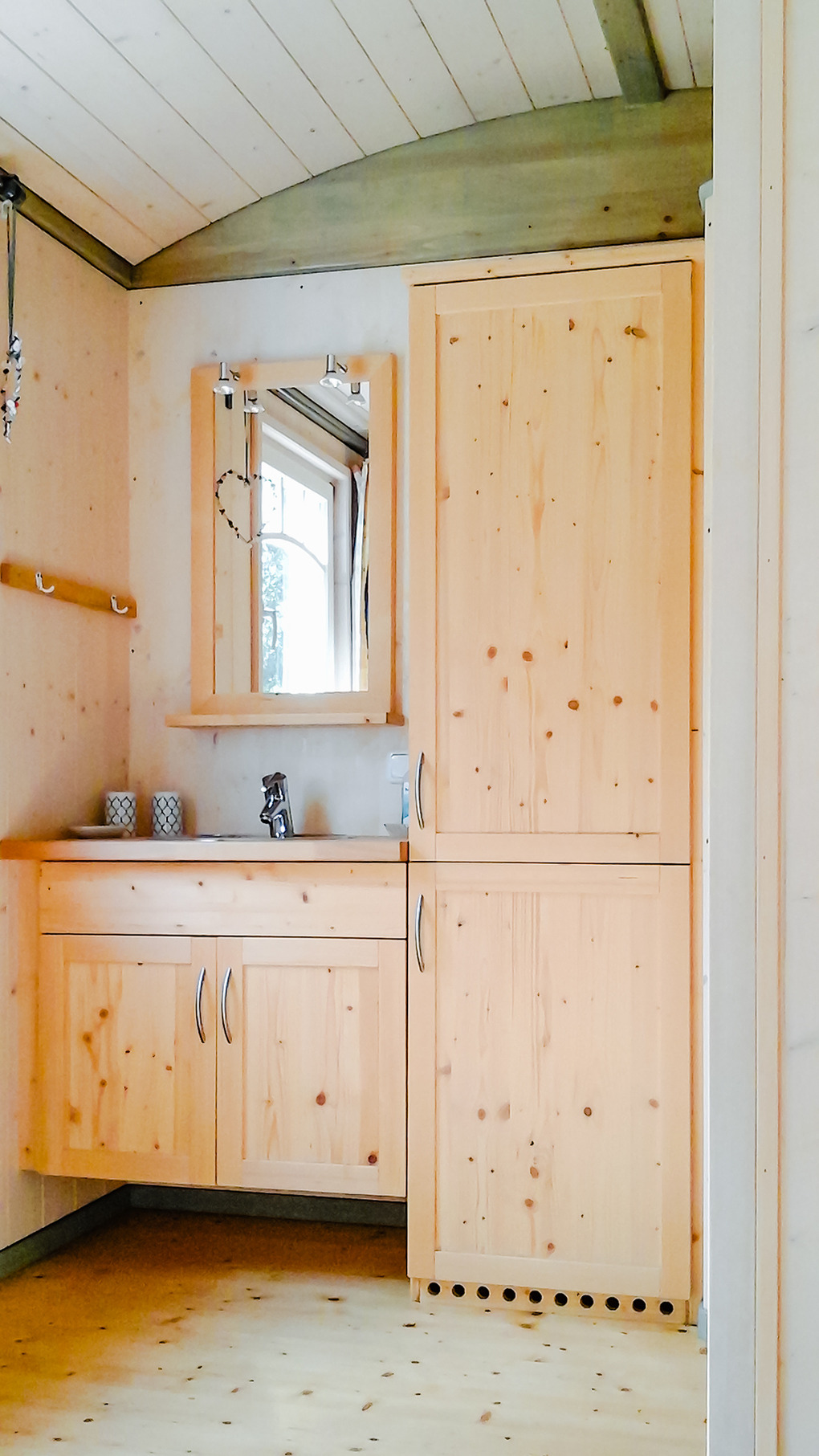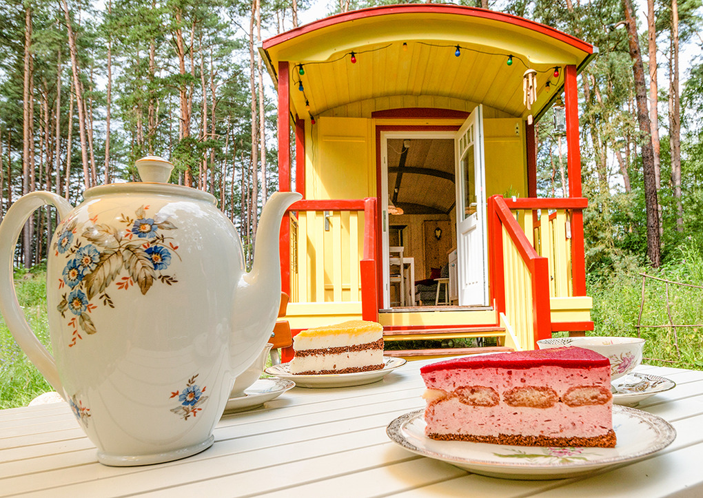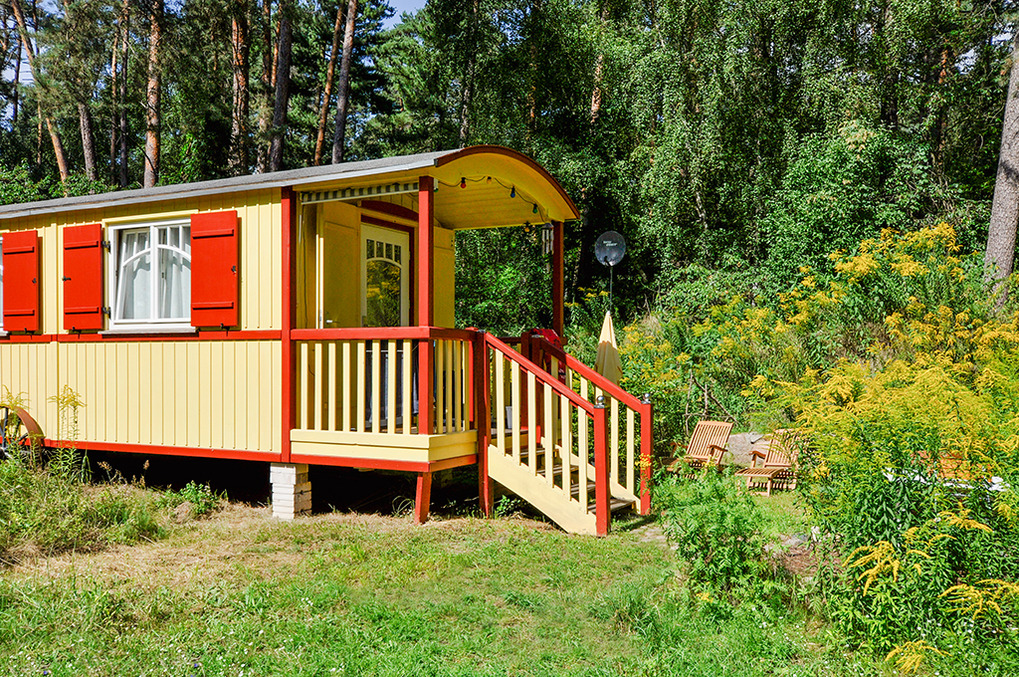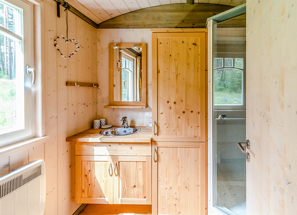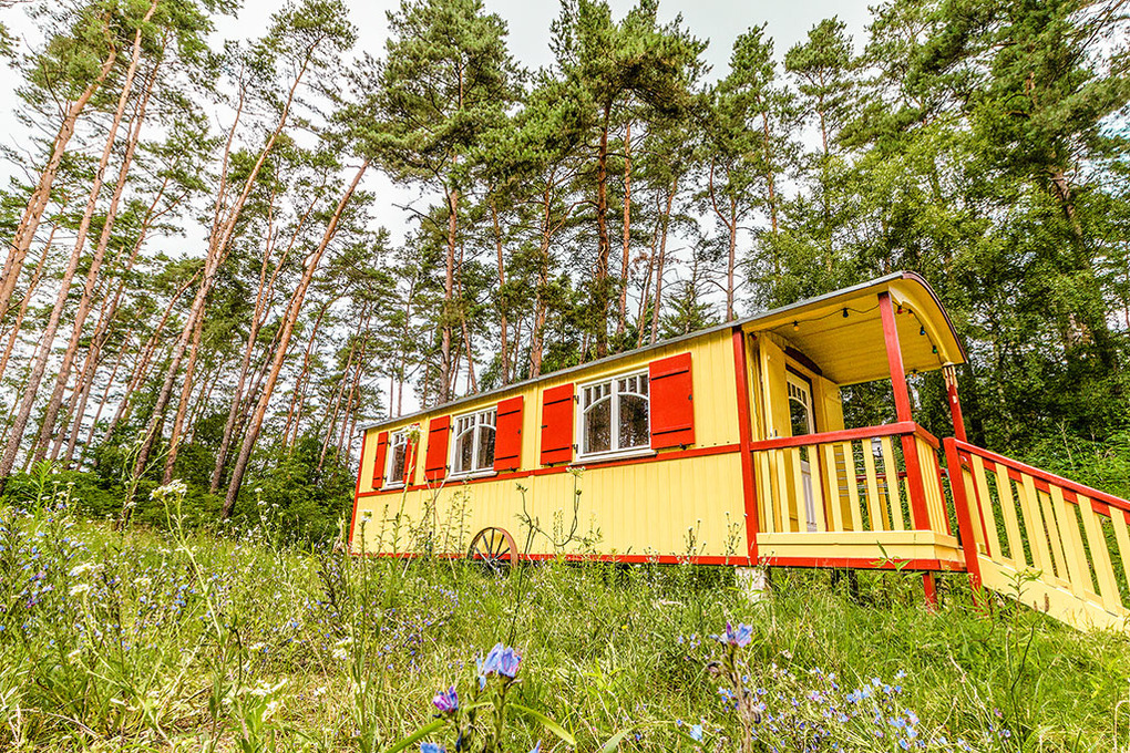 D 54.156 Zirkuswagen 2 Pers.: Neu umgebauter authentischer Zirkuswagen auf Rädern. Der Wagen hat ein rundes Dach, einen kleinen Balkon und ist hell und freundlich eingerichtet und mit allem Komfort ausgestattet. Origineller Wohn-/Schlafraum mit schönem Holzdielenboden, Esstisch mit Sitzbank und Stühlen, Schlafsofa (140 x 200 m) und TV. Küchenzeile mit Gasherd, Kühlschrank und Spüle. Das Badezimmer bietet Dusche, Wb, WC und ist ganz normal an die Kanalisation angeschlossen. Gasheizung. Vom Balkon aus genießen Sie einen traumhaften Blick über die Lichtung bis zum Waldrand.
