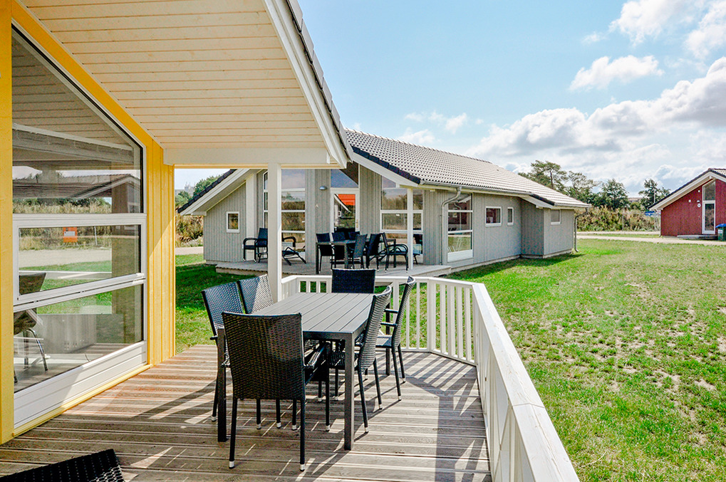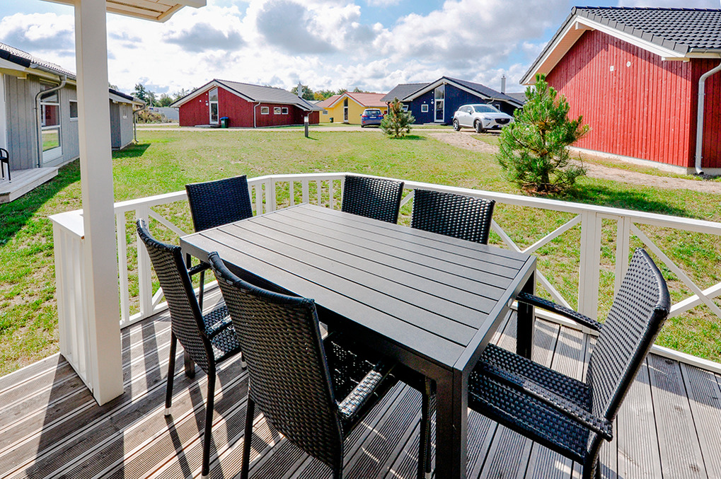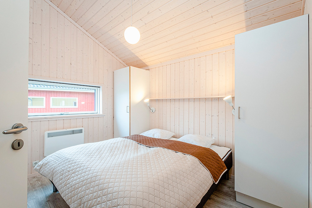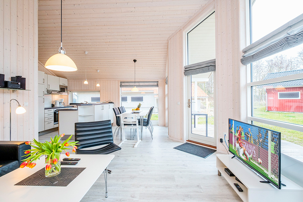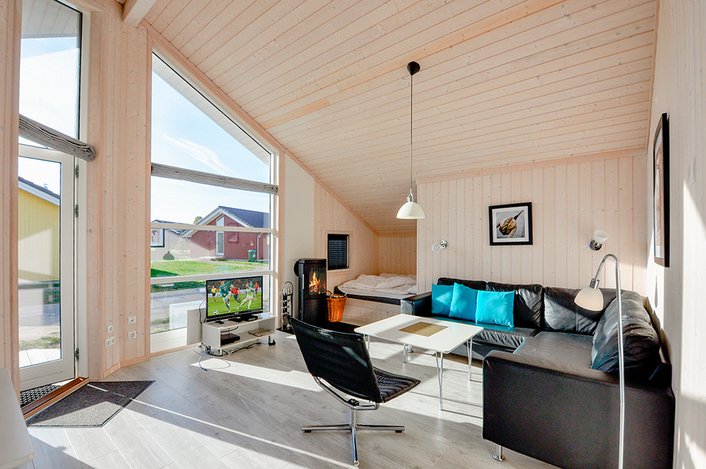 Haus: Gepflegtes Ferienresort mit farbenfrohen skandinavischen Ferienhäusern. Alle Ferienhäuser mit Sauna und Kaminofen. Helle, bis zum Dachgiebel ausgebaute Wohn-/Essbereiche mit großen Fensterfronten. Ansprechende Einrichtung, moderne Komfortausstattung. Internetzugang für bis zu 3 Geräte über W-Lan, Flachbild-Sat-TV, DVD, Radio/CD. Bäder mit Fußbodenheizung, Haarfön, Waschmaschine/Trockner, meist Whirlpool. Elektroheizung. Nichtraucherhäuser. Teilüberdachte Holzterrasse mit Sitz- und Liegemöbeln, Grill. Pkw-Stellplatz am Haus, weitere Stellplätze bei der Rezeption (je nach Verfügbarkeit).