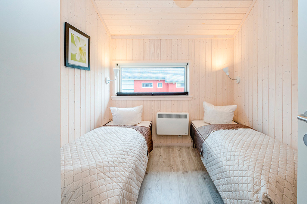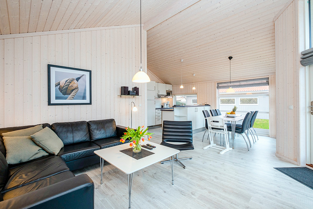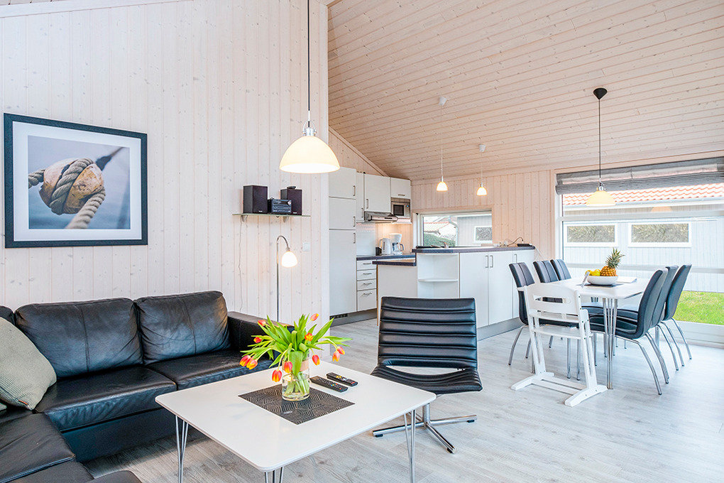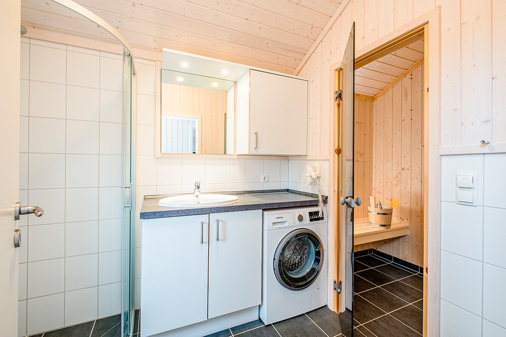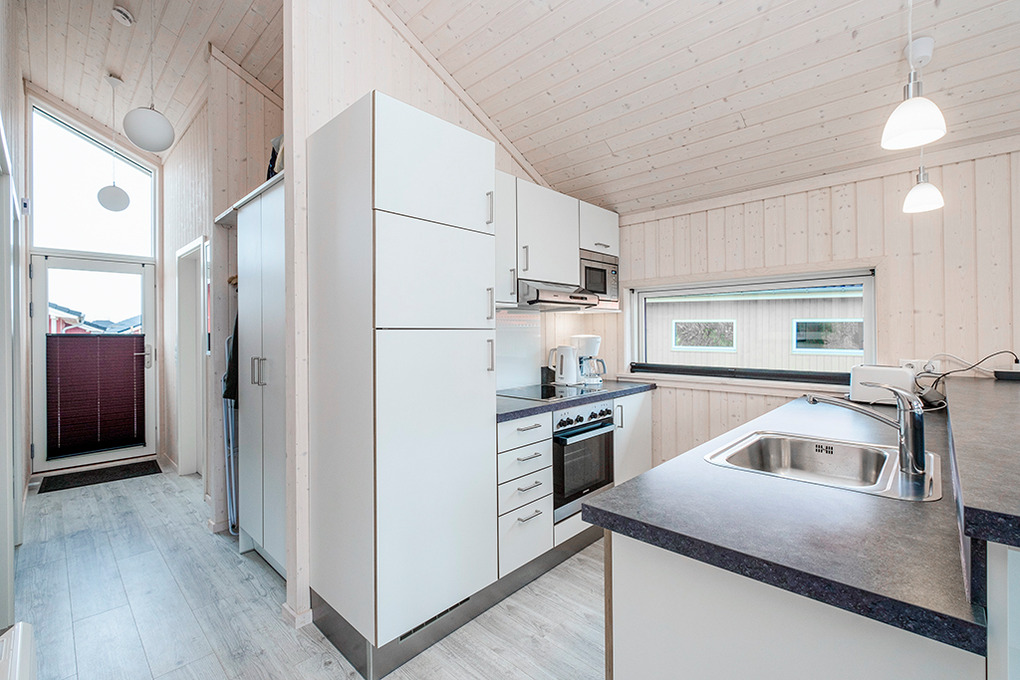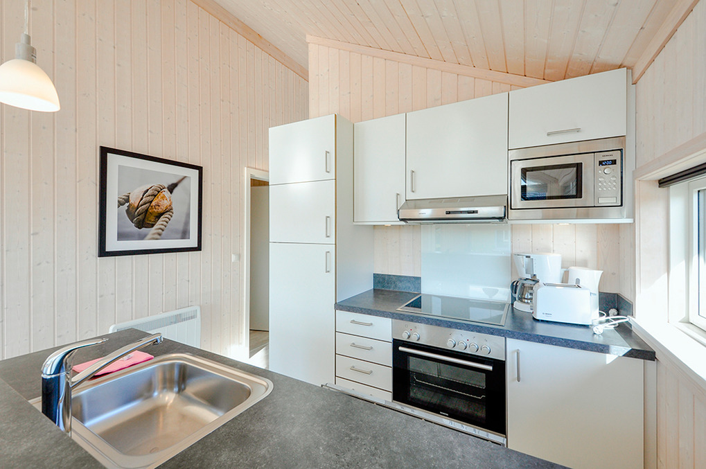 Haus: Gepflegtes Ferienresort mit farbenfrohen skandinavischen Ferienhäusern. Alle Ferienhäuser mit Sauna und Kaminofen. Helle, bis zum Dachgiebel ausgebaute Wohn-/Essbereiche mit großen Fensterfronten. Ansprechende Einrichtung, moderne Komfortausstattung. Internetzugang für bis zu 3 Geräte über W-Lan, Flachbild-Sat-TV, DVD, Radio/CD. Bäder mit Fußbodenheizung, Haarfön, Waschmaschine/Trockner, meist Whirlpool. Elektroheizung. Nichtraucherhäuser. Teilüberdachte Holzterrasse mit Sitz- und Liegemöbeln, Grill. Pkw-Stellplatz am Haus, weitere Stellplätze bei der Rezeption (je nach Verfügbarkeit).