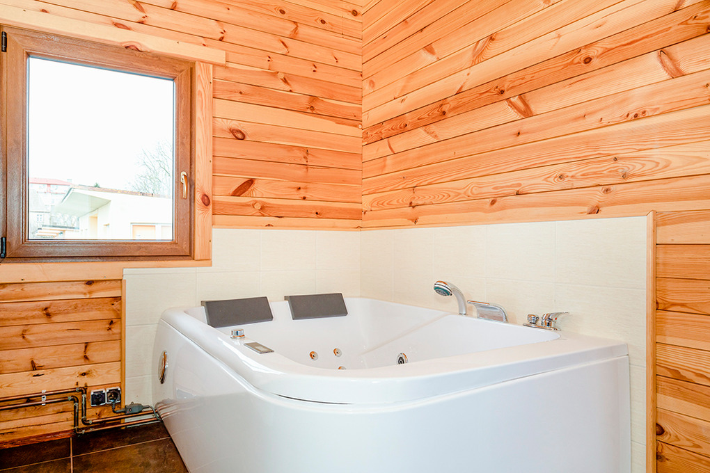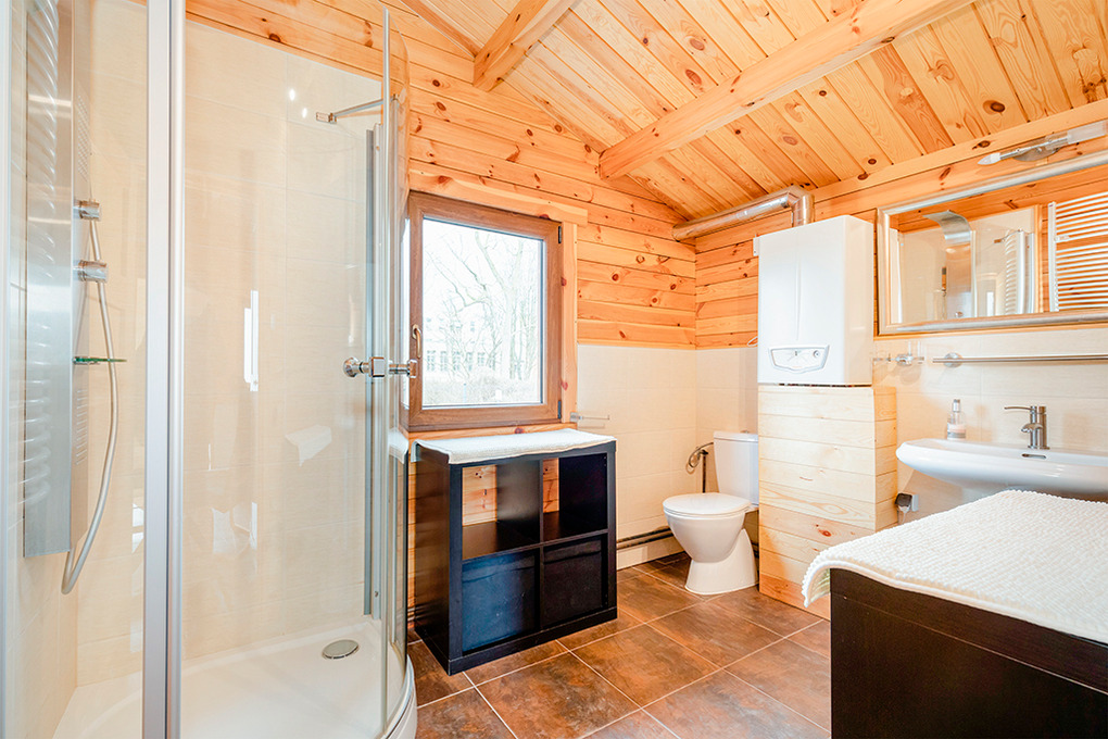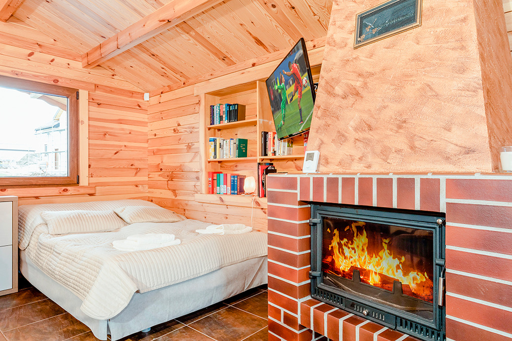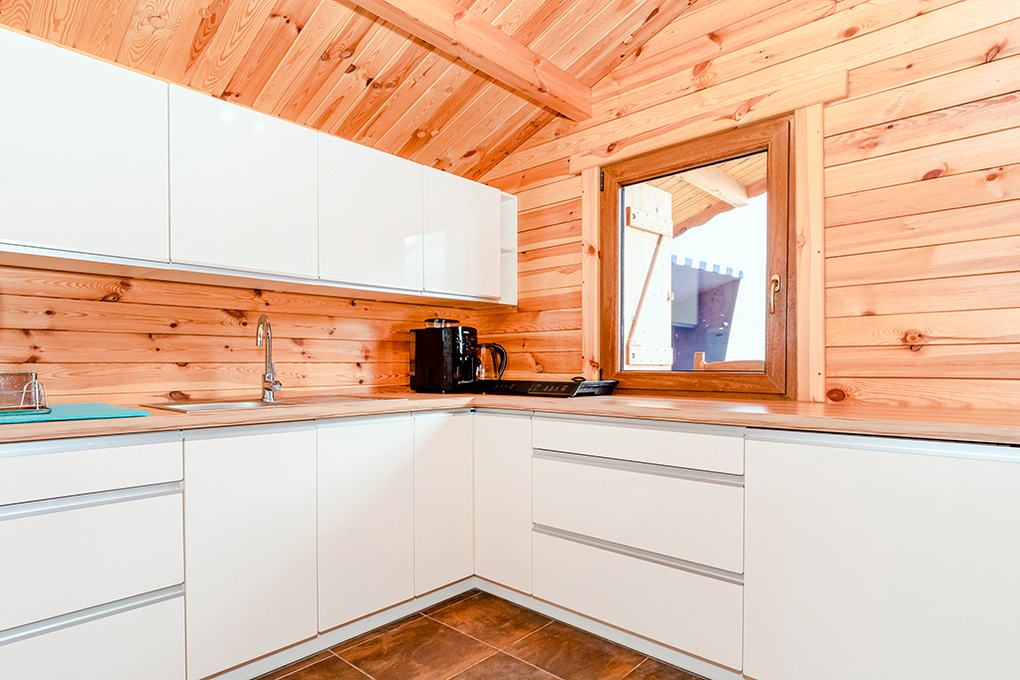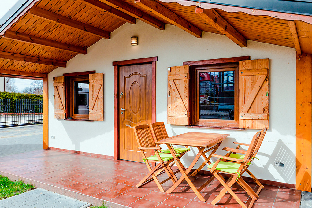PL 50.8 Ferienhaus 2 Pers.: Sehr komfortables, gemütliches 1 Zimmer-Reihenhaus mit 35 qm Wohnfläche. Wohn-/Essraum mit Kaminofen, 2 Schwingsesseln, Couchtisch, Flachbild Sat-TV mit deutschen Programmen, Schlafsofa für 2 Pers., moderner Küchenzeile (2 Platten Induktionsherd), Sauna, Whirlpool. Bad: Du, Wb, WC.