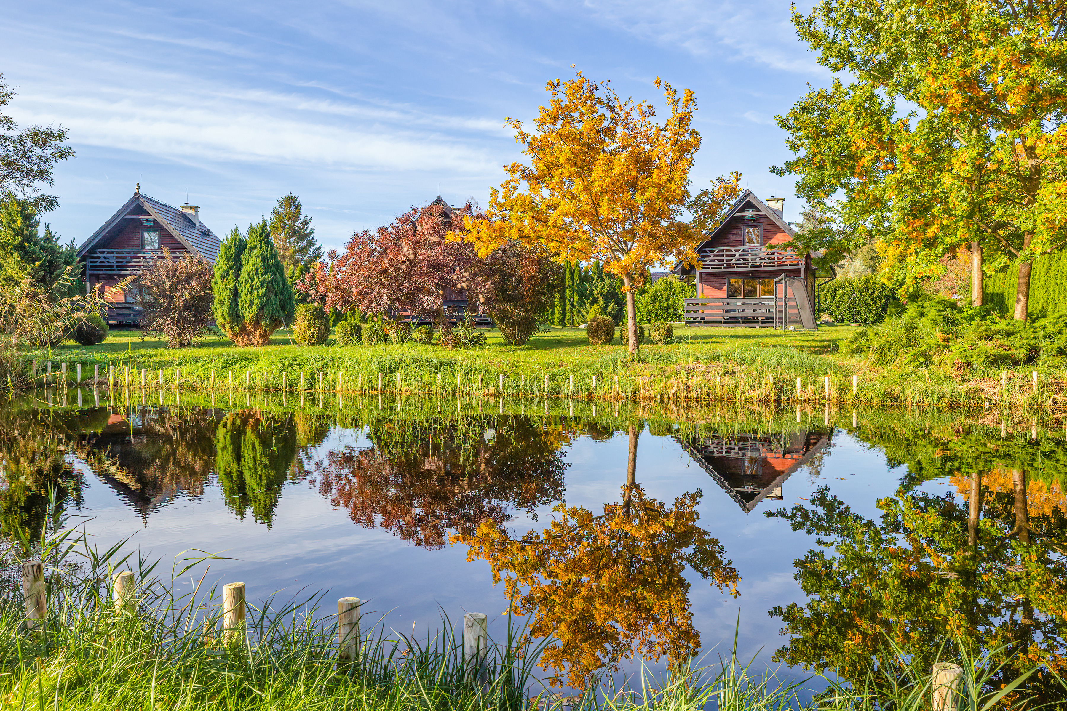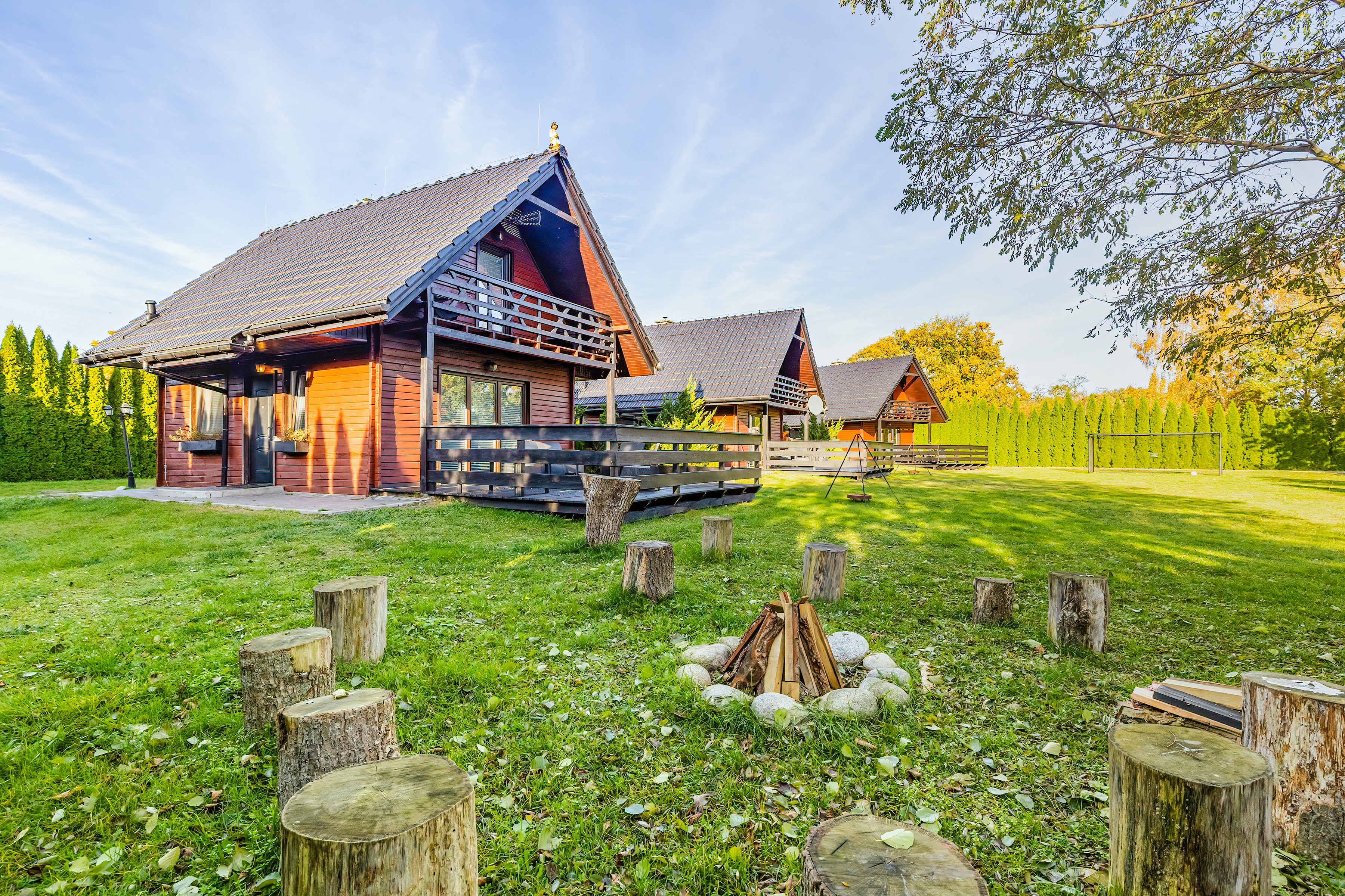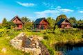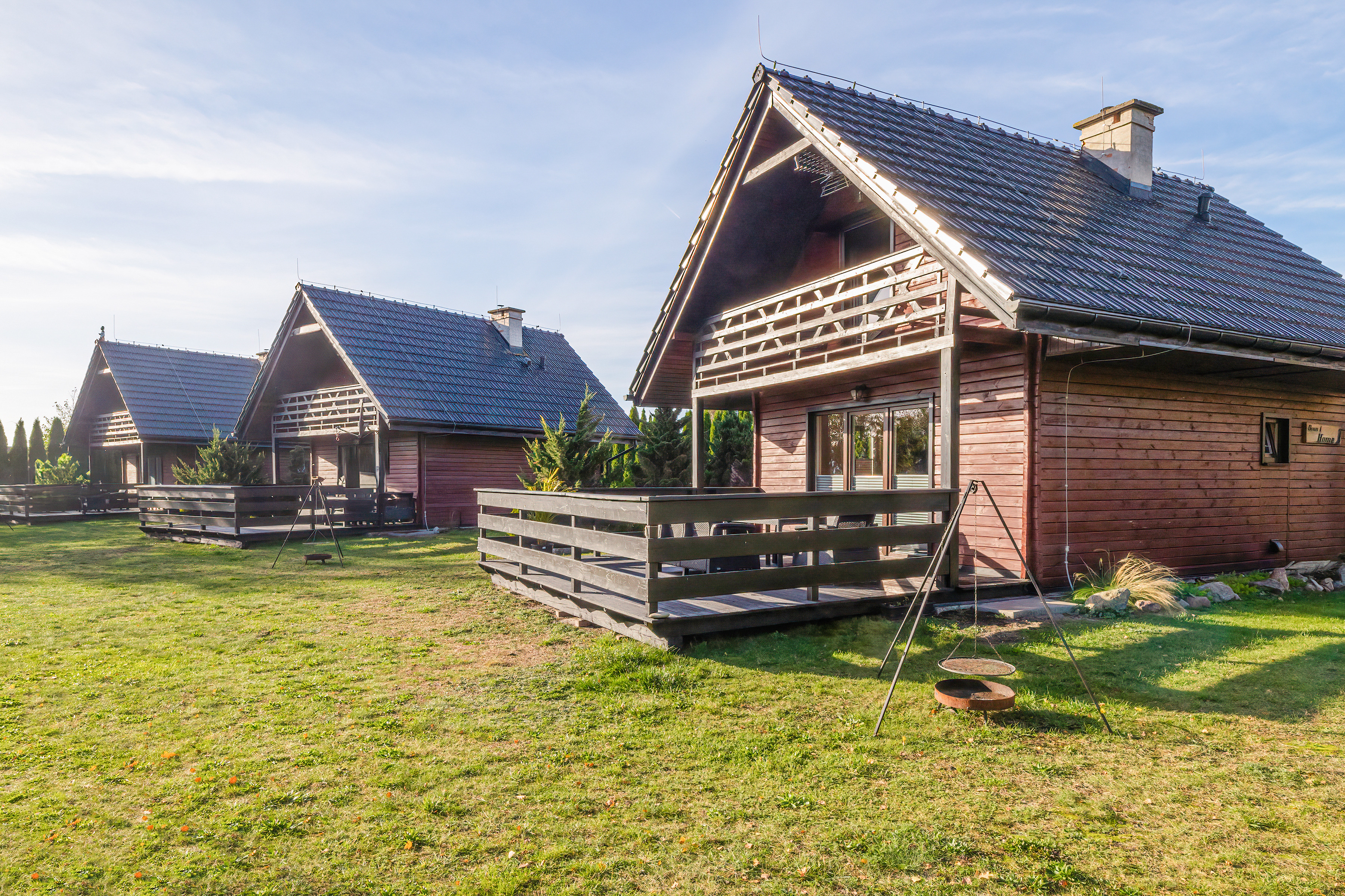 Haus: Kleine Ferienhausanlage mit drei schönen Ferienhäusern, 2014 erbaut. Idyllische Lage an einem schönen Teich auf einem großen Rasengrundstück (5.000 qm) zur gemeinschaftlichen Nutzung. Gemütliche Ferienhäuser mit freundlicher Einrichtung. Kostenloses Internet über WLAN. Zentralheizung und Warmwasser über Gastherme. Große Terrasse mit Sitzmöbeln. In der Anlage: Kinderspielplatz mit Trampolin, Rutsche, Piratenhäuschen. Parkplatz auf umzäuntem Grundstück.